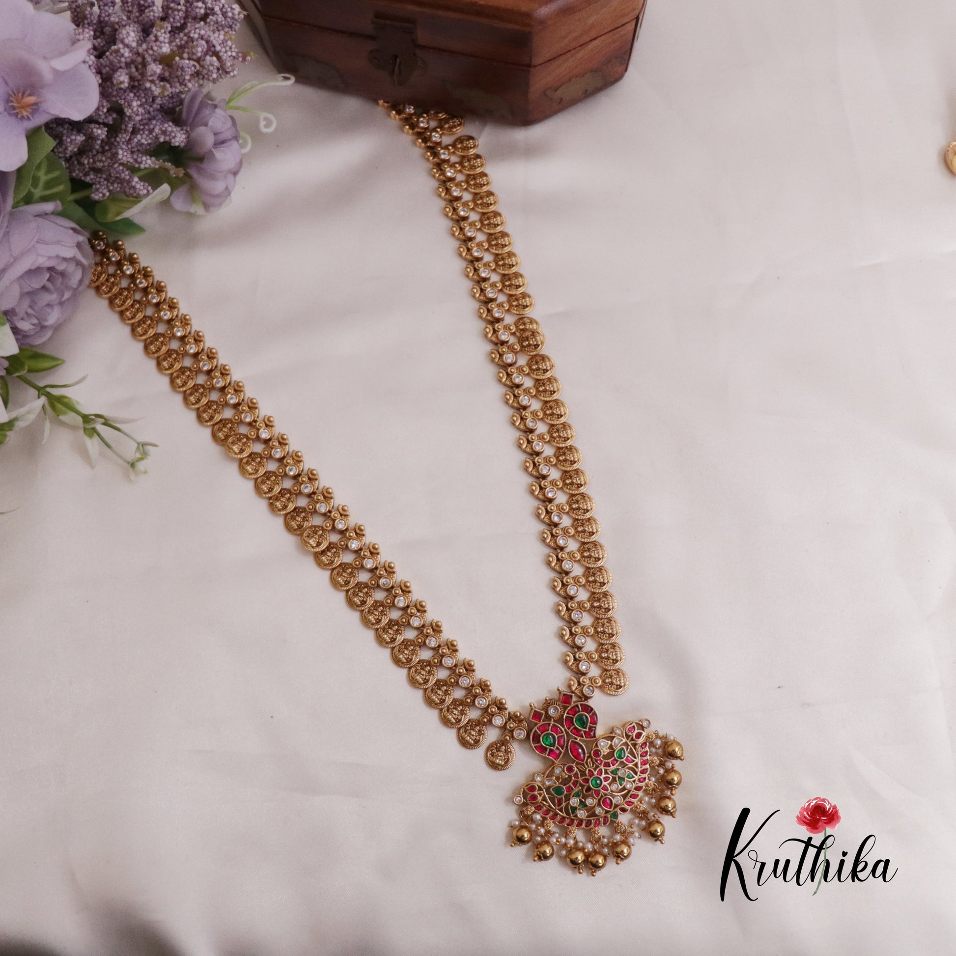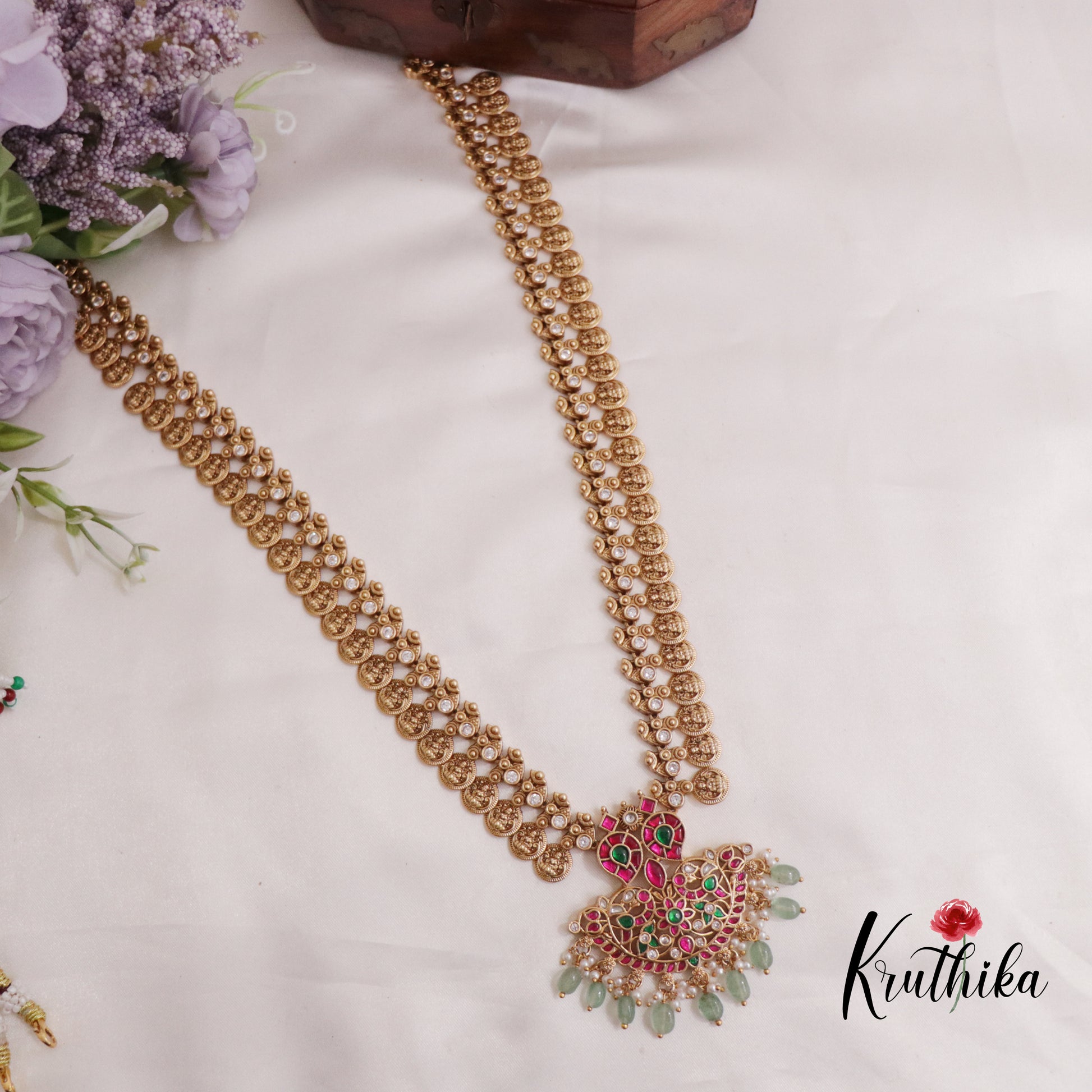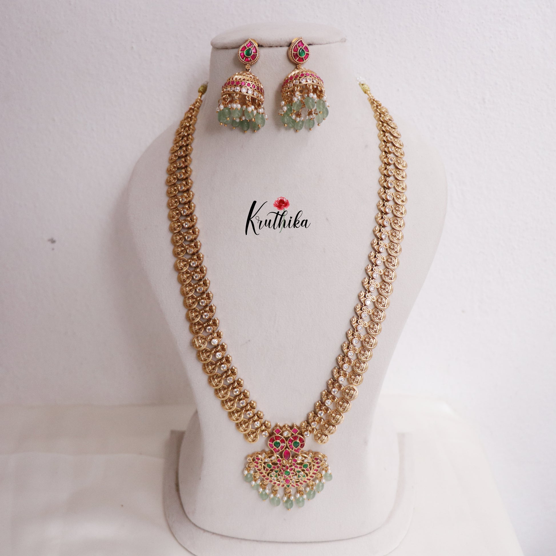Enhance your style with our stunning Elegant Jadau Peacock Kasu Haaram with Beads Drops paired perfectly with matching earrings. Crafted with high-quality stones & beads, this set combines timeless elegance with a modern touch. Ideal for special occasions or adding a touch of glamour to your look.