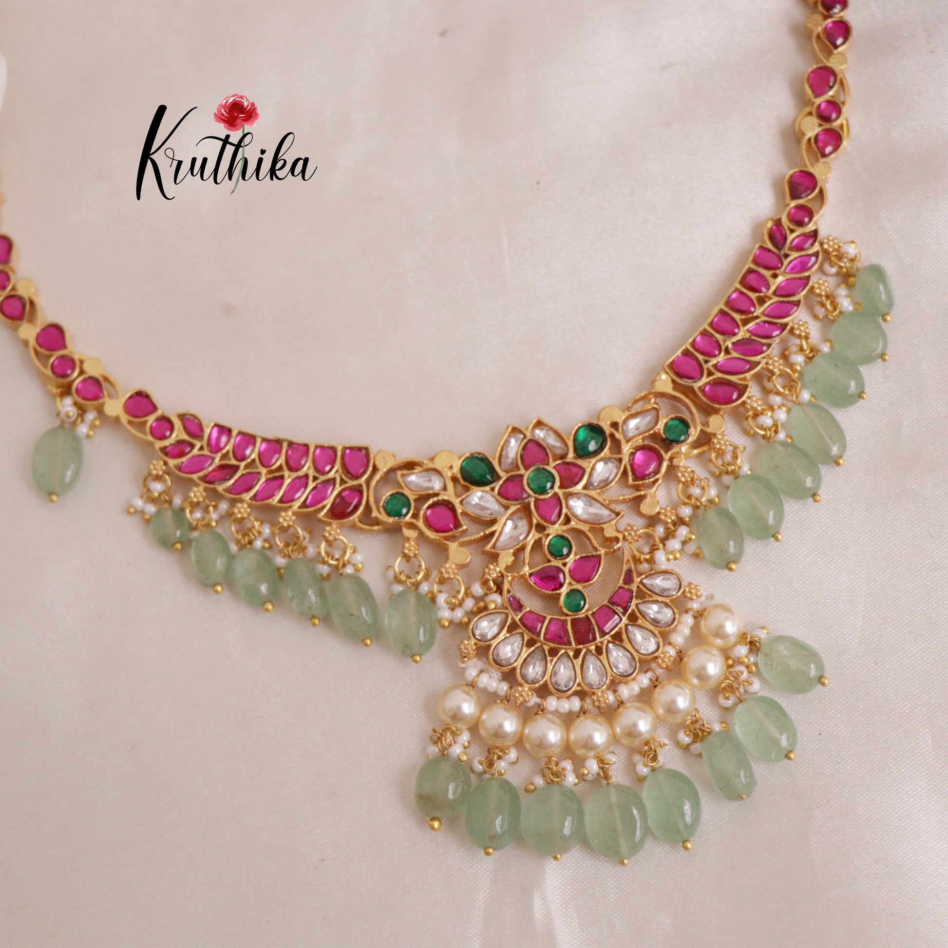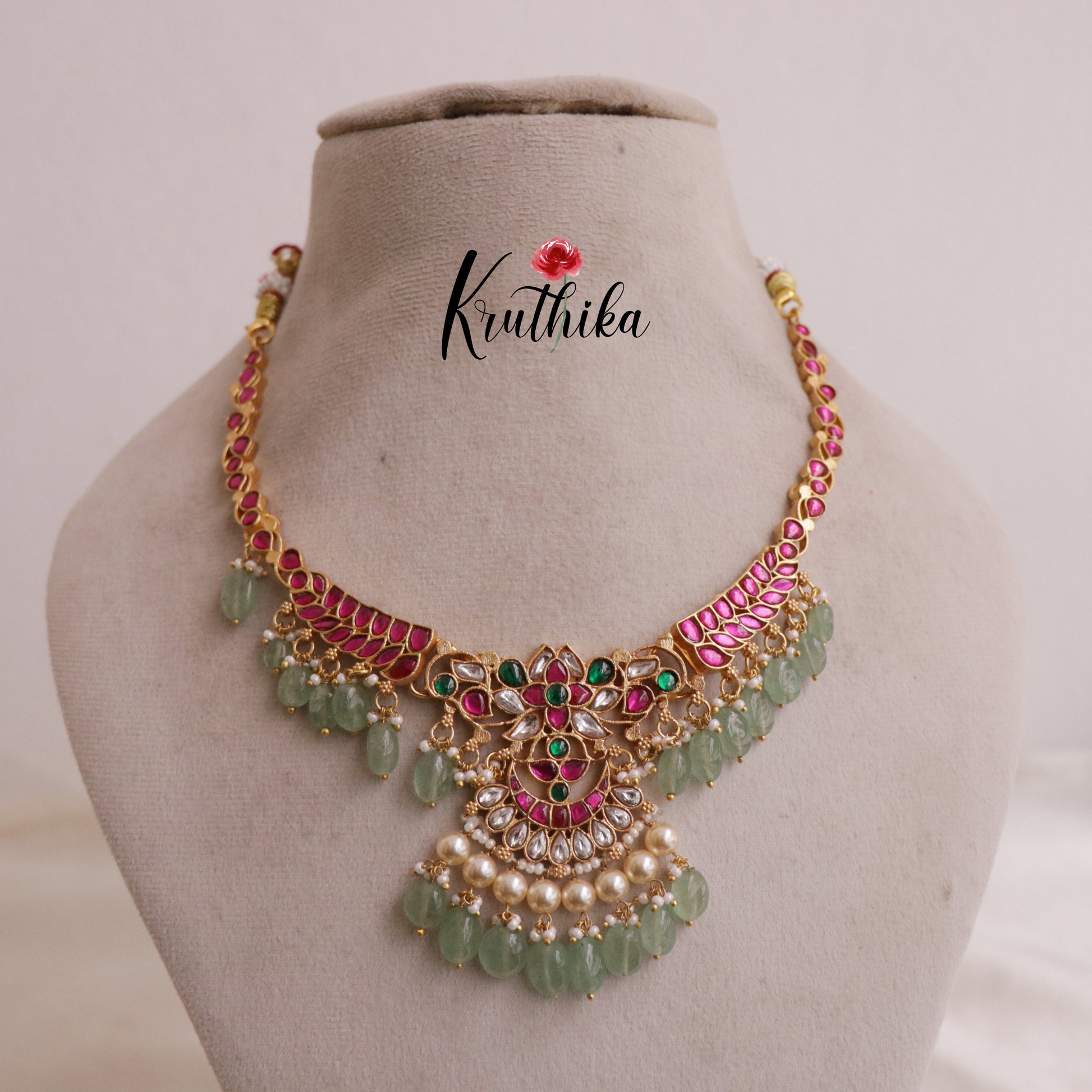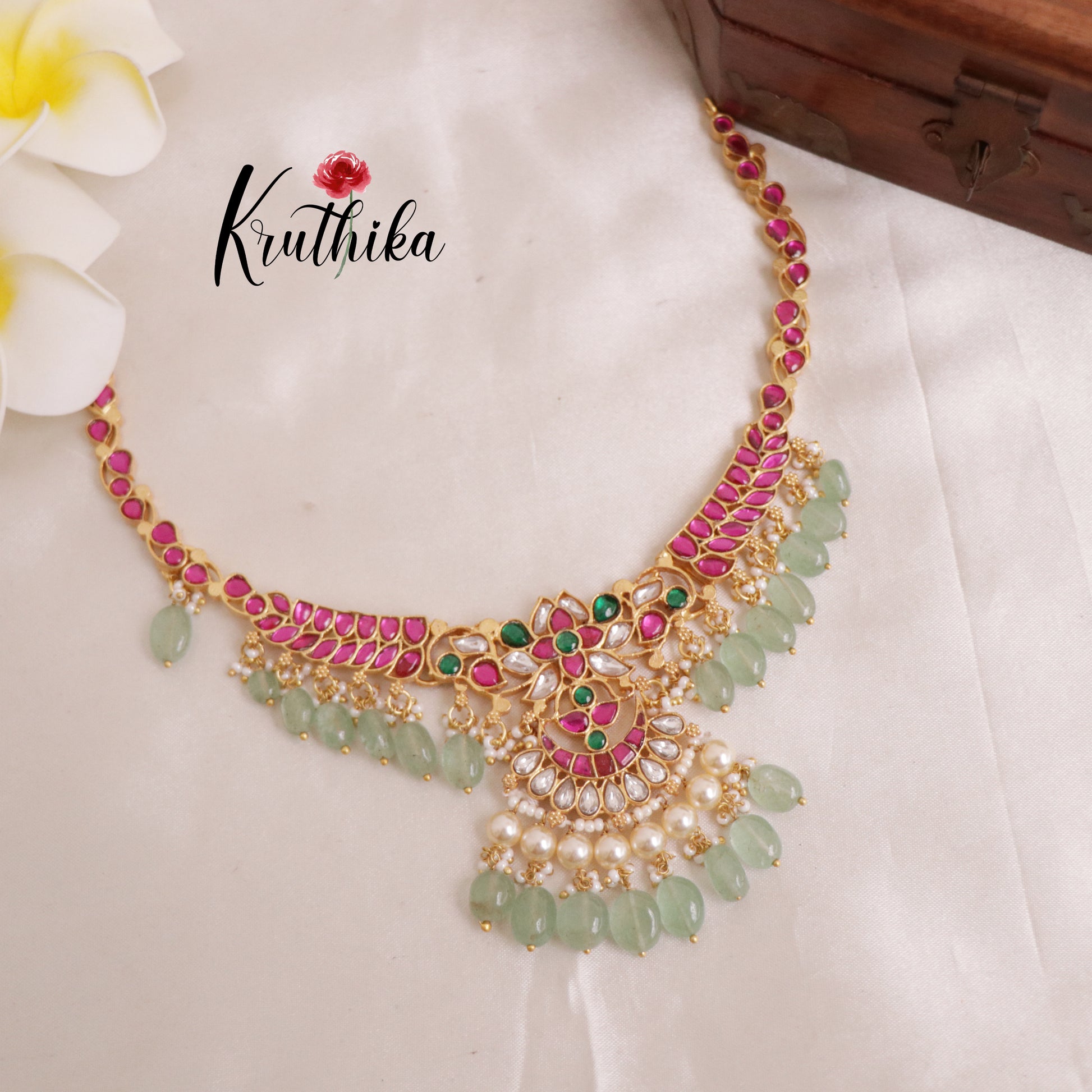 Enhance your style with our stunning, Elegant Temple Jadau Haram. Crafted with high-quality stones & beads, this set combines timeless elegance with a modern touch. Ideal for special occasions or adding a touch of glamour to your look.