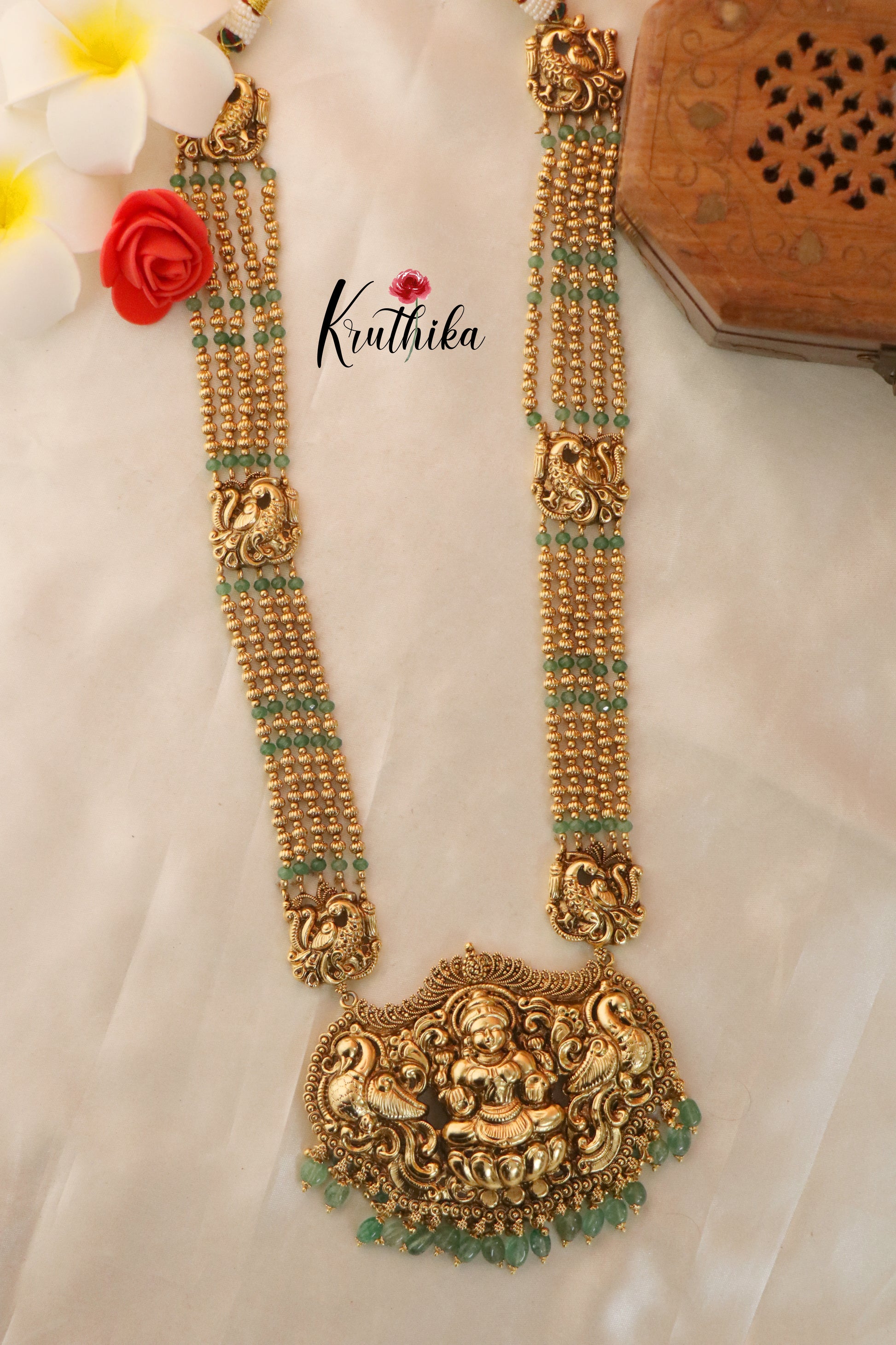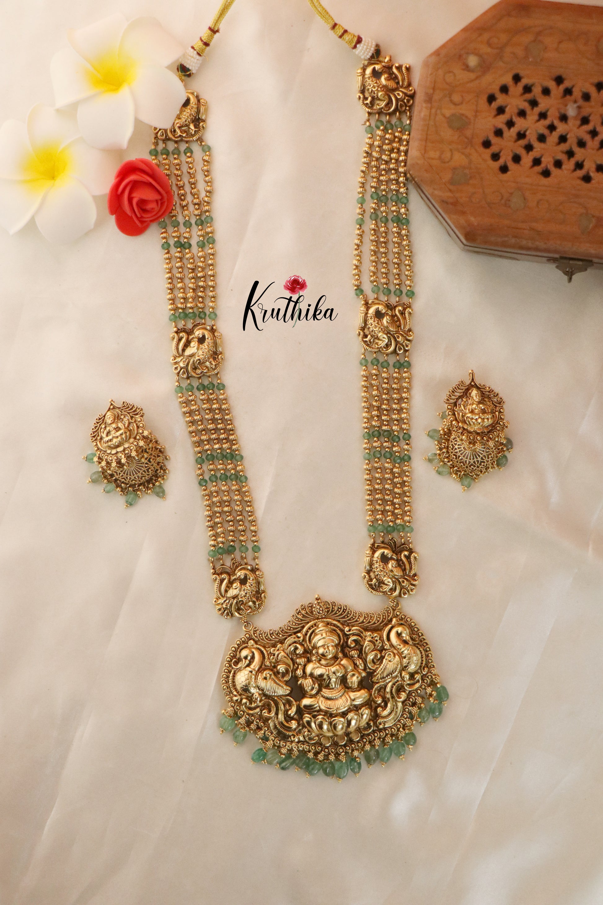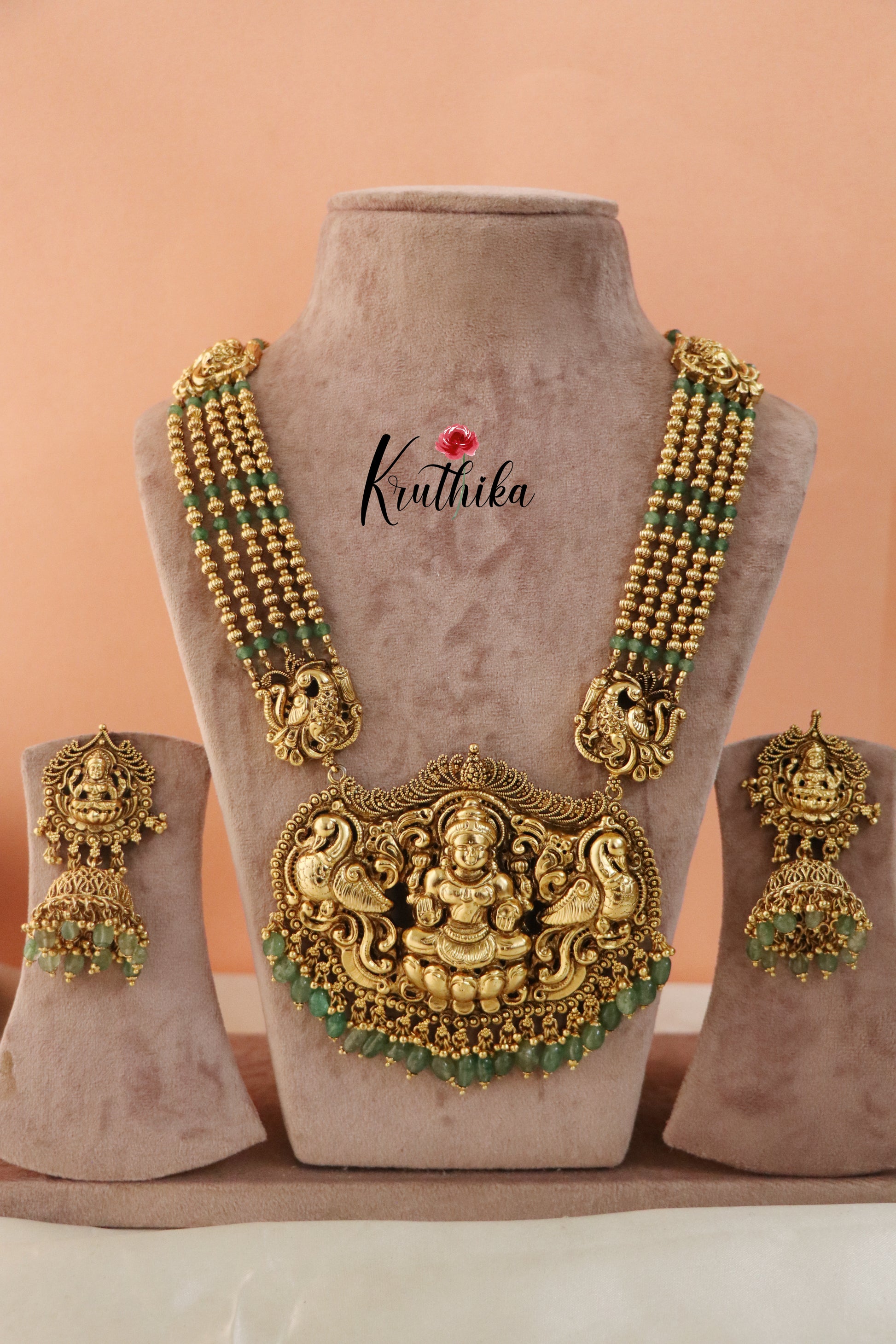 Enhance your style with our stunning Elegant Lakshmi Beads Haaram, paired perfectly with matching earrings. Crafted with high-quality stones & beads, this set combines timeless elegance with a modern touch. Ideal for special occasions or adding a touch of glamour to your look.