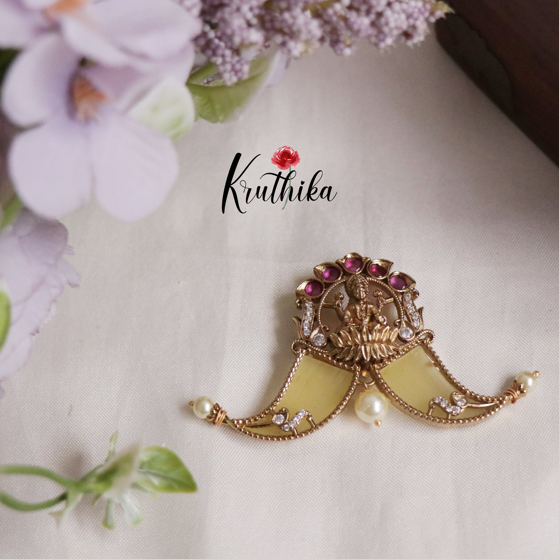 Enhance your style with our stunning Elegant Lakshmi Crescent Puligoru Pendant Crafted with high-quality stones & beads, this set combines timeless elegance with a modern touch. Ideal for special occasions or adding a touch of glamour to your look. Key Features: ● Includes: Necklace and matching earrings ● Comes with a complementary Dori ● Base material - Brass alloy ● Intricate craftsmanship ● Semi precious stones ● Versatile for any occasion