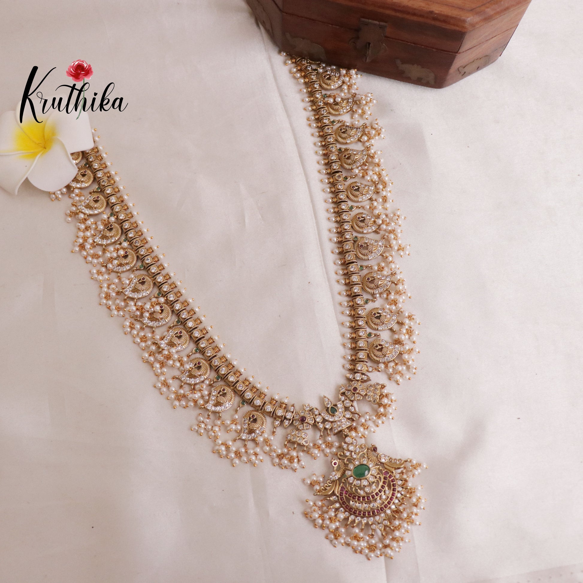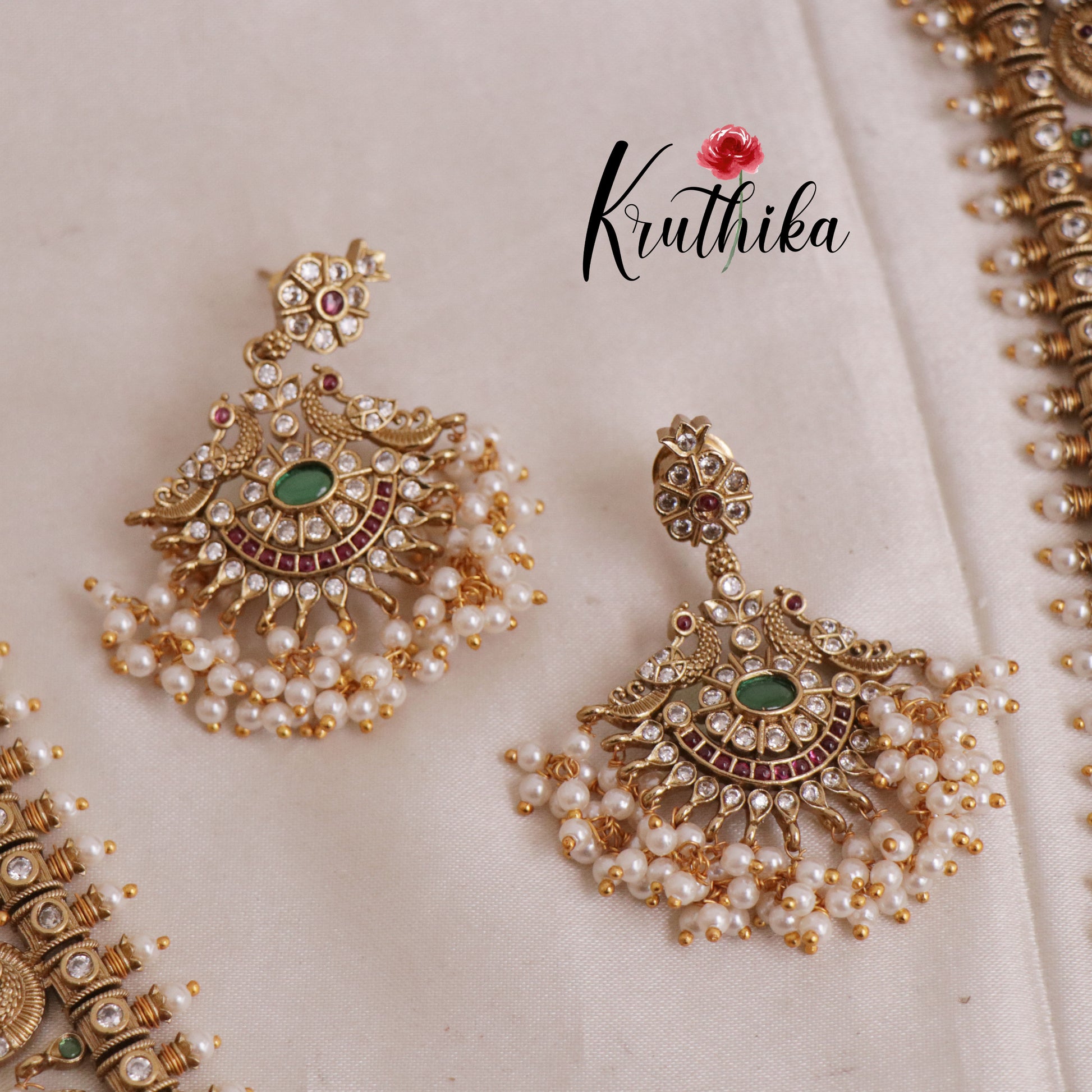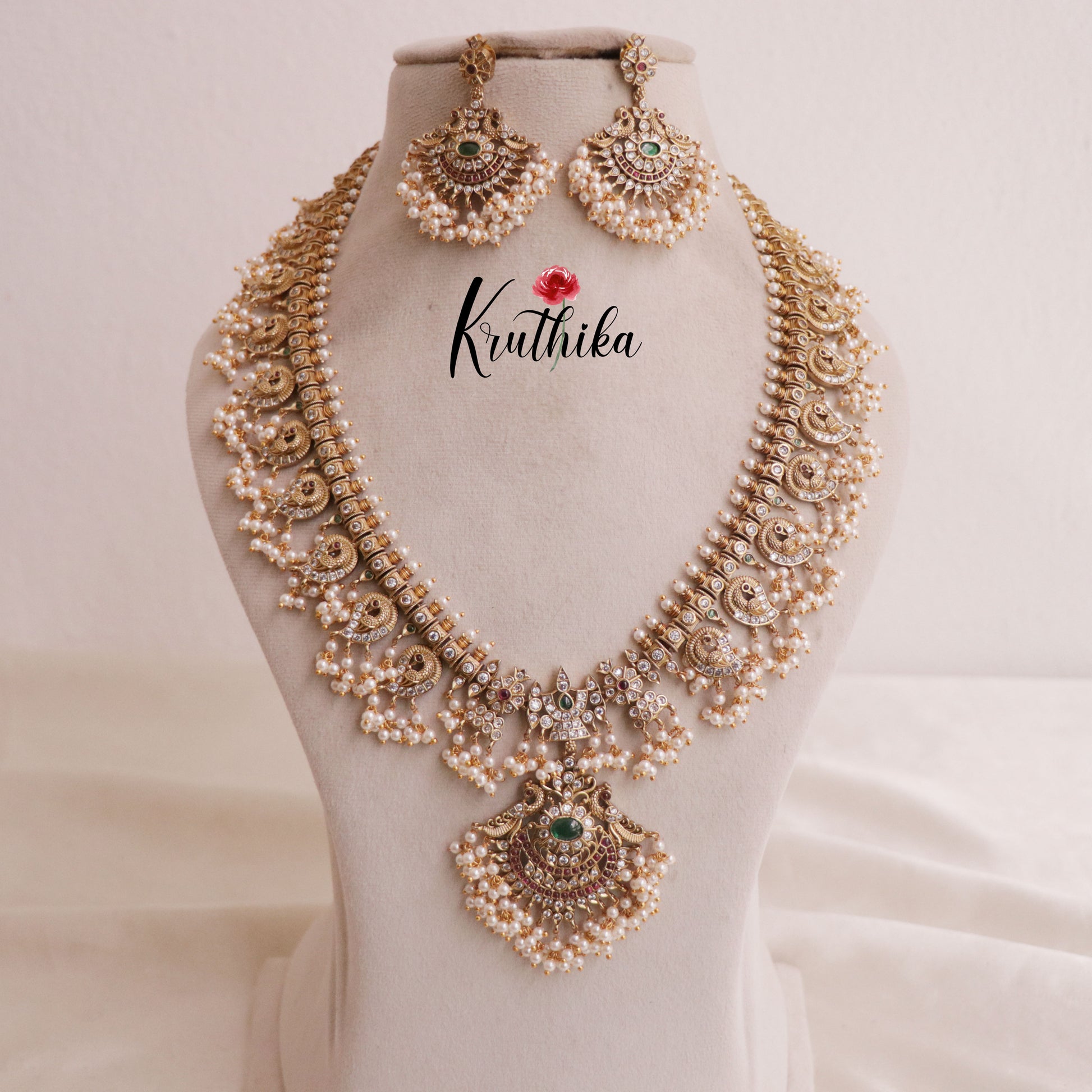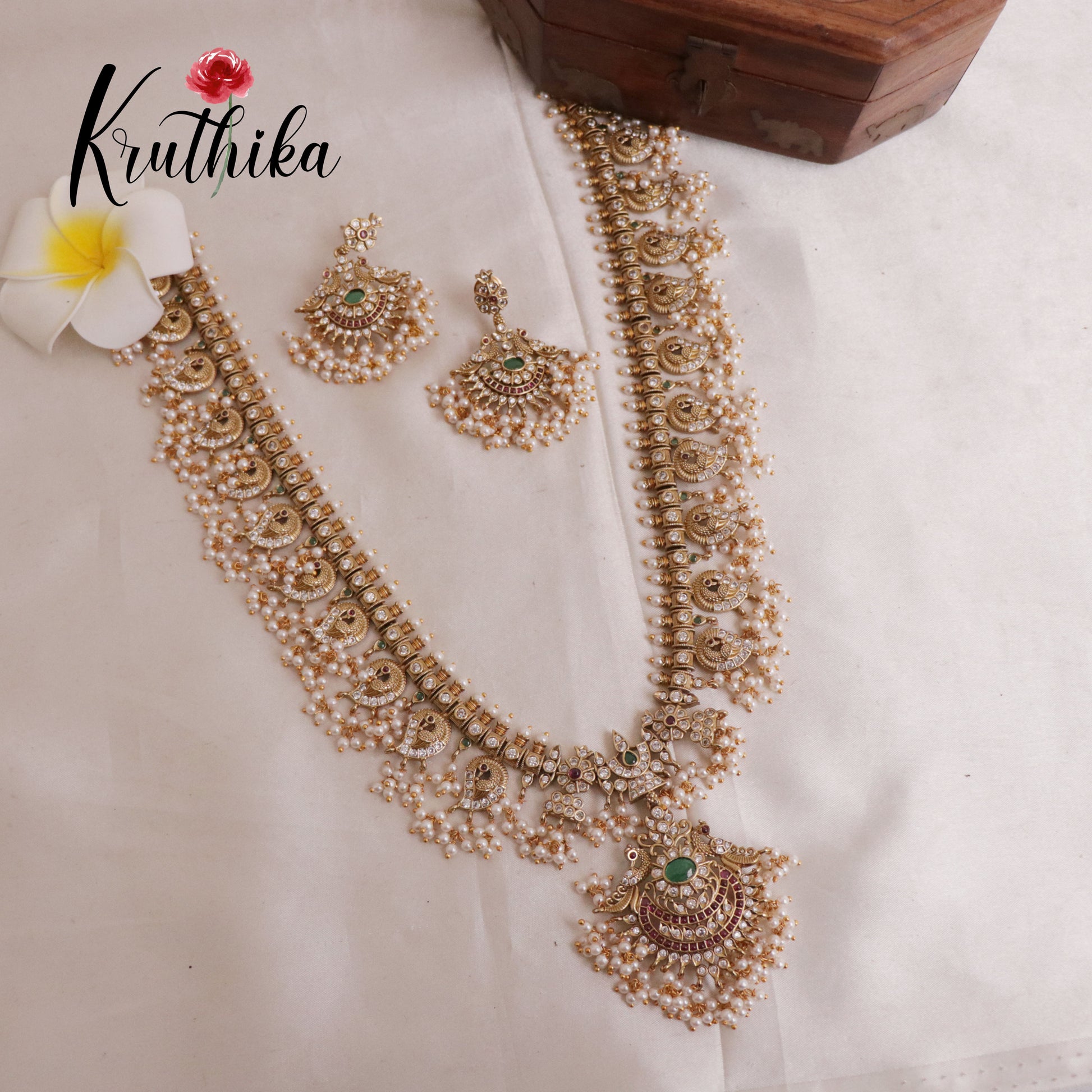 Enhance your style with our stunning, Elegant Peacock Guttaposalu Haaram with Pearl Drops, paired perfectly with matching earrings. Crafted with high-quality stones & beads, this set combines timeless elegance with a modern touch. Ideal for special occasions or adding a touch of glamour to your look.