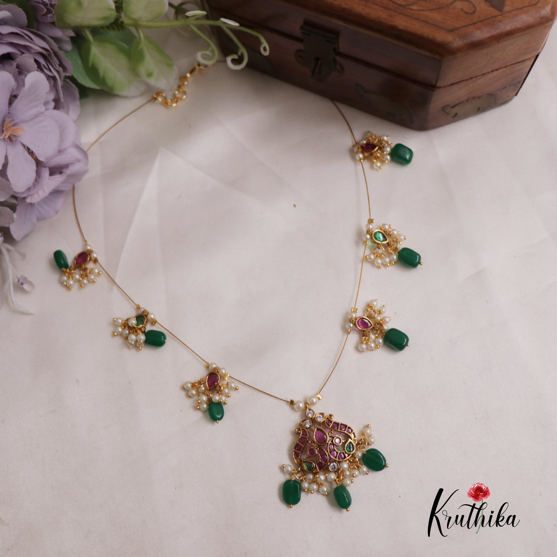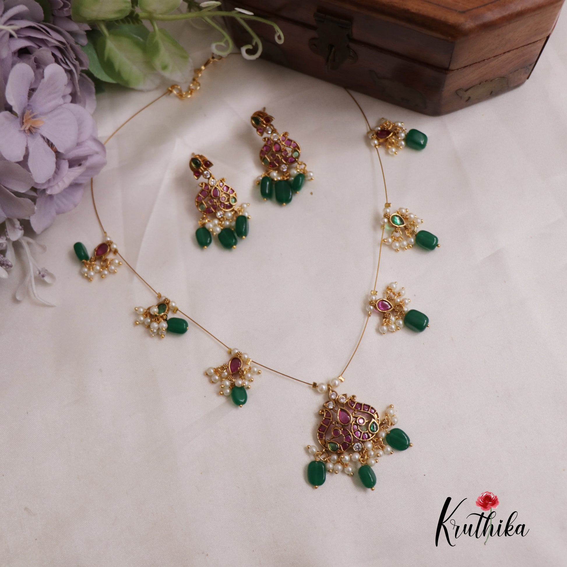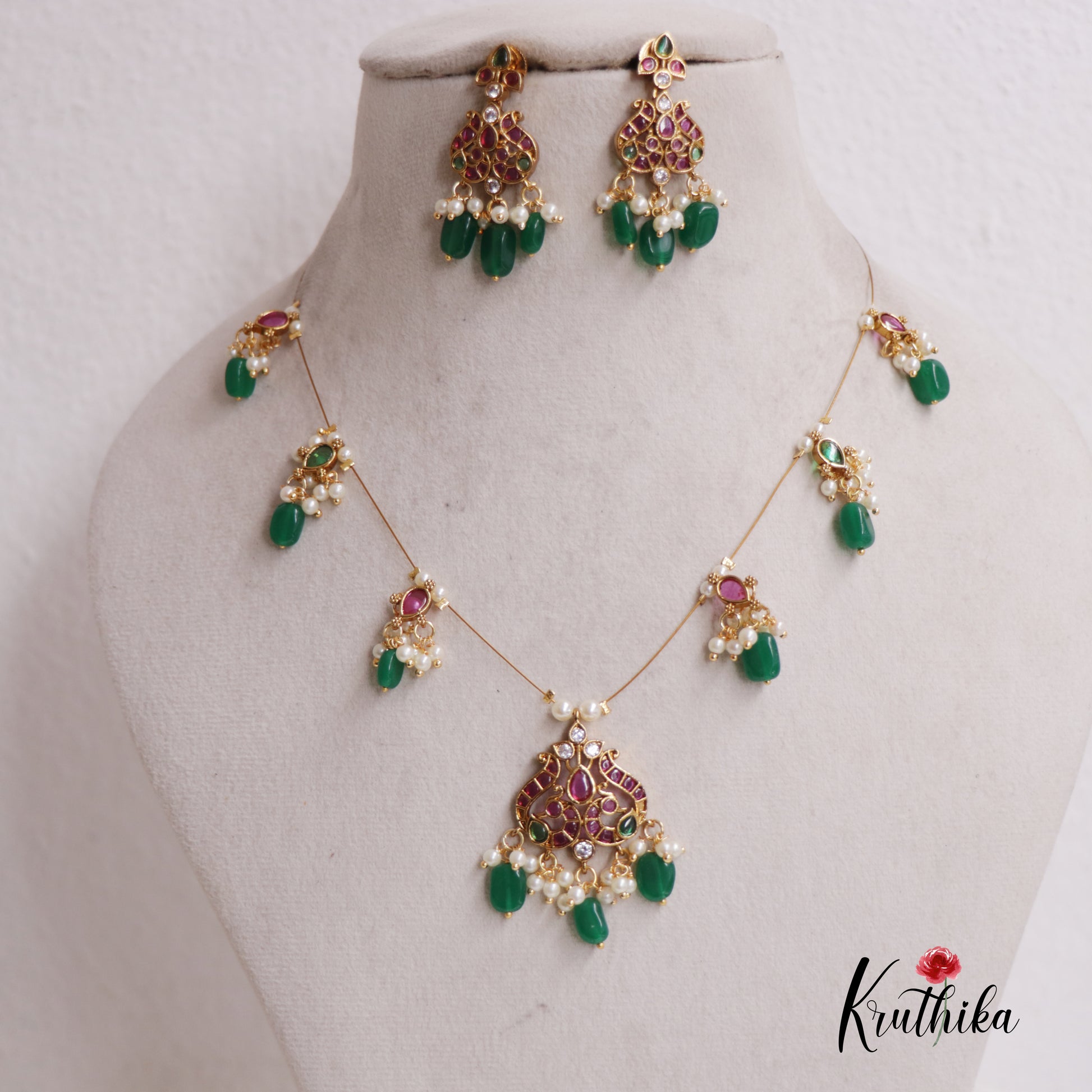 A masterpiece of traditional elegance, this ornate set features intricate gold-work paired with rich Pink Kemp stones and delicate teardrop Green Pearl accents. The "invisible" strand design allows the regal pendant and matching chandelier earrings to take centre stage, offering a timeless look for your most celebrated marriage, ceremonies and special occasions.