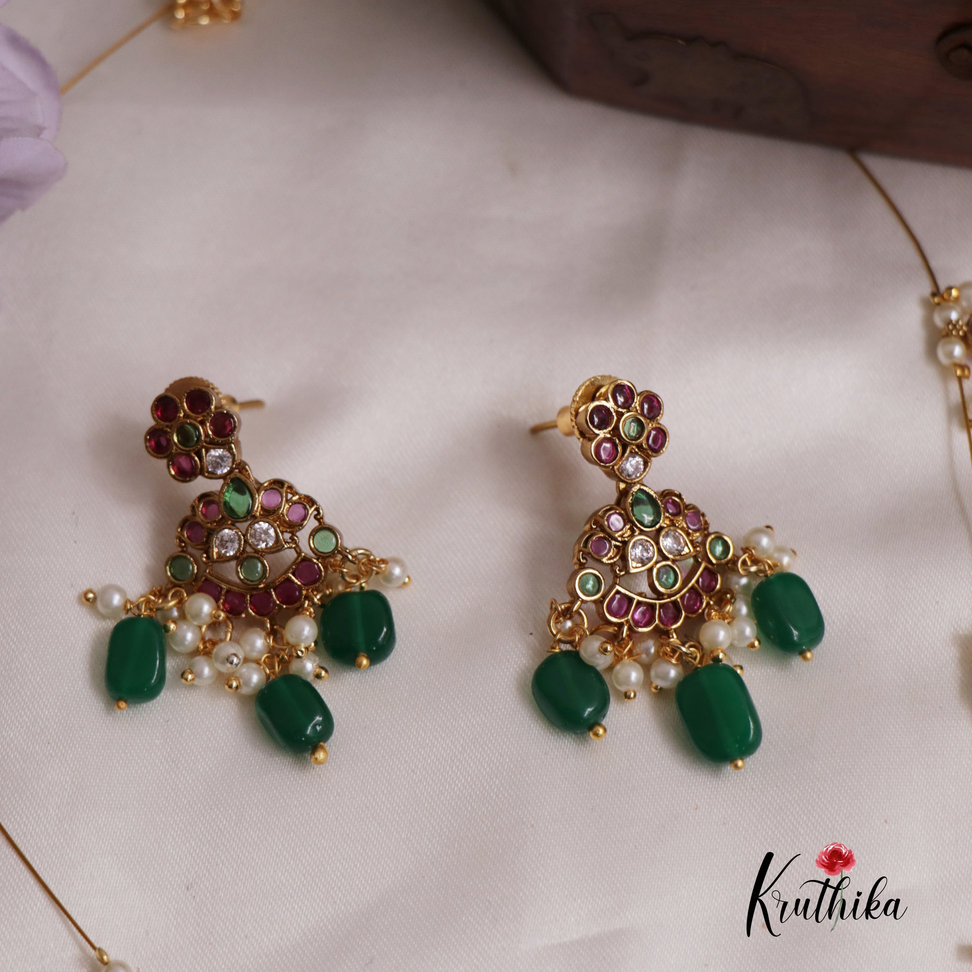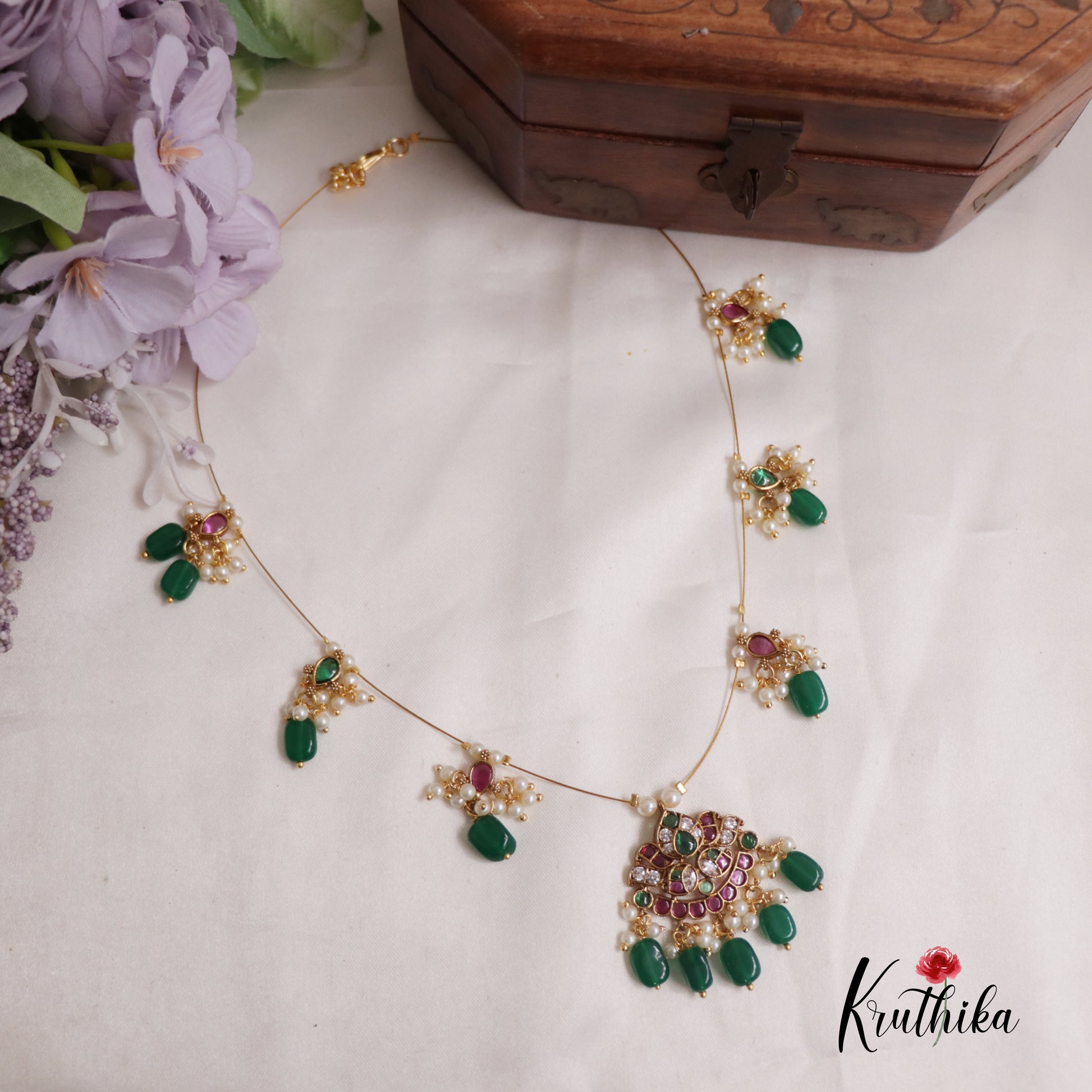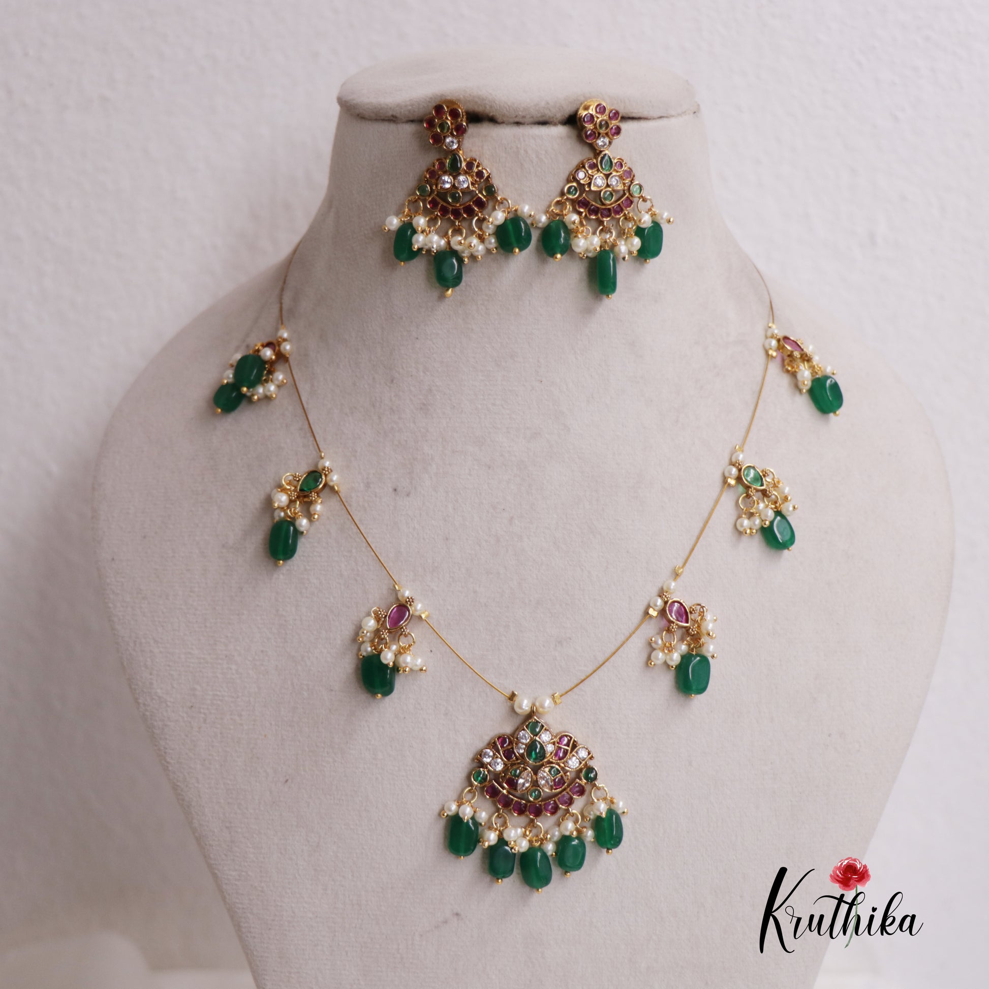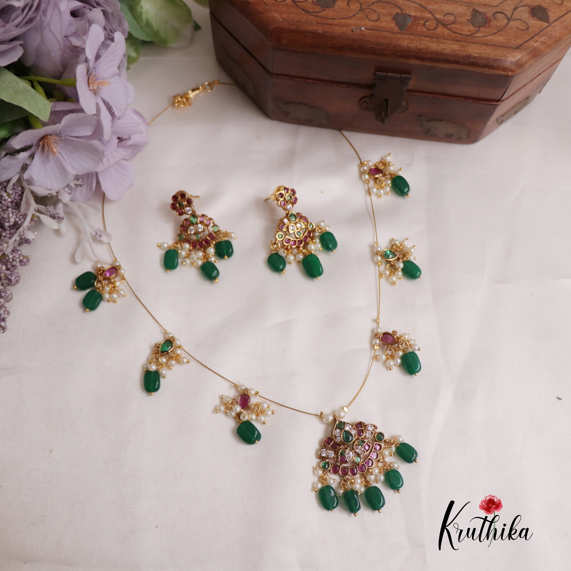 A masterpiece of traditional elegance, this ornate set features intricate gold-work paired with rich Pink Kemp stones and delicate teardrop Green Pearl accents. The "invisible" strand design centres on intricate floral and leaf motifs, allows the regal pendant and matching chandelier earrings to take centre stage, offering a timeless look for your most celebrated marriage, ceremonies and special occasions.