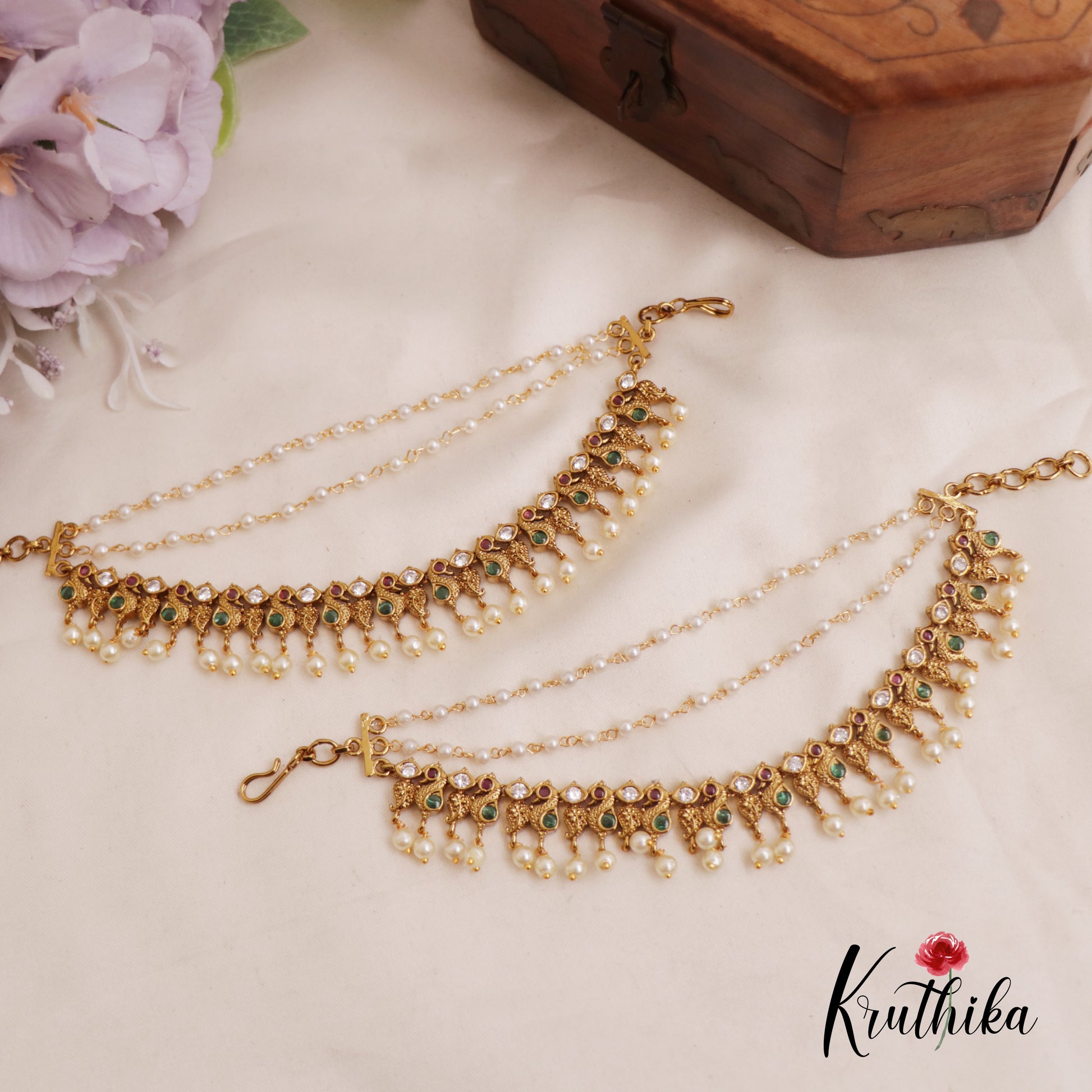 These elegant Antique Gold Finish Earchains feature a traditional peacock motif intricately detailed with shimmering kemp style stones in ruby red and emerald green. The design is elevated by three delicate layers of miniature pearl bead strands that drape gracefully, finished with dainty pearl drops along the base. Combining classic temple jewelry aesthetics with a lightweight, multi layered silhouette, these earchains are the perfect accessory to enhance your festive or bridal attire.