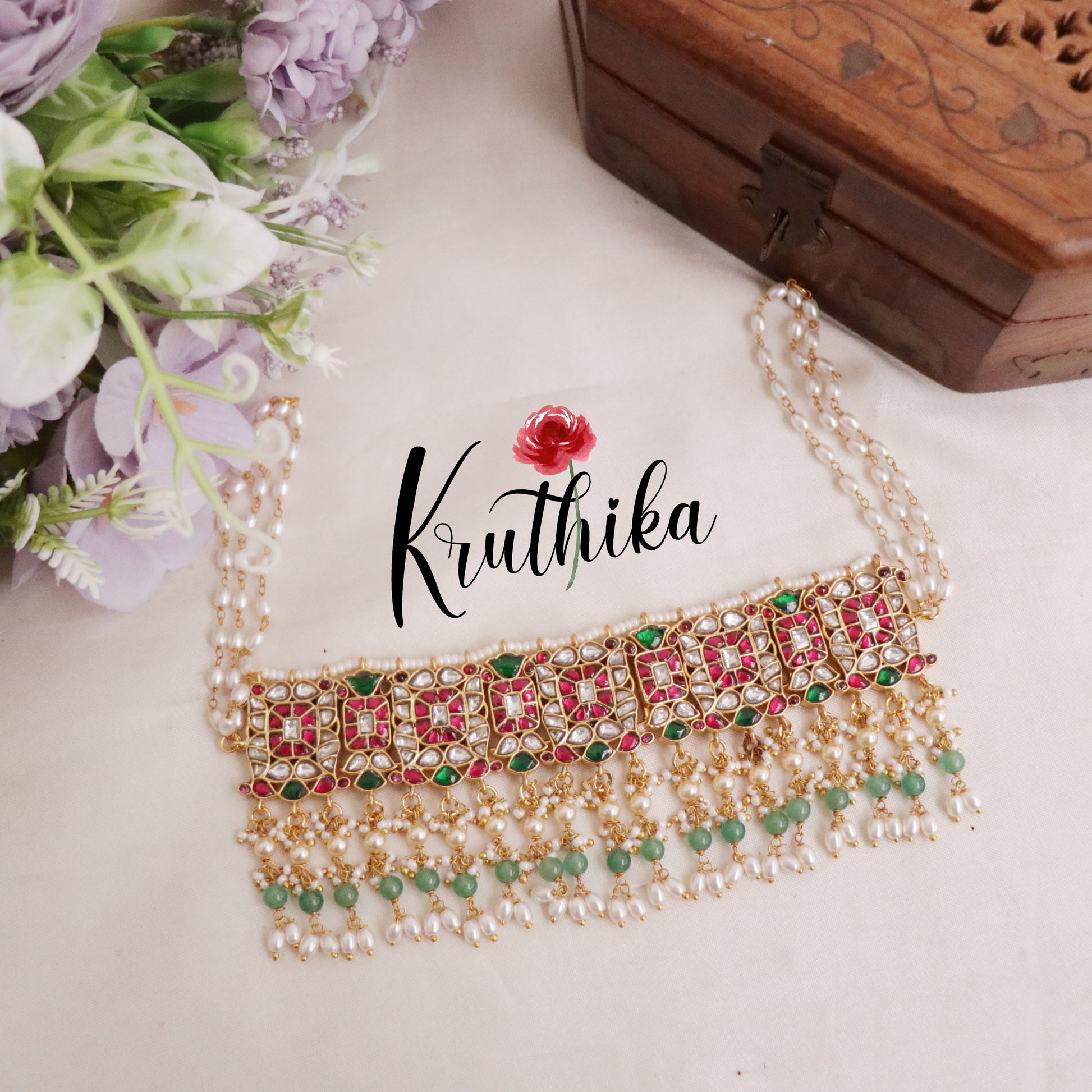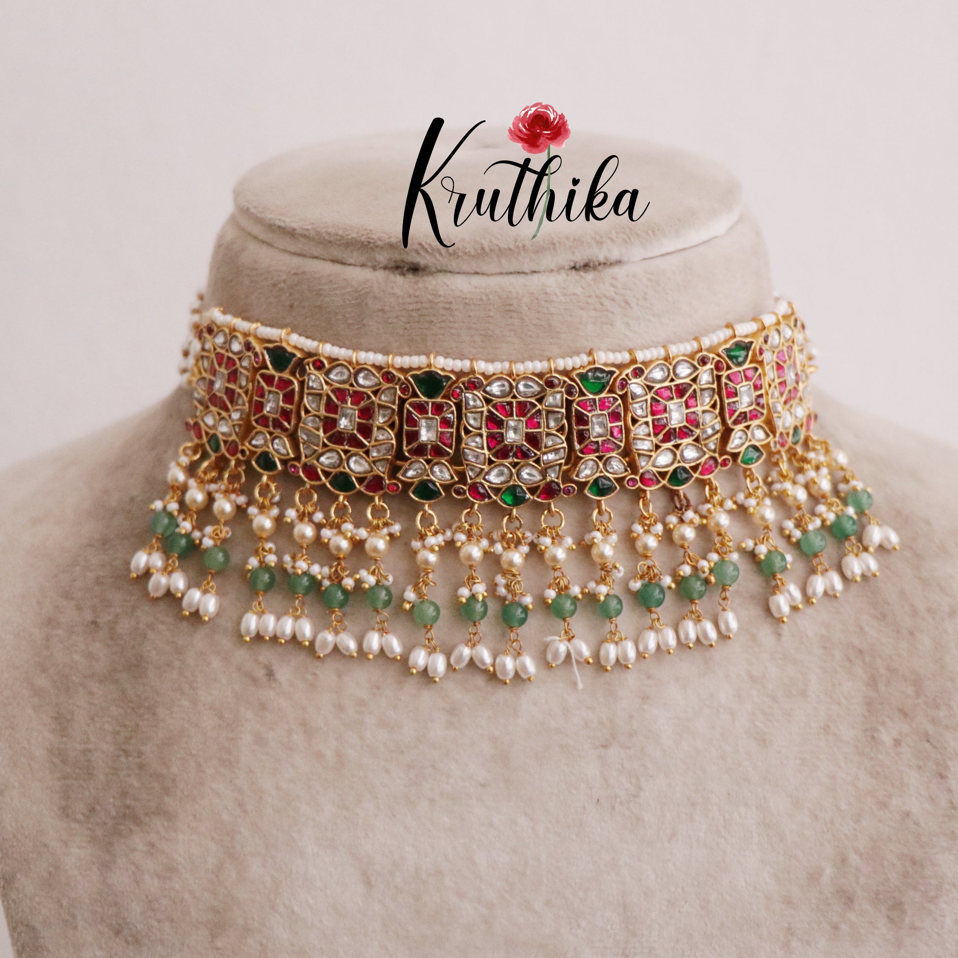Enhance your style with our stunning, Elegant Ruby & Emerald Jadau Choker with Pearl Drops paired perfectly with matching earrings. Crafted with high-quality stones & beads, this set combines timeless elegance with a modern touch. Ideal for special occasions or adding a touch of glamour to your look.