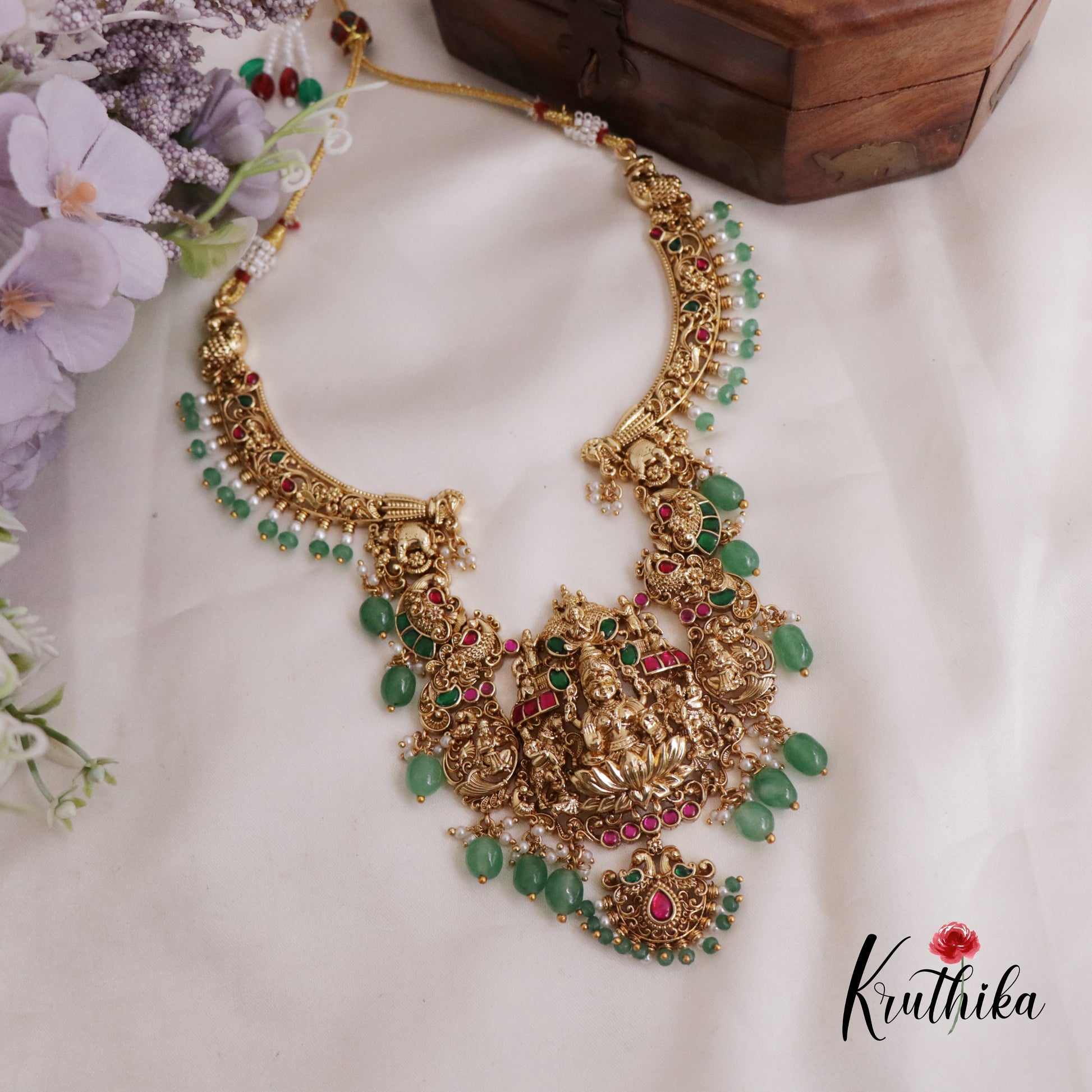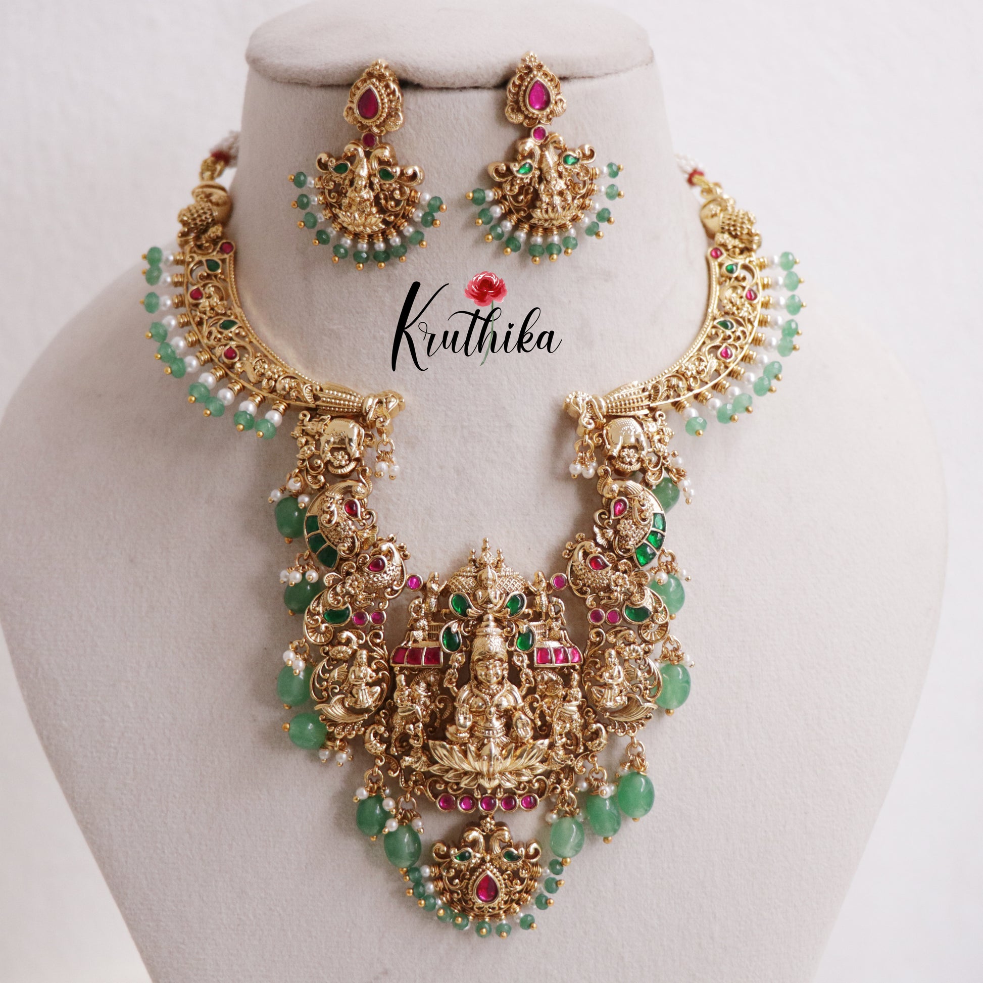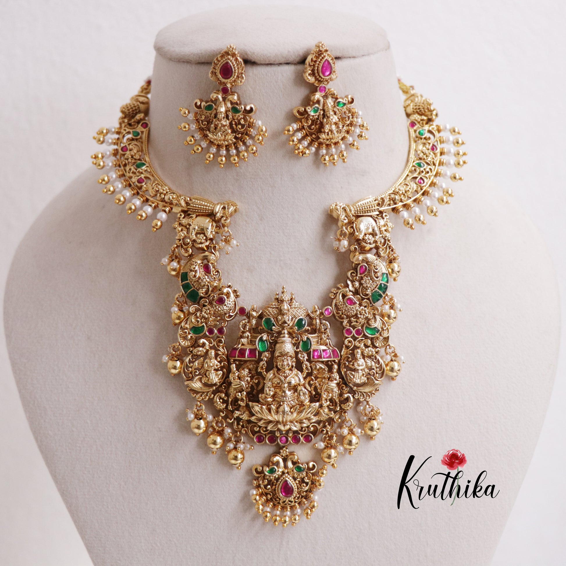 Enhance your style with our stunning Elegant Temple Lakshmi and Peacock Jadau Necklace with Bead Drops paired perfectly with matching earrings. Crafted with high-quality stones & beads, this set combines timeless elegance with a modern touch. Ideal for special occasions or adding a touch of glamour to your look.