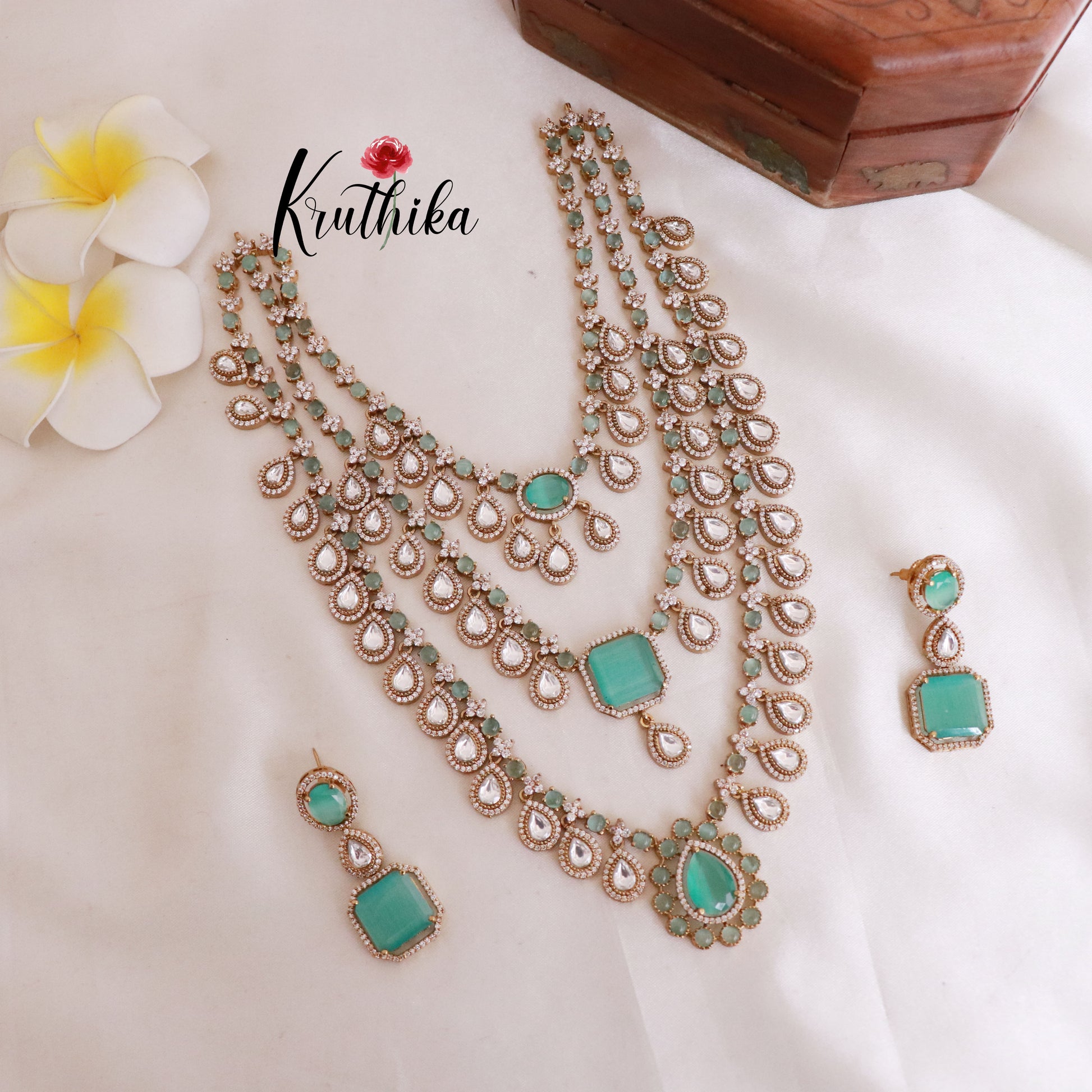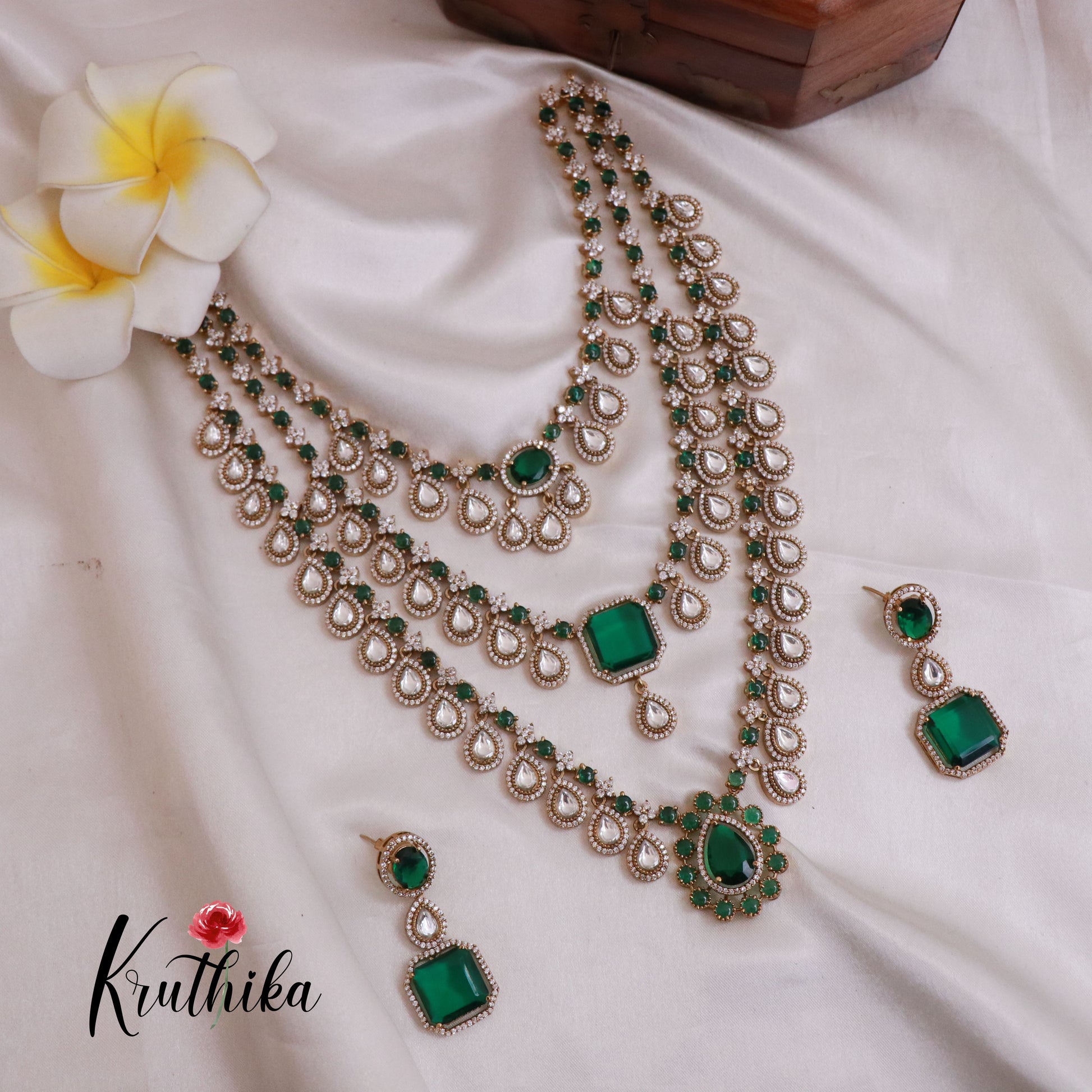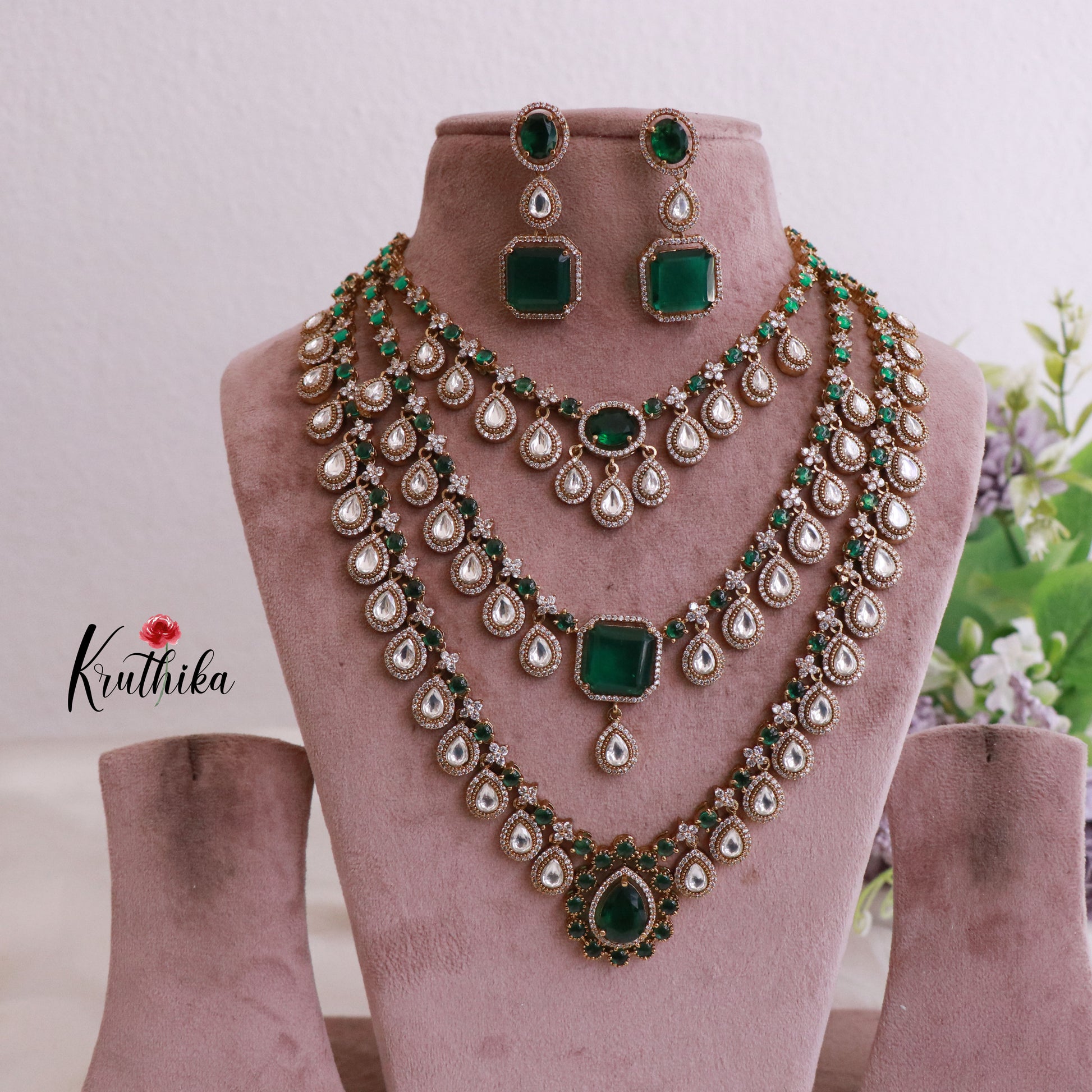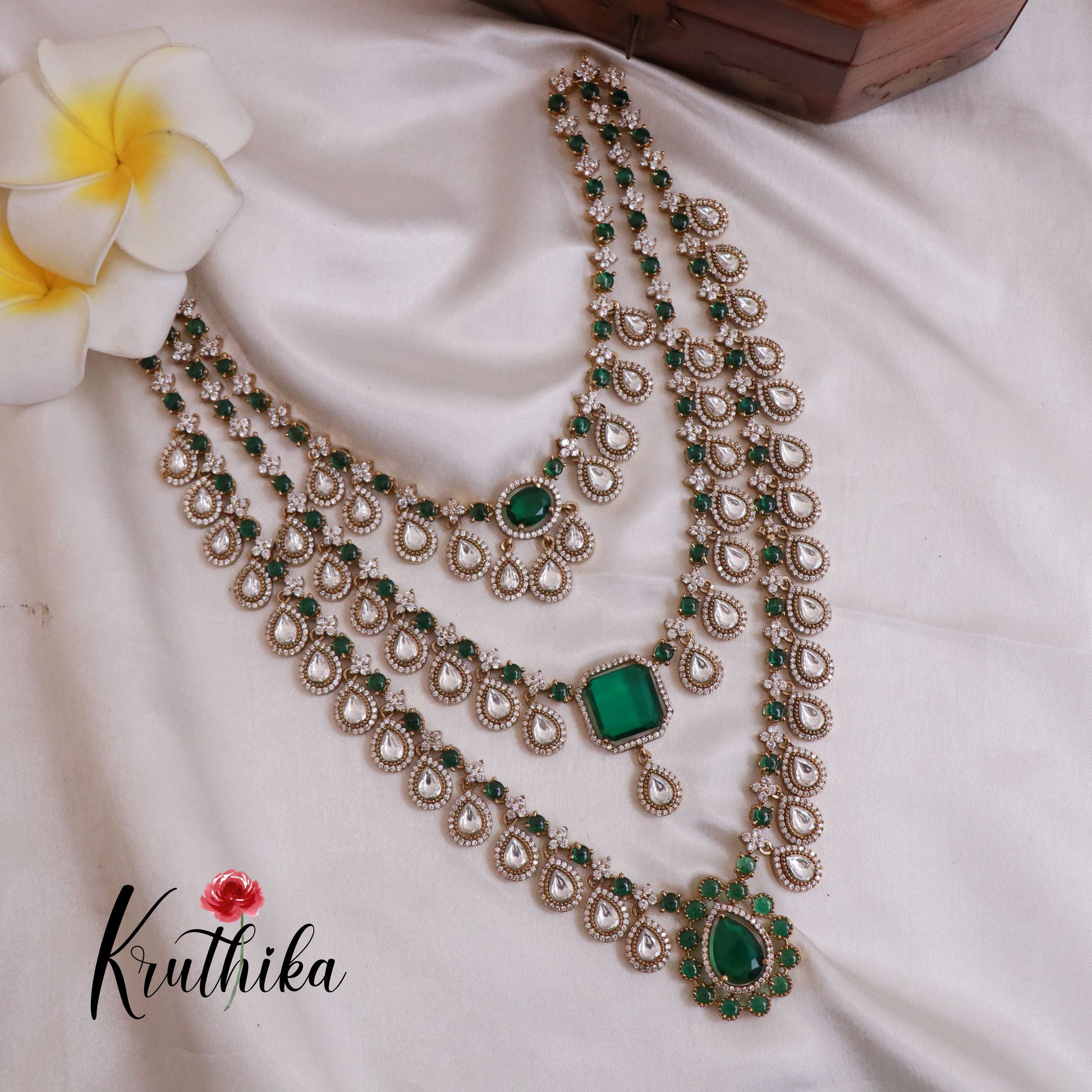 Enhance your style with our stunning, Elegant Three Layer Victorian Moissanite Harams. Crafted with high-quality stones & beads, this set combines timeless elegance with a modern touch. Ideal for special occasions or adding a touch of glamour to your look.