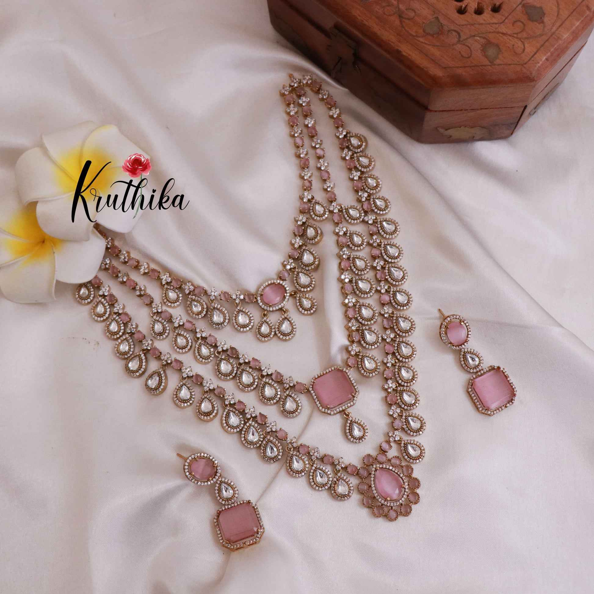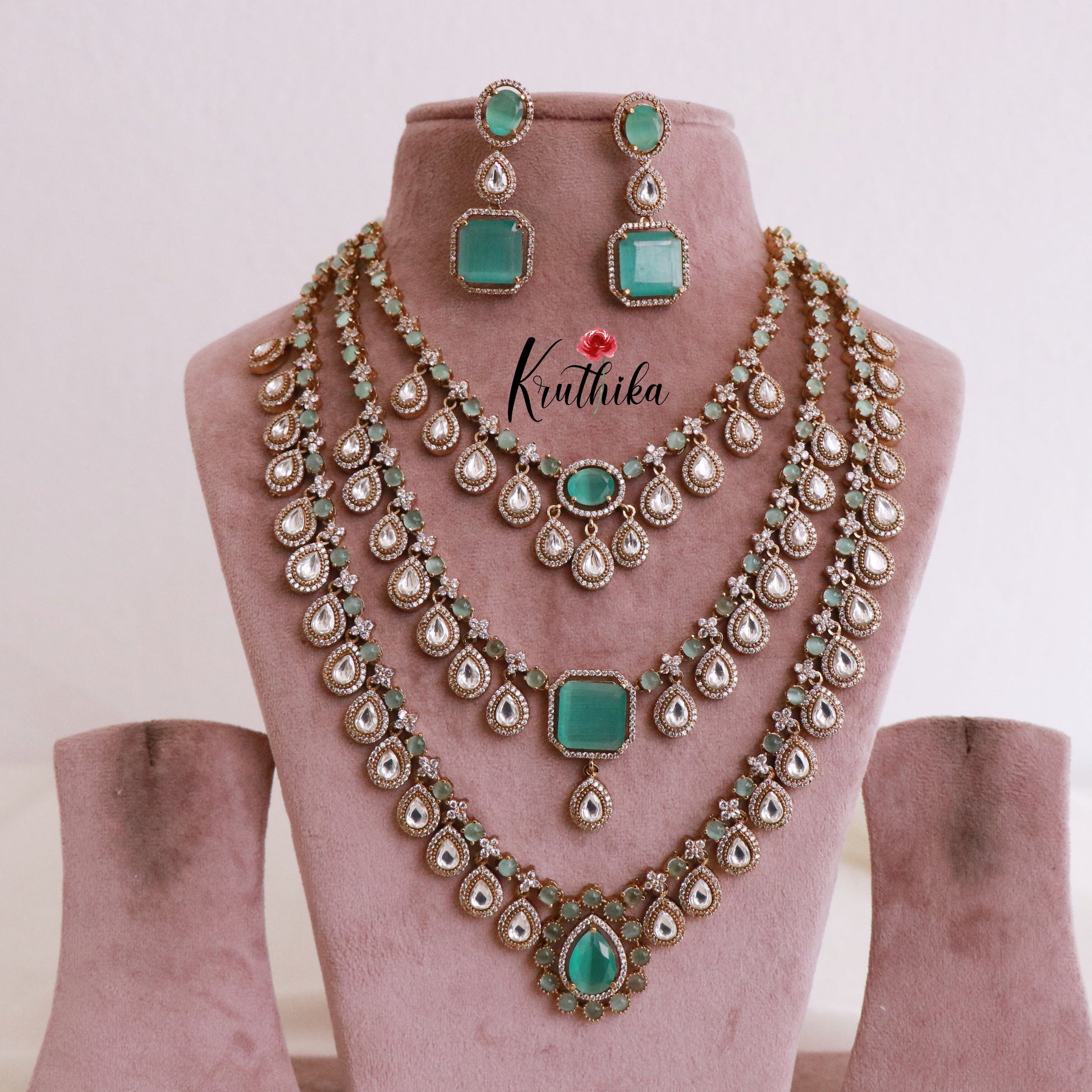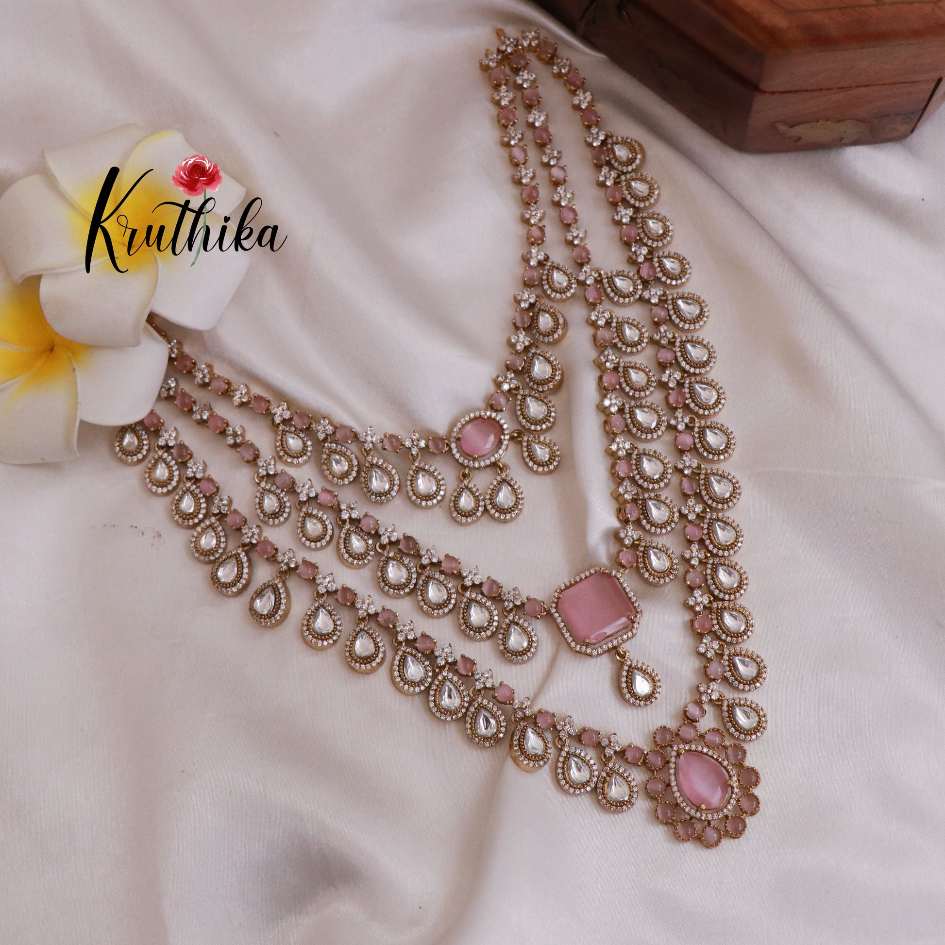 Enhance your style with our stunning, Elegant Three Layer Victorian Moissanite Harams. Crafted with high-quality stones & beads, this set combines timeless elegance with a modern touch. Ideal for special occasions or adding a touch of glamour to your look.