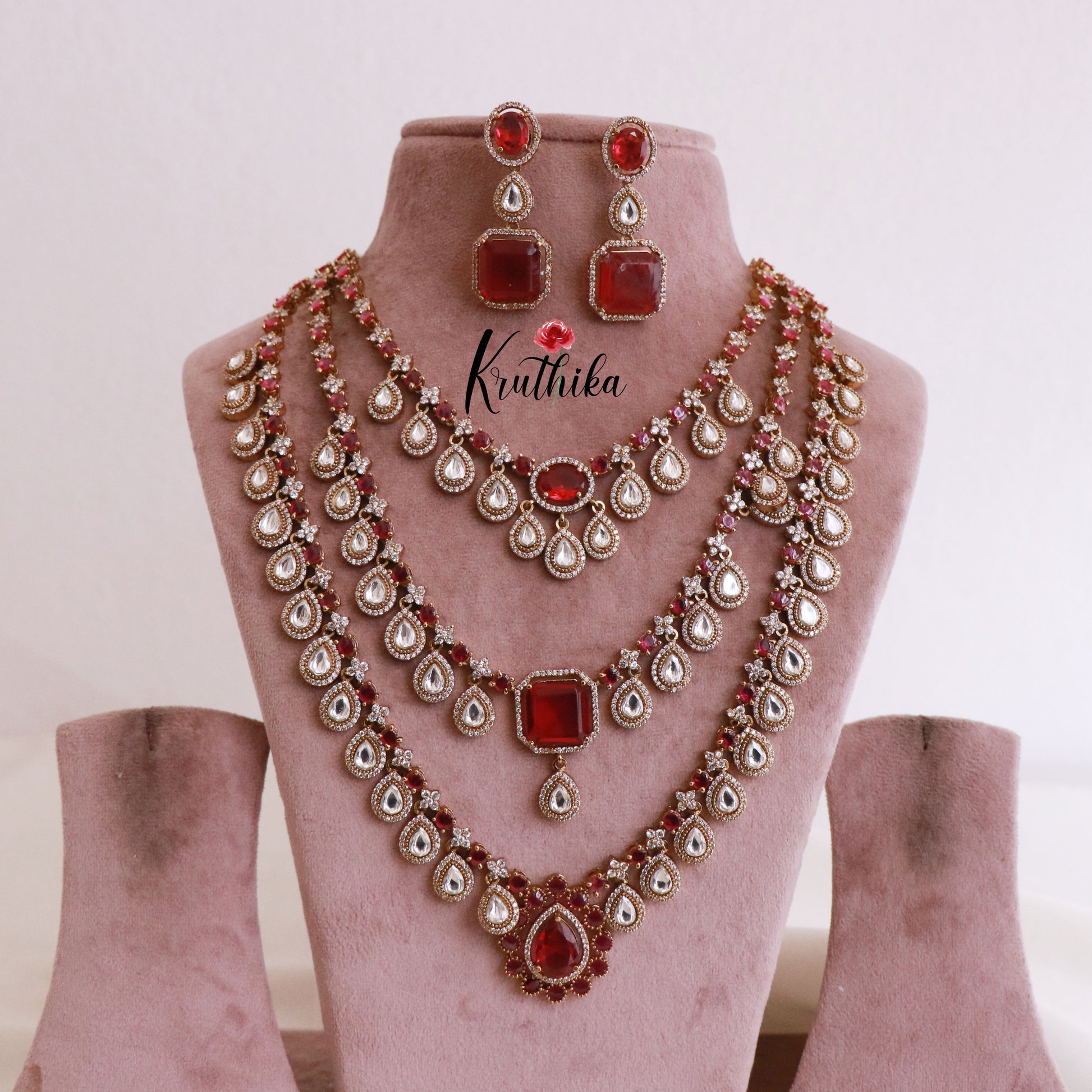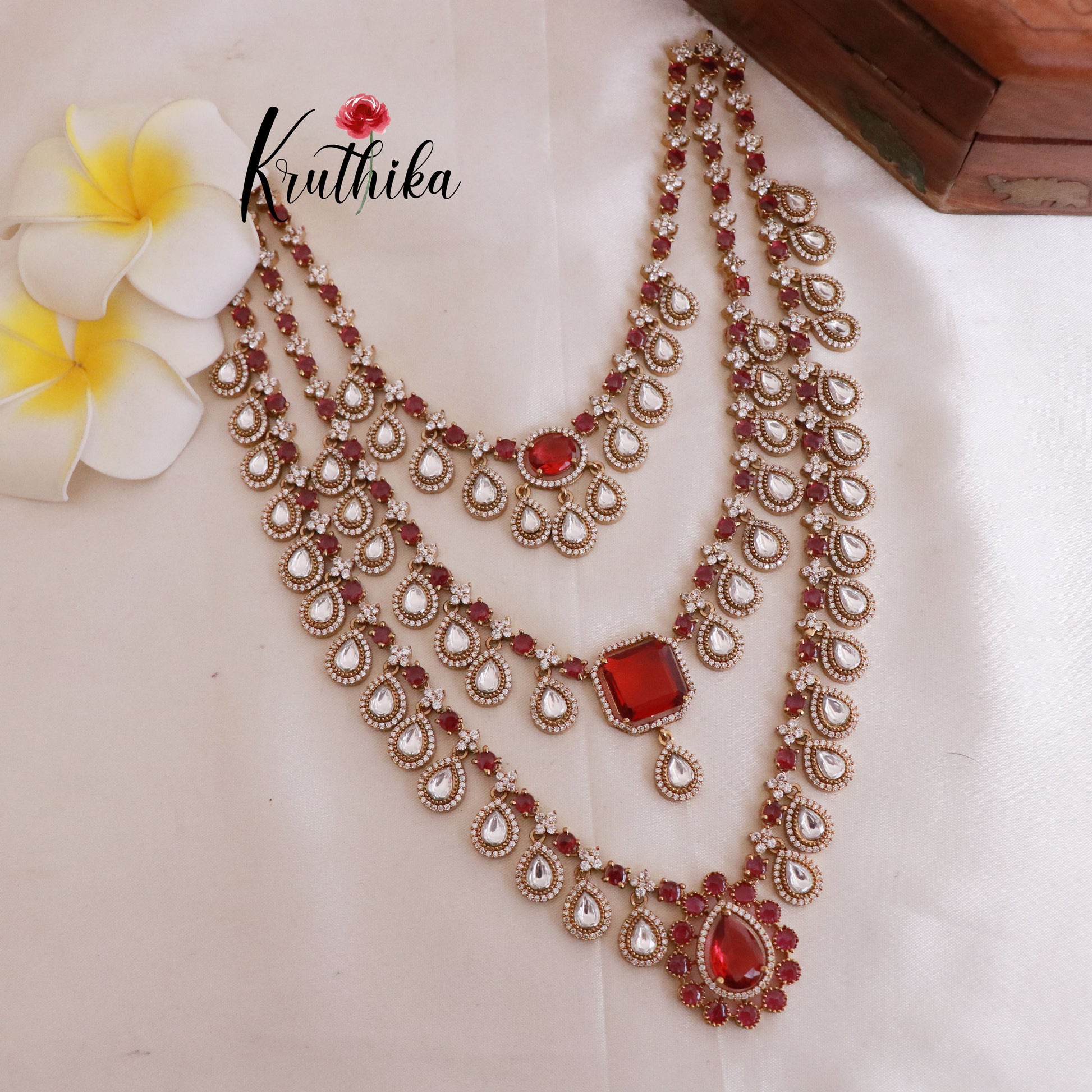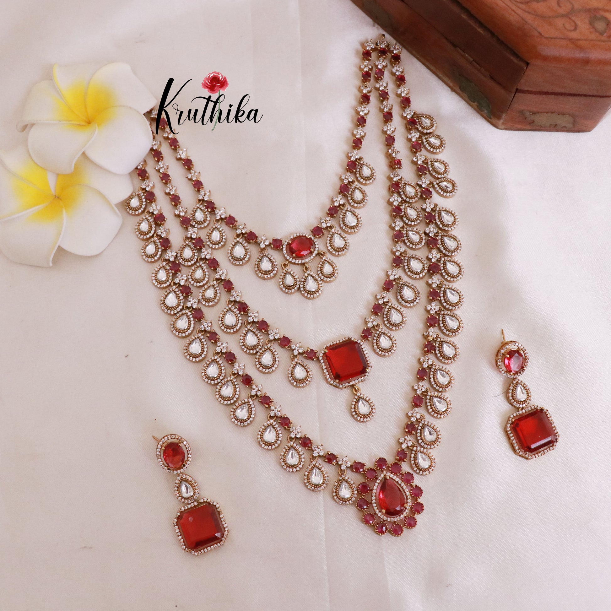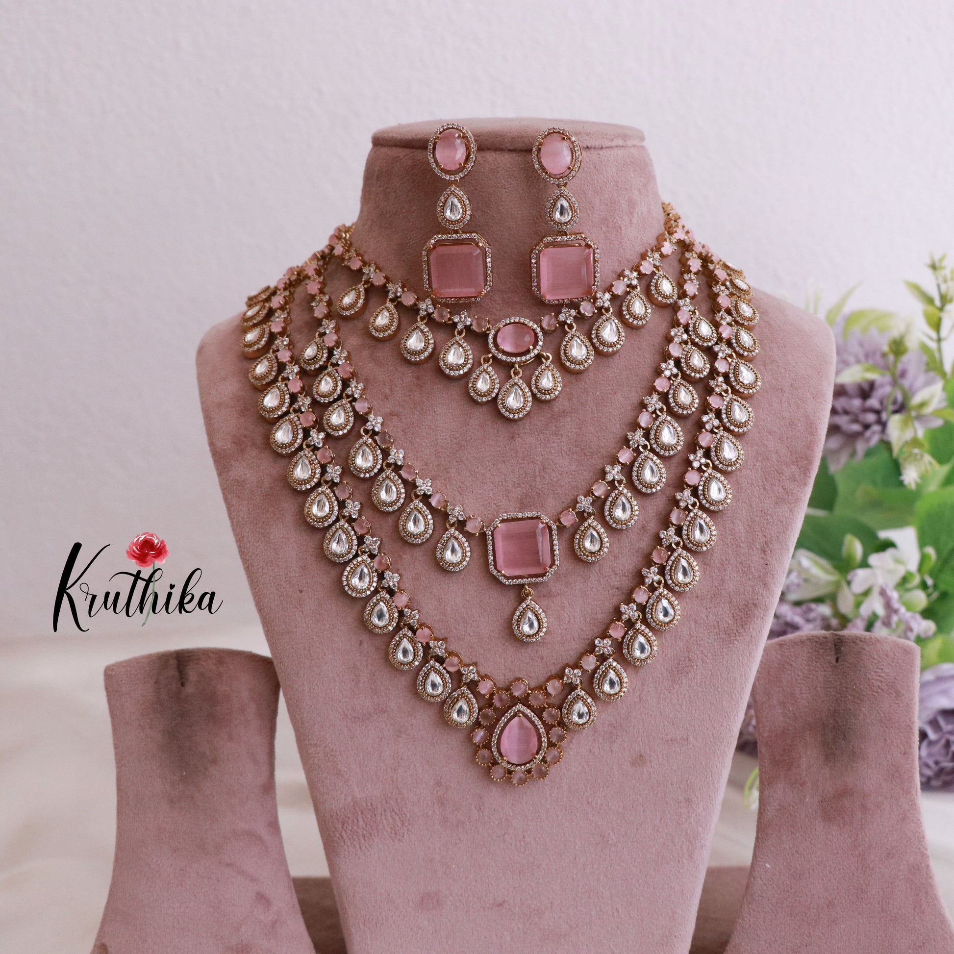 Enhance your style with our stunning, Elegant Three Layer Victorian Moissanite Harams. Crafted with high-quality stones & beads, this set combines timeless elegance with a modern touch. Ideal for special occasions or adding a touch of glamour to your look.