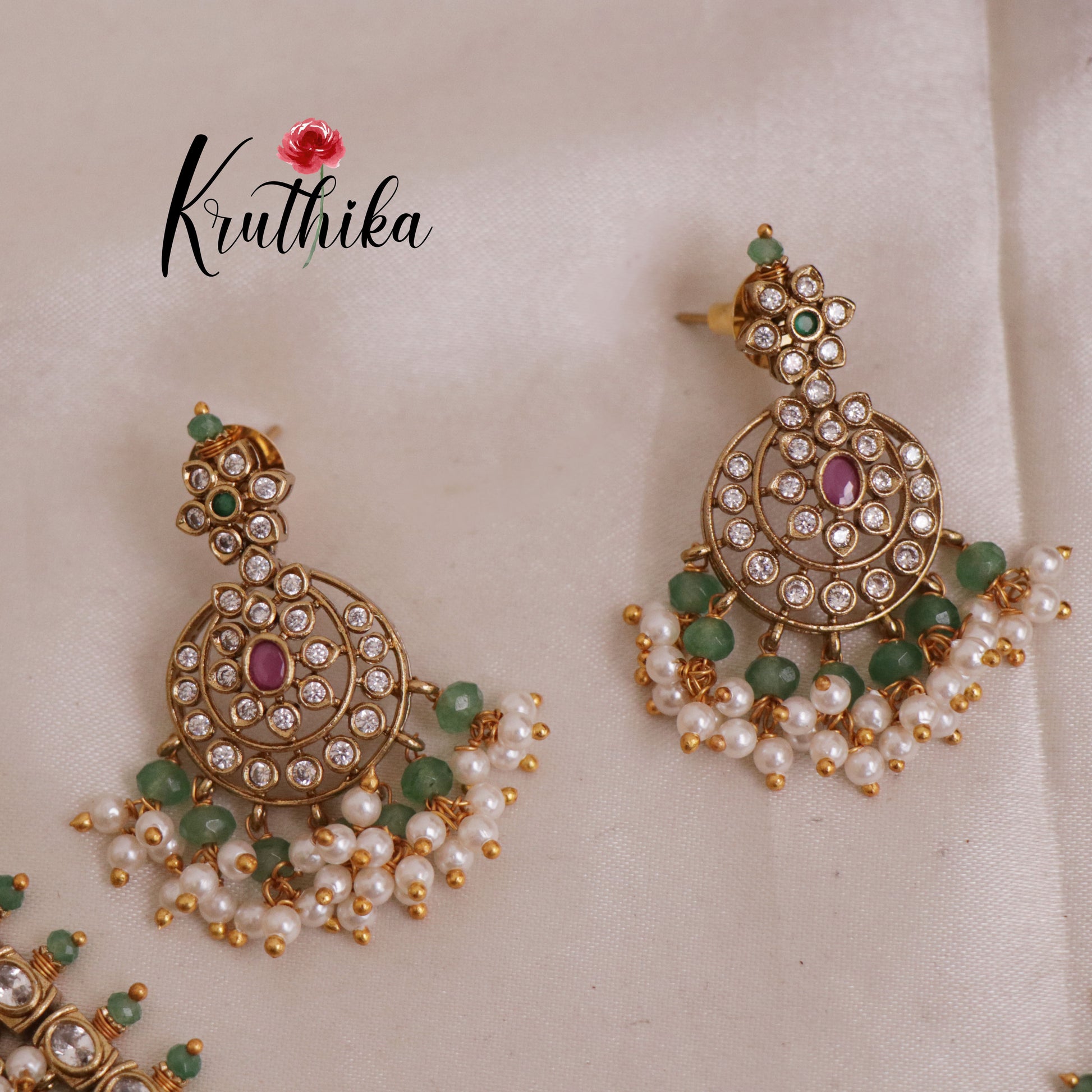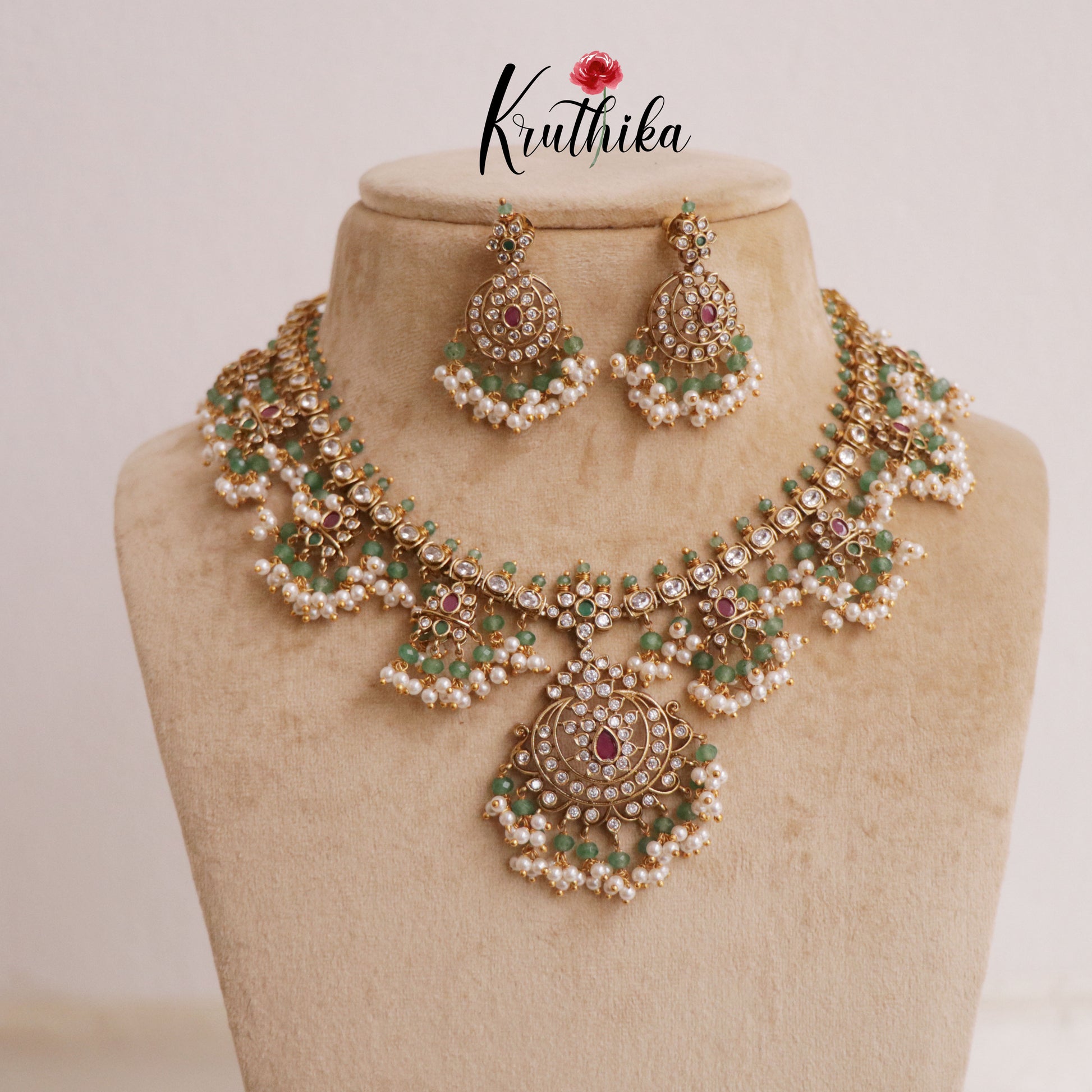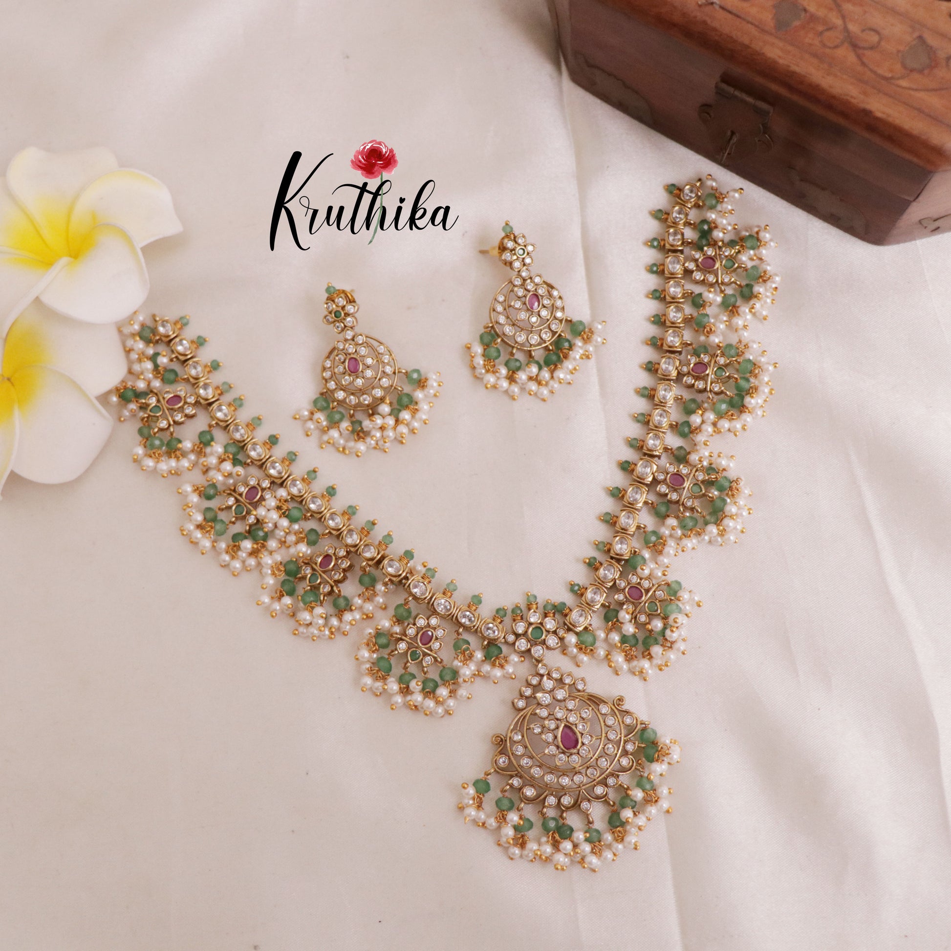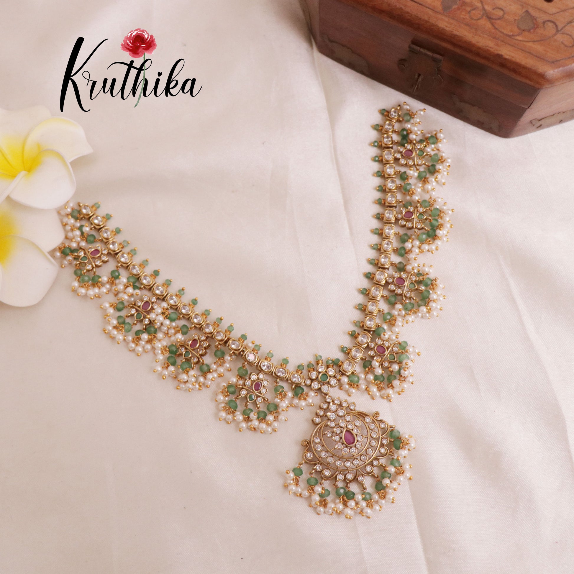 Elegant Victorian AD Stones Guttaposalu Necklace with Pastel Green Beads Drops NC1948