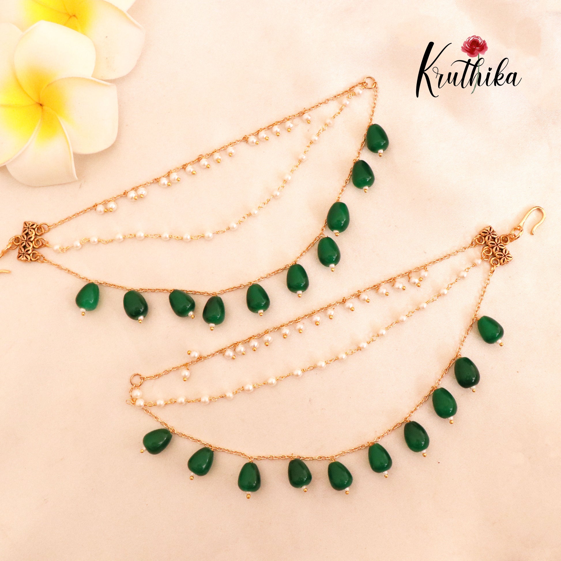 Enhance your style with our stunning, Emerald bead drops Ear chains. Crafted with high-quality stones & beads, this set combines timeless elegance with a modern touch. Ideal for special occasions or adding a touch of glamour to your look.