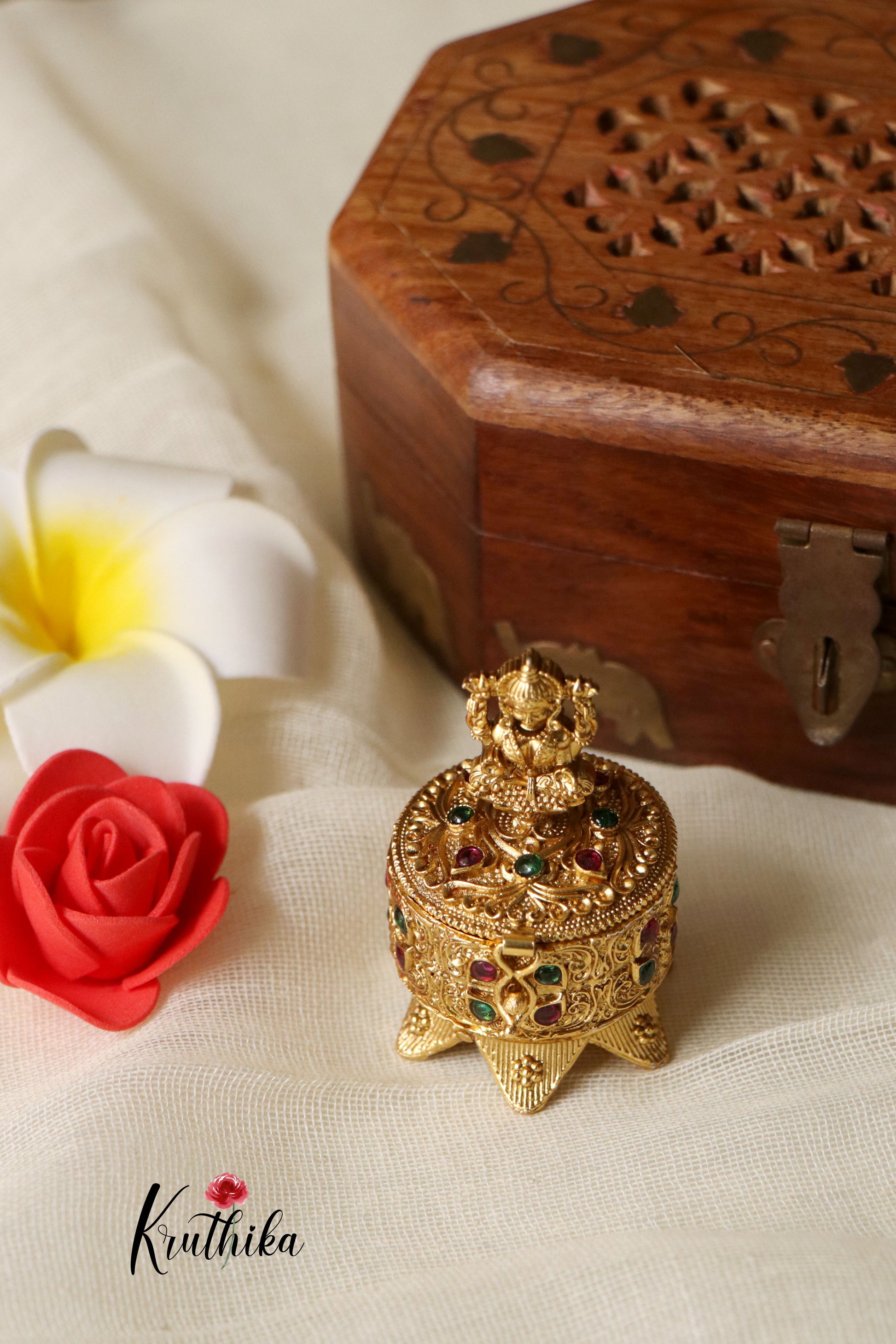 Store your essentials in style with our exquisite Kukum Boxes. Perfect for holding kumkum, bindi, or other small items, these boxes blend traditional charm with practical design, making them a beautiful addition to your vanity or puja space.