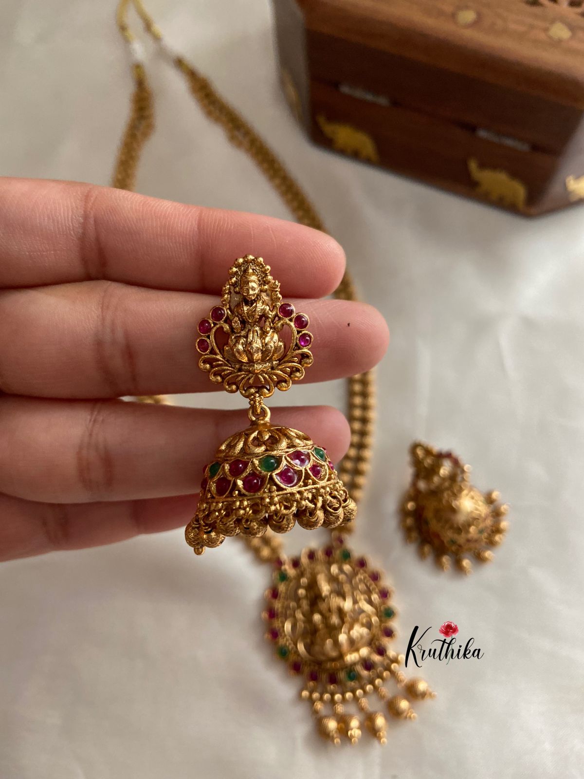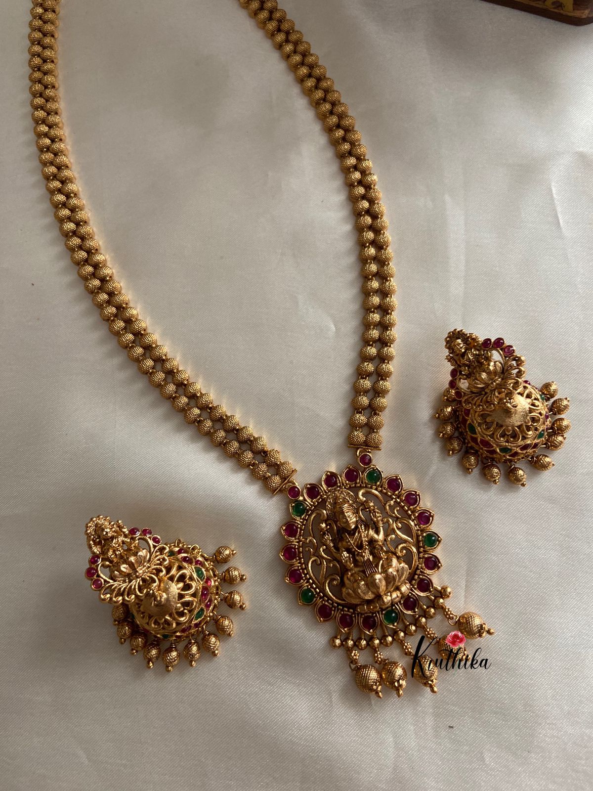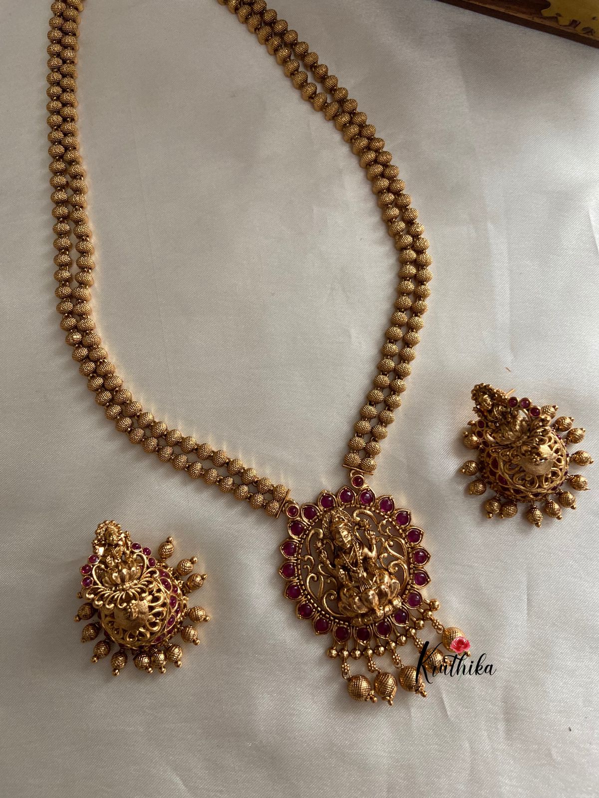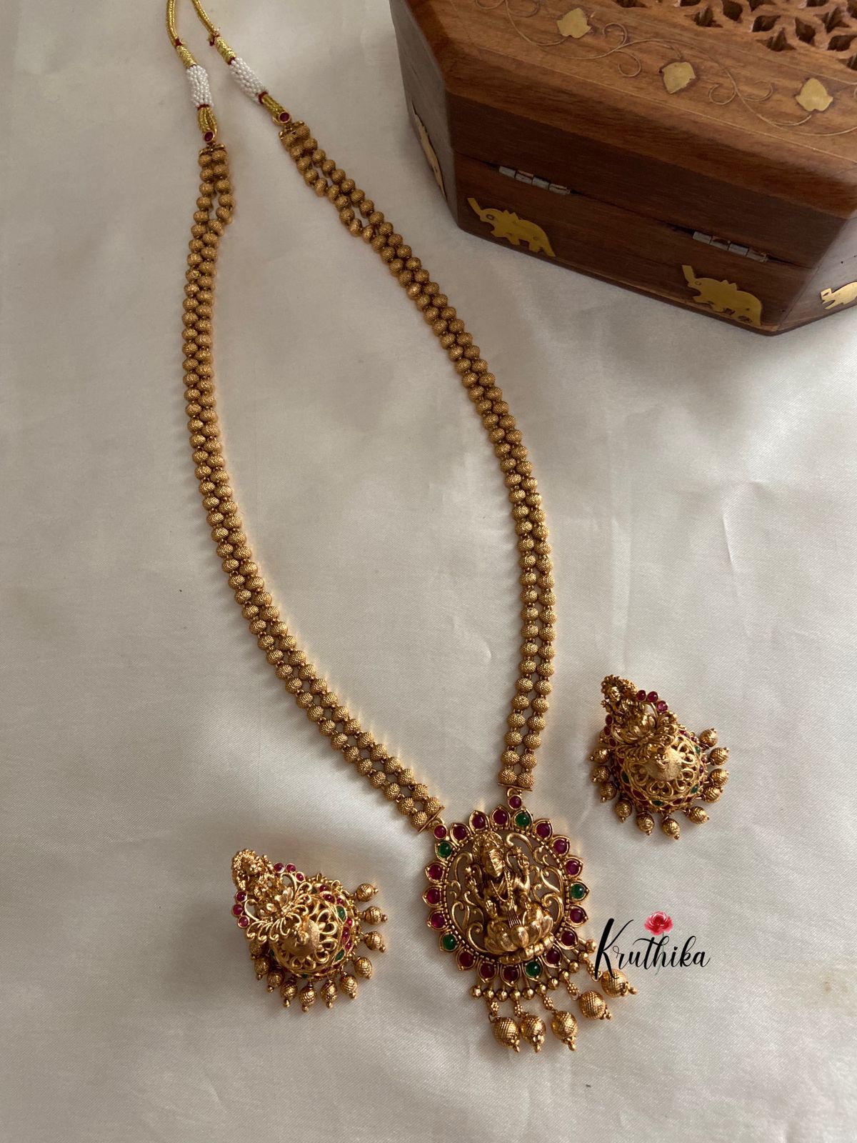 Enhance your style with our stunning Golden beads maala with Lakshmi pendant, paired perfectly with matching earrings. Crafted with high-quality stones & beads, this set combines timeless elegance with a modern touch. Ideal for special occasions or adding a touch of glamour to your look.