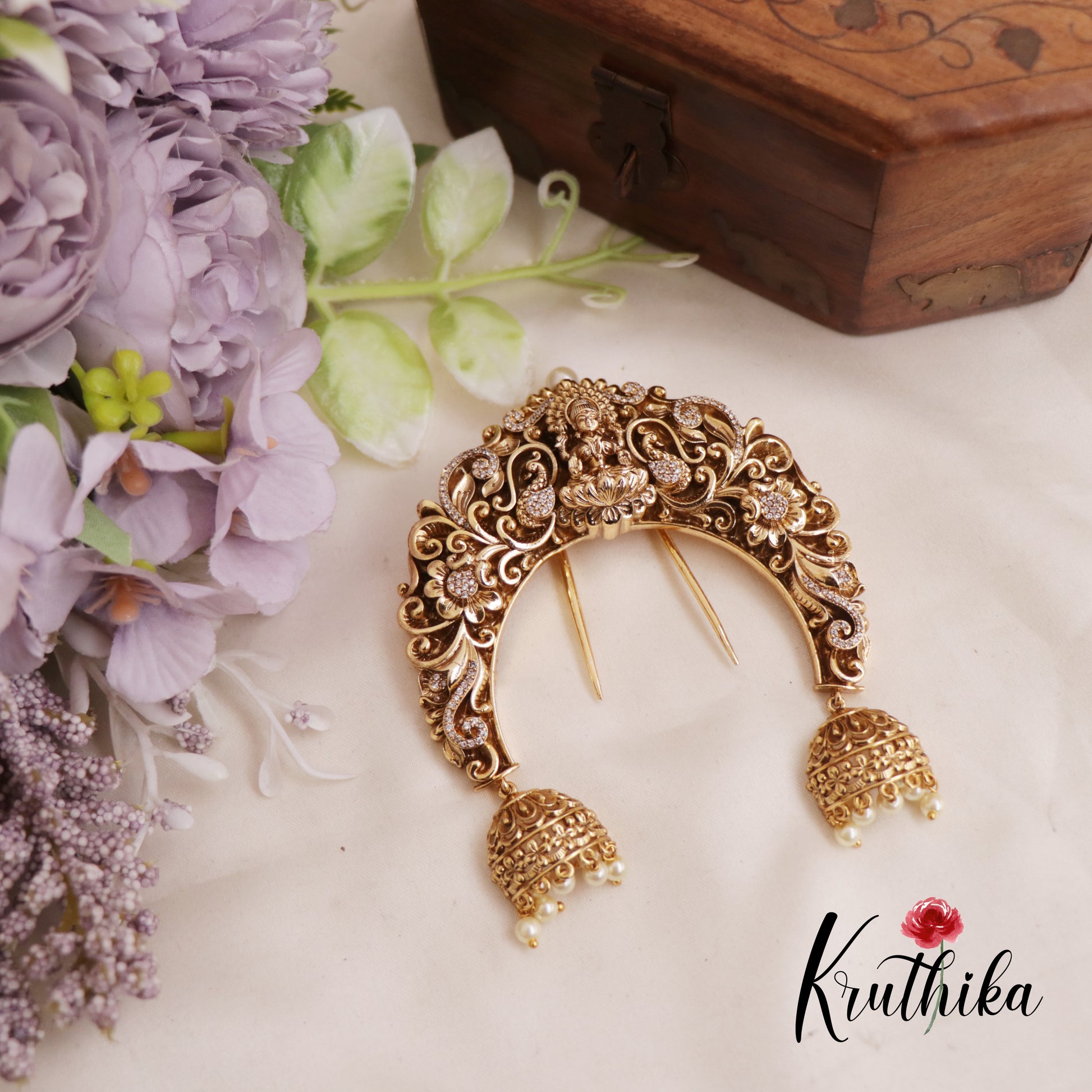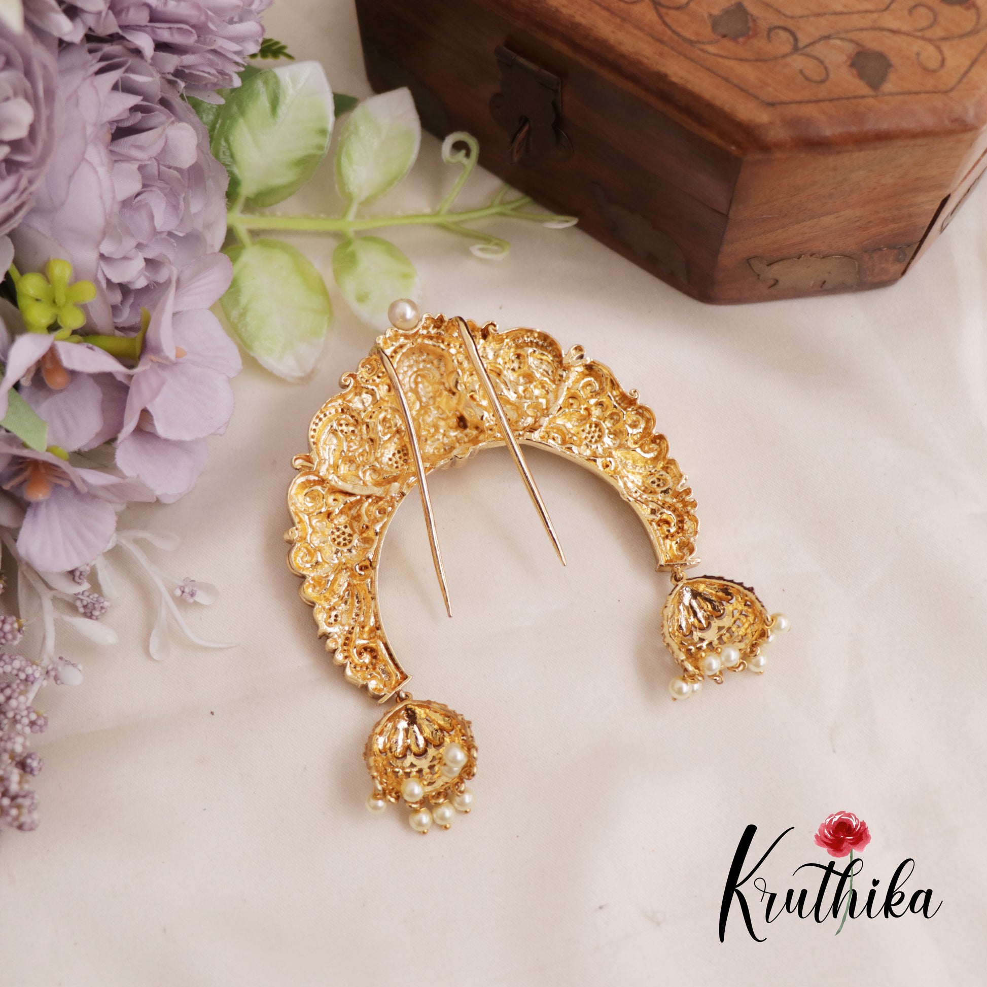This gorgeous Temple style Jada Billa features a majestic crescent design, intricately handcrafted with a traditional Lakshmi motif at its center to symbolize prosperity and grace. Adorned with delicate floral and sparkling stone embellishments, the piece is further enhanced by two dangling half moon shape Jhumkas with pearl clusters that add a rhythmic elegance to any braided hairstyle. Perfect for bridal wear or festive occasions, this gold toned accessory blends timeless South Indian heritage with a sophisticated, antique finish.