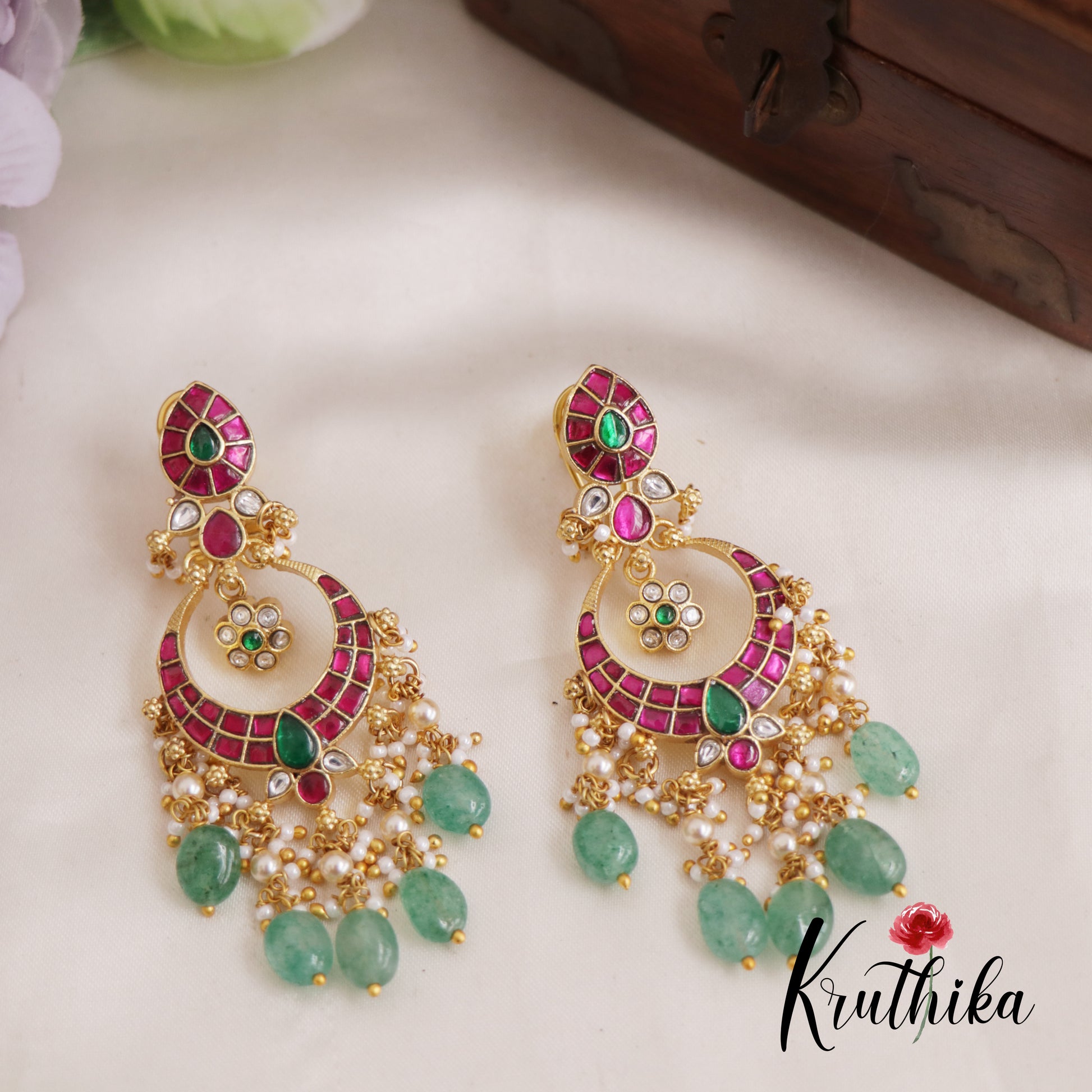 These gorgeous Jadau Chandbali earrings showcase a stunning blend of traditional South Indian craftsmanship and regal aesthetics. Featuring a vibrant palette of ruby red and emerald green stones set in a rich gold finished base, the intricate crescent design is further elevated by delicate pearl clusters and smooth green bead drops. Perfect for festive occasions or weddings, these statement earrings offer a timeless ethnic charm that effortlessly complements silk sarees and traditional ensembles.