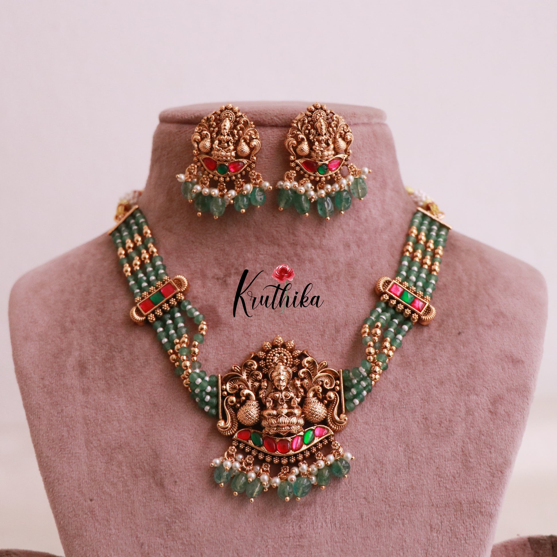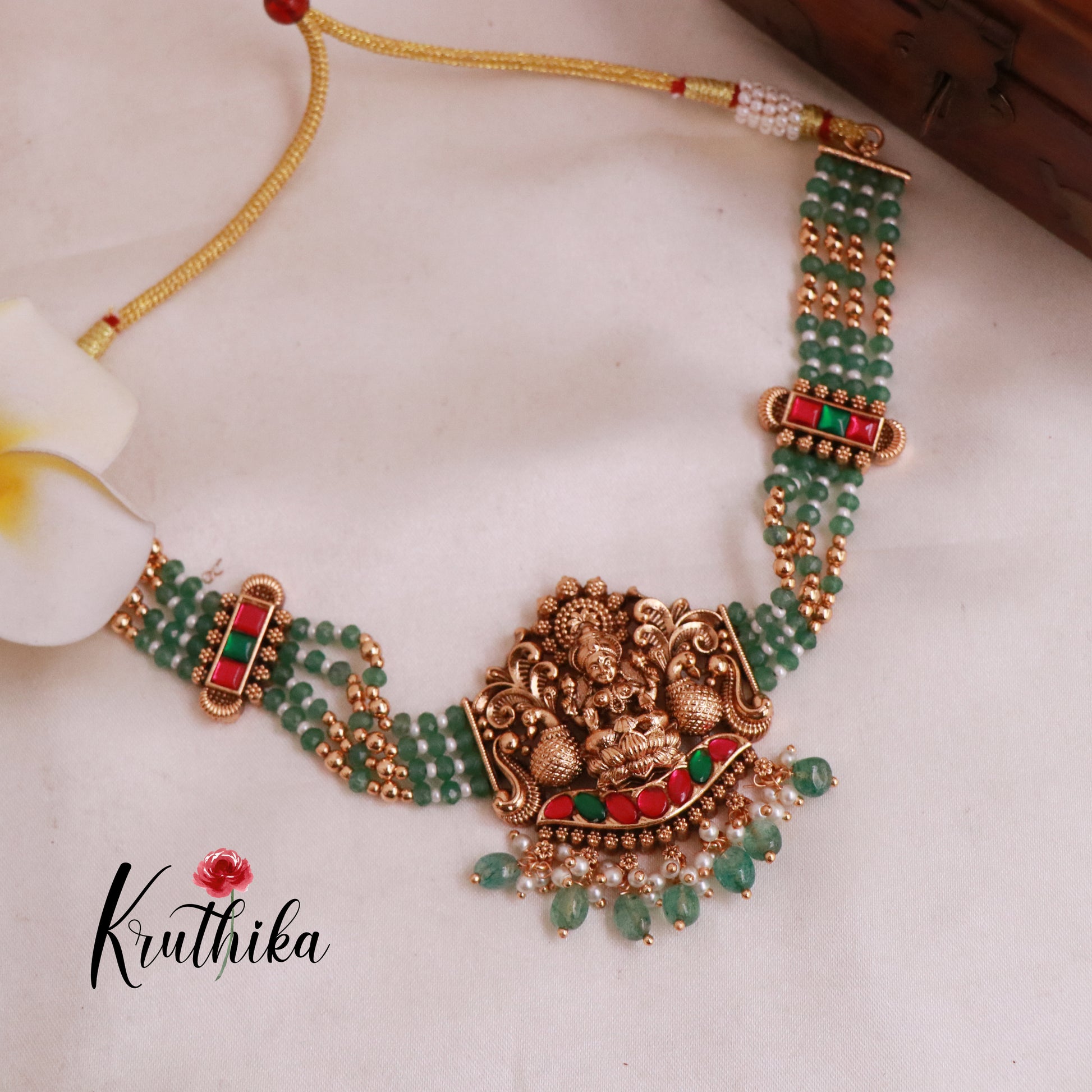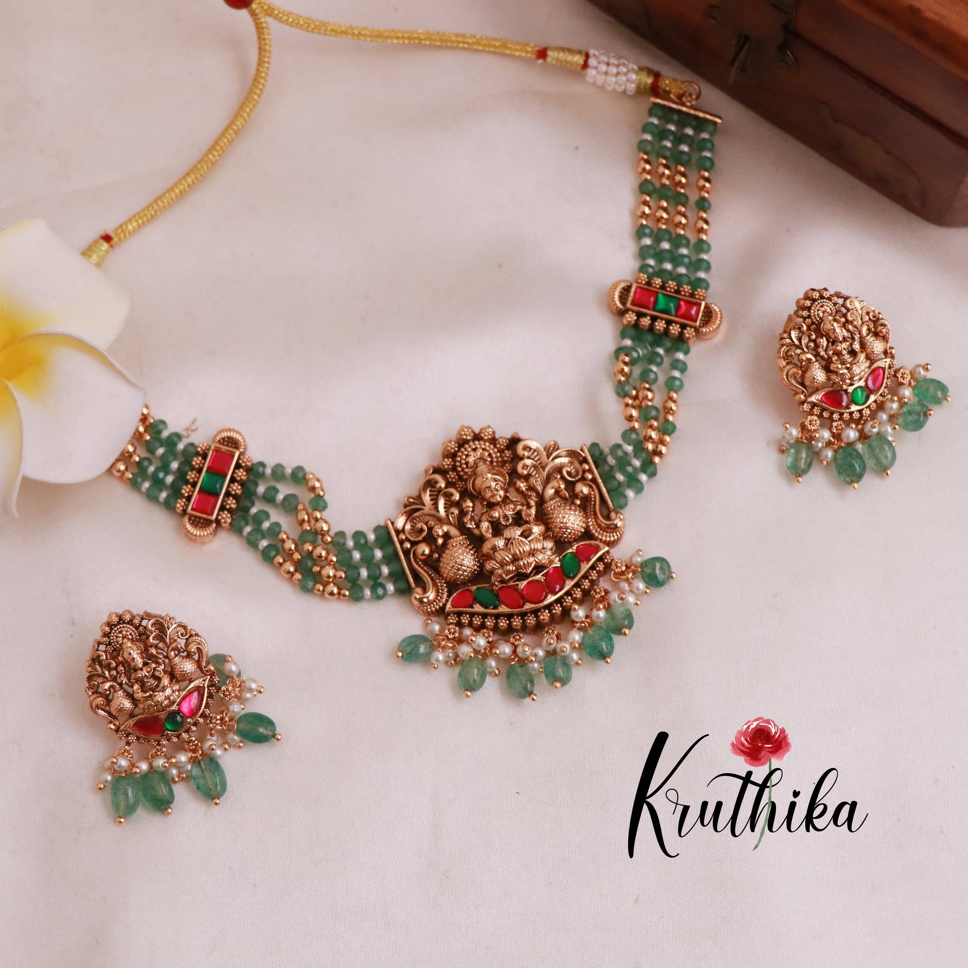 Enhance your style with our stunning Gorgeous green beads Jadau Temple choker paired perfectly with matching earrings. Crafted with high-quality stones & beads, this set combines timeless elegance with a modern touch. Ideal for special occasions or adding a touch of glamour to your look.
