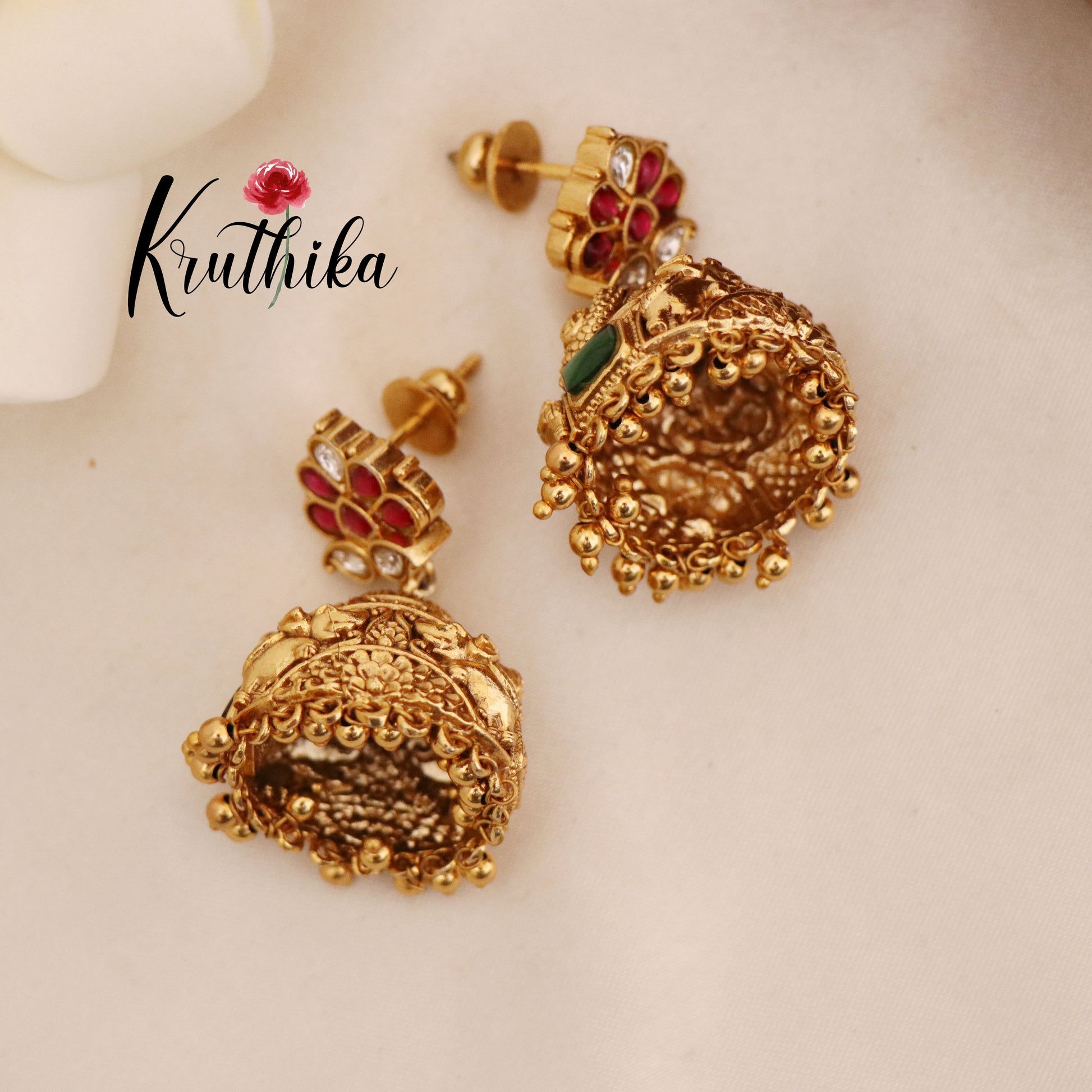 Elevate your elegance with our Premium Temple Jhumkas with golden bead drops,designed to capture the essence of