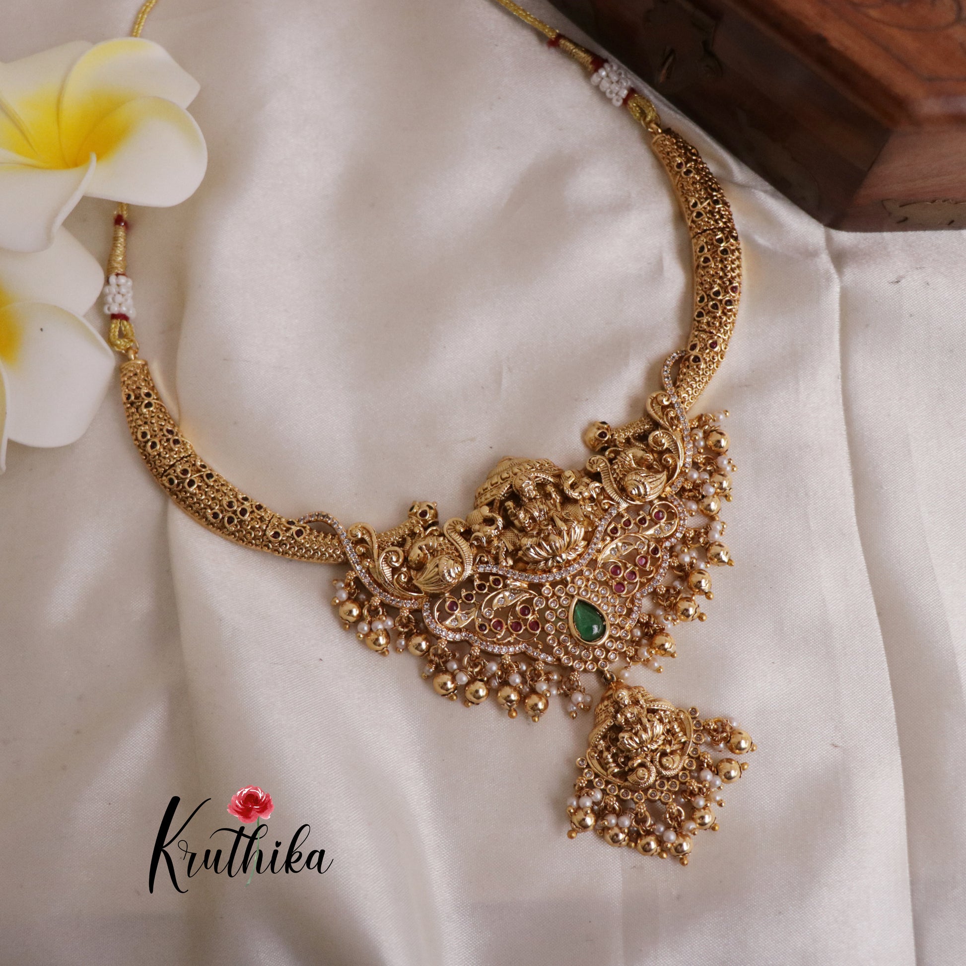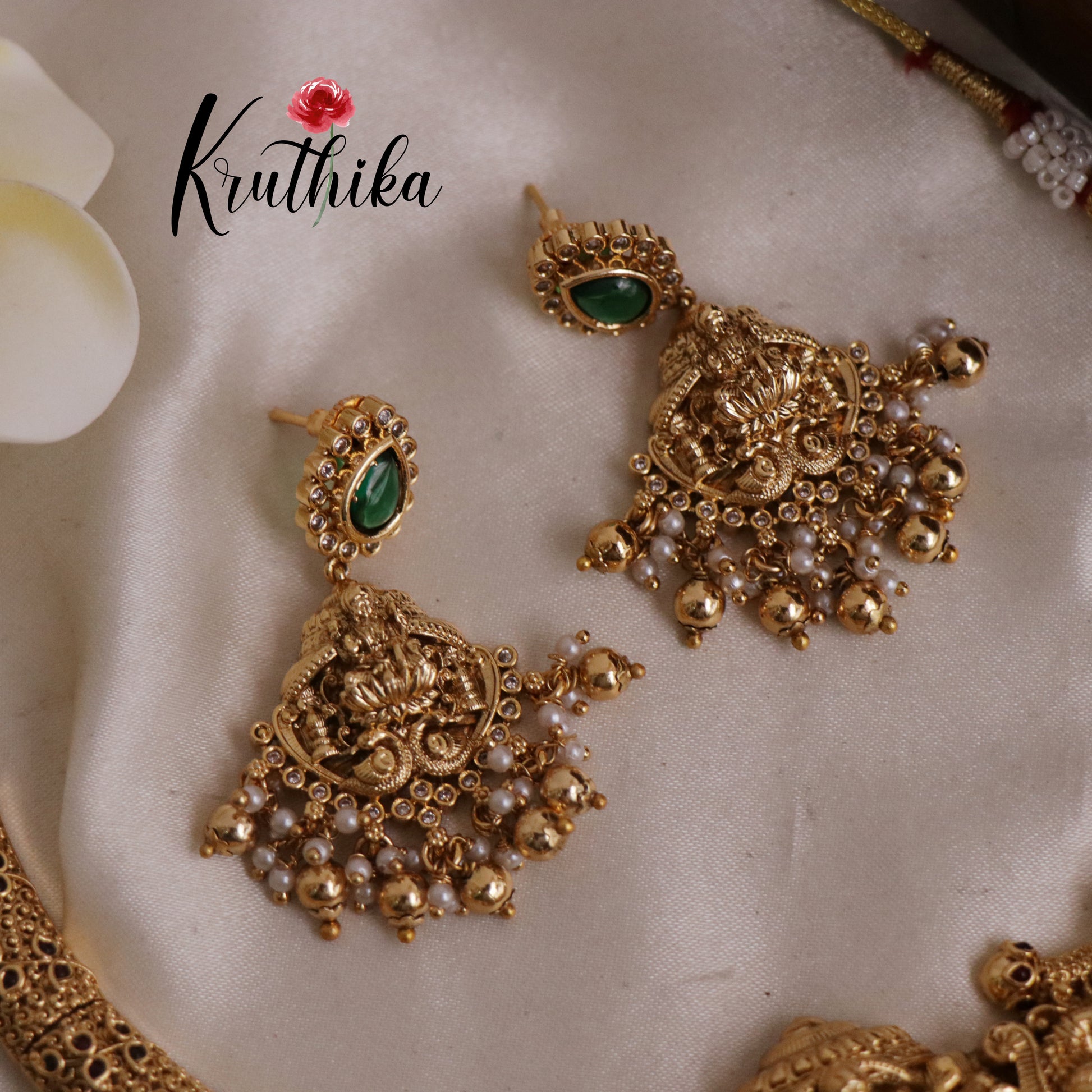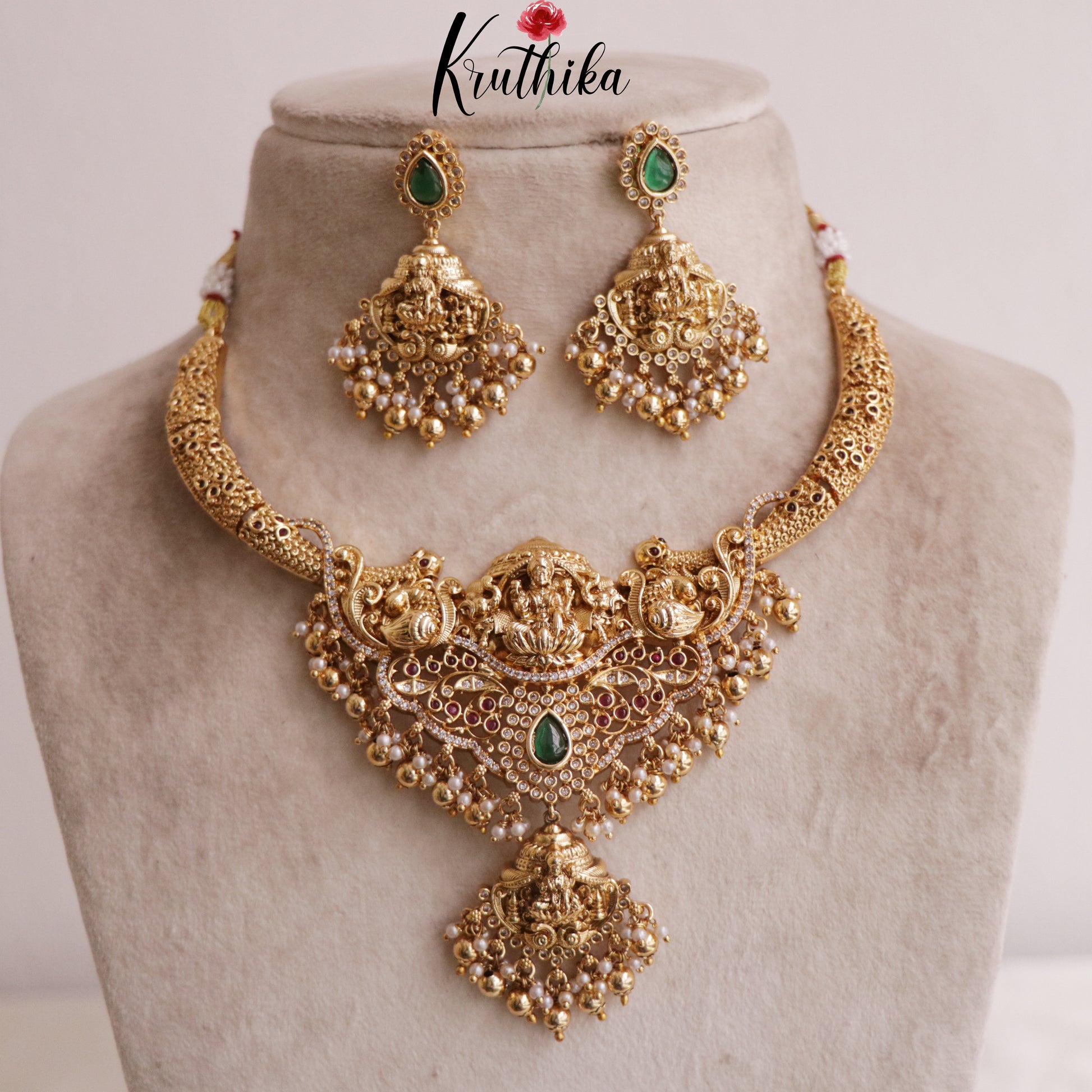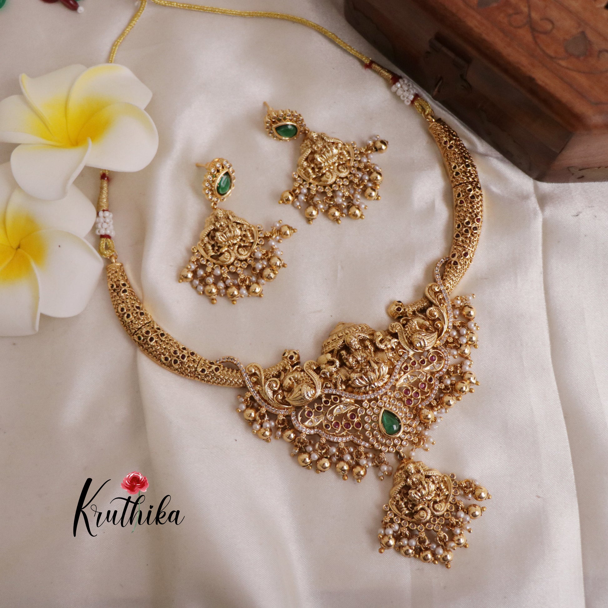 Enhance your style with our stunning, Gorgeous Lakshmi peacock necklace with golden beads crafted with high-quality stones, this set combines timeless elegance with a modern touch. Ideal for special occasions or adding a touch of glamour to your look.