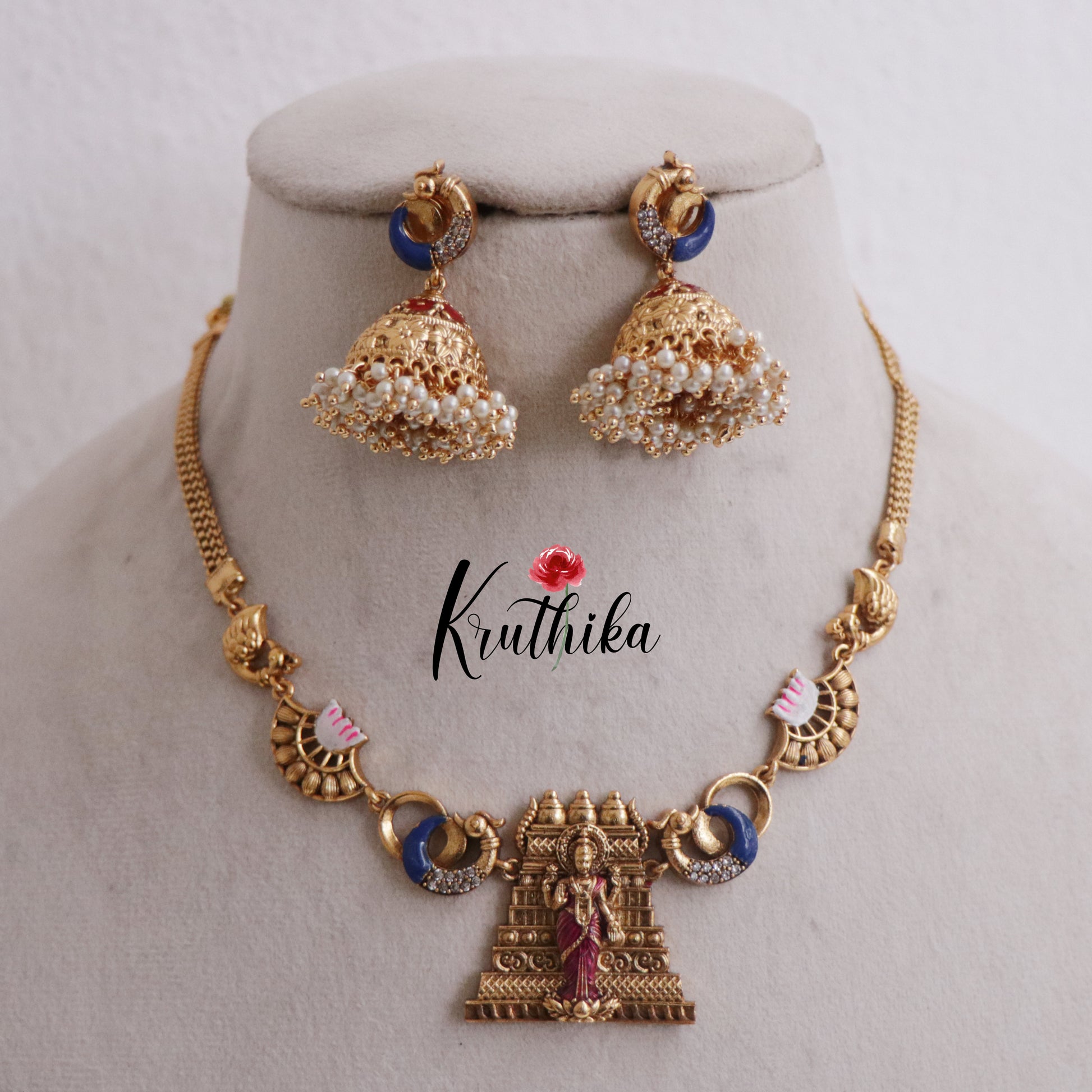 Enhance your style with our stunning Gorgeous Temple Lakshmi Devi Peacock Pendant Necklace and Jhumka Earring Set Paired perfectly with matching earrings. Crafted with high-quality stones & beads, this set combines timeless elegance with a modern touch. Ideal for special occasions or adding a touch of glamour to your look.