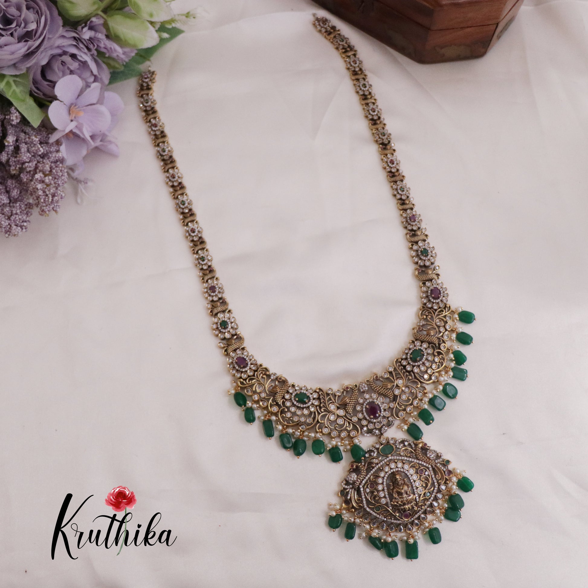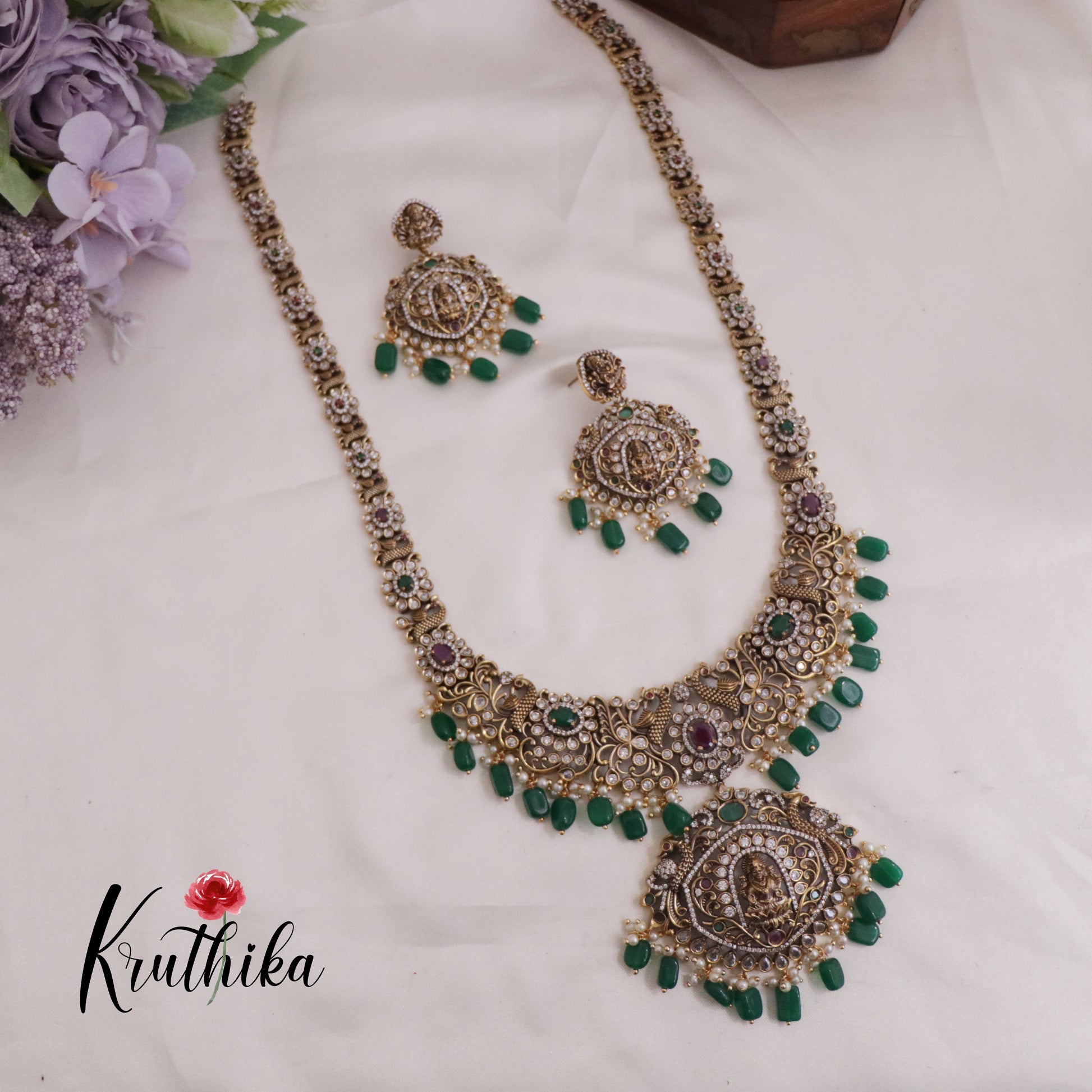 Enhance your style with our stunning Grand AD Victorian Finish Lakshmi Pendant Haram with Beads Drops paired perfectly with matching earrings. Crafted with high-quality stones & beads, this set combines timeless elegance with a modern touch. Ideal for special occasions or adding a touch of glamour to your look.