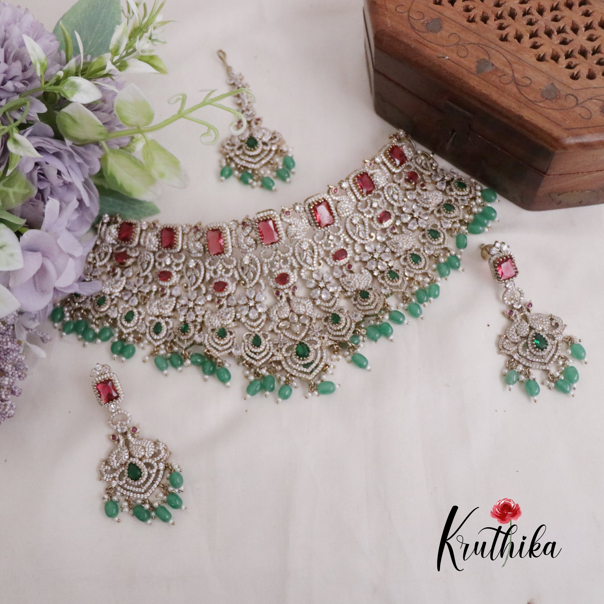 Enhance your style with our stunning Grand Bridal AD/Victorian Multi Stone Necklace with Pair of Earrings & Maang Tikka Crafted with high-quality stones & beads, this set combines timeless elegance with a modern touch. Ideal for special occasions or adding a touch of glamour to your look.