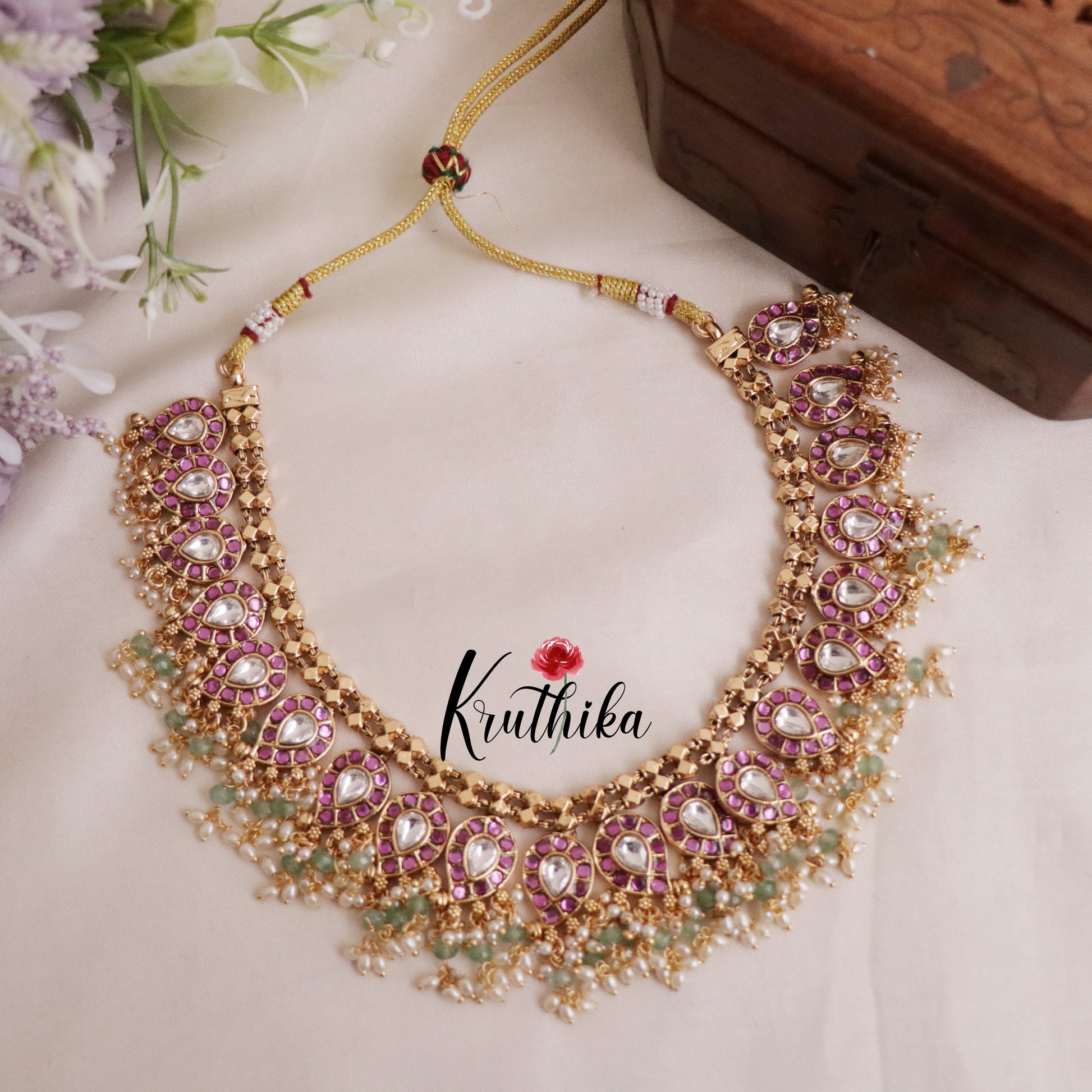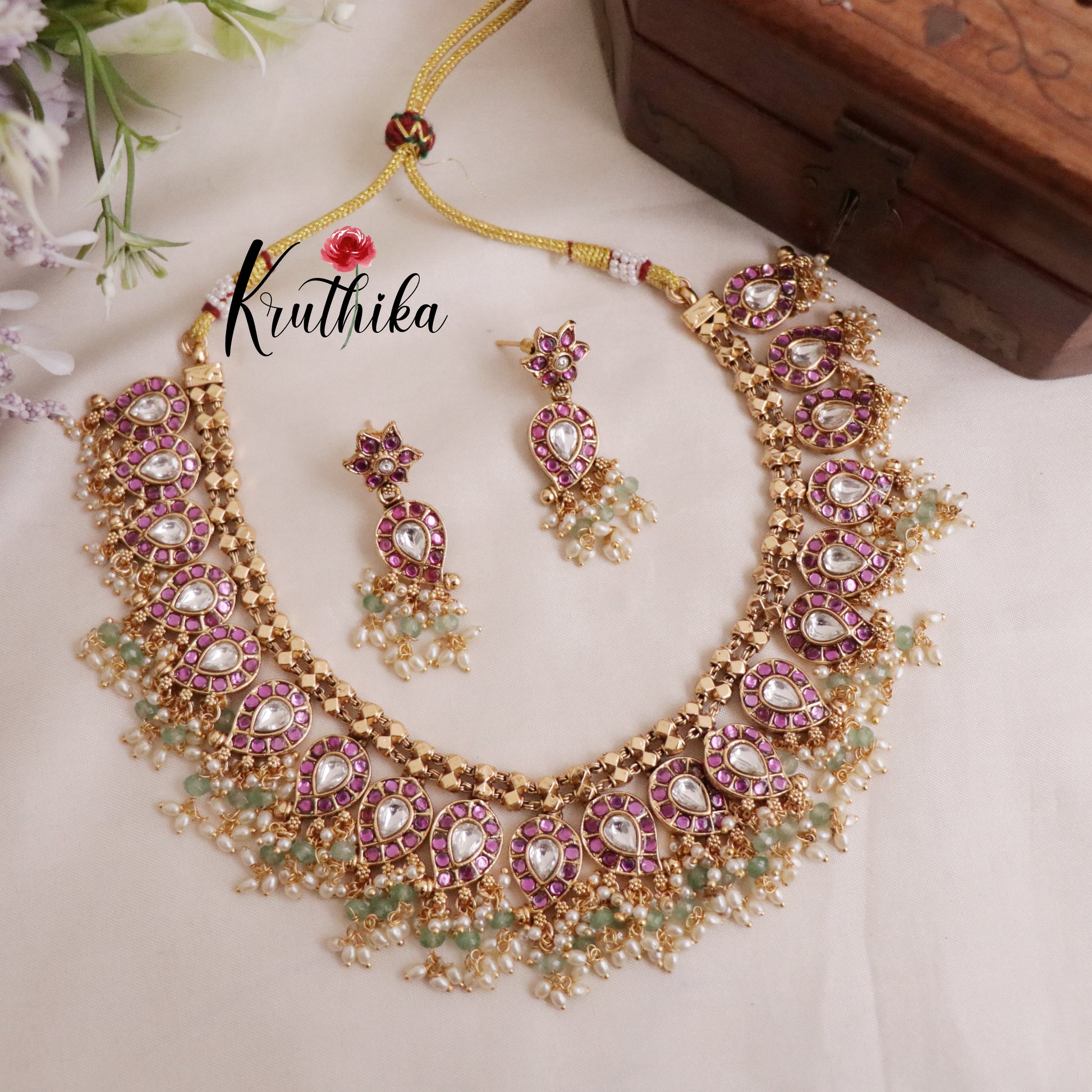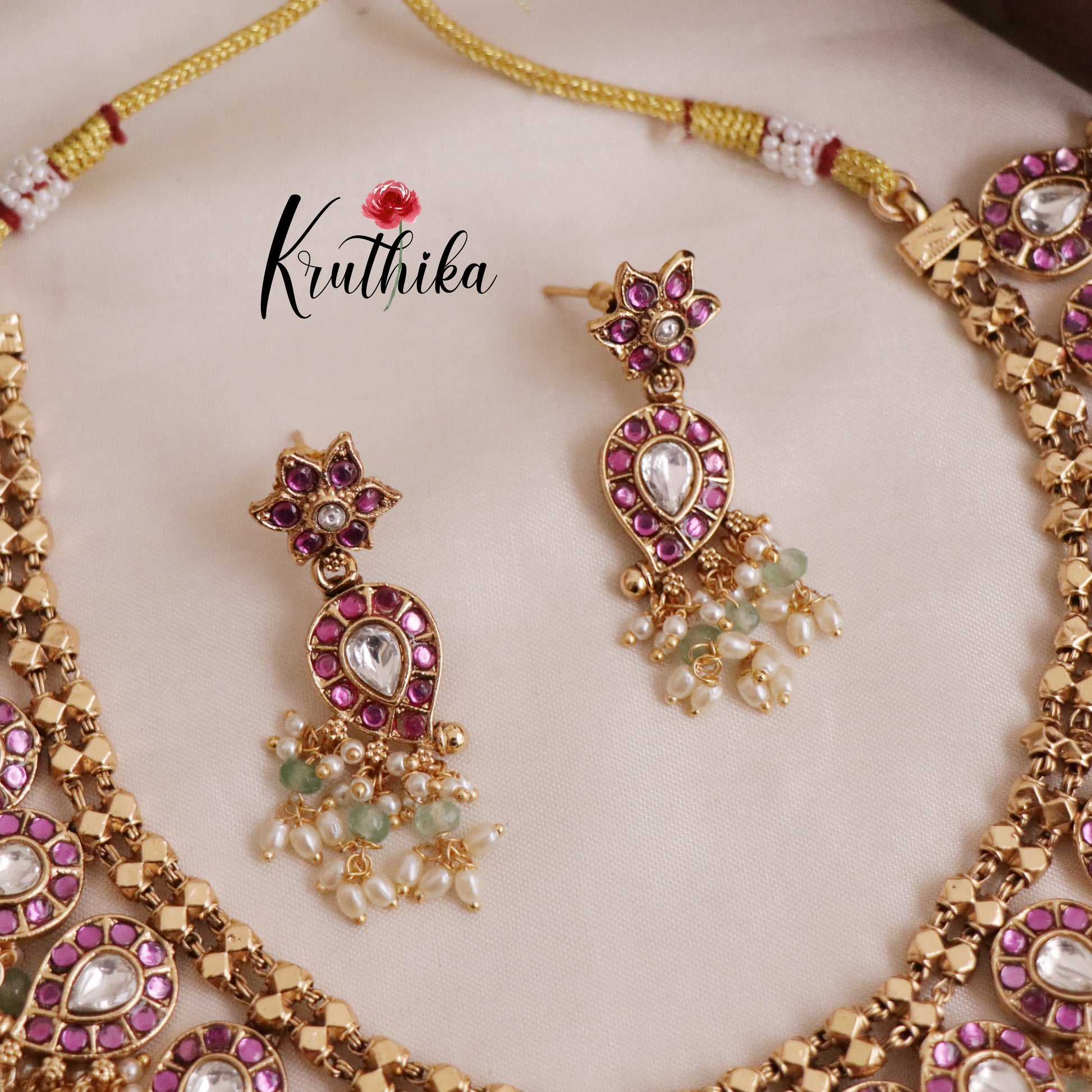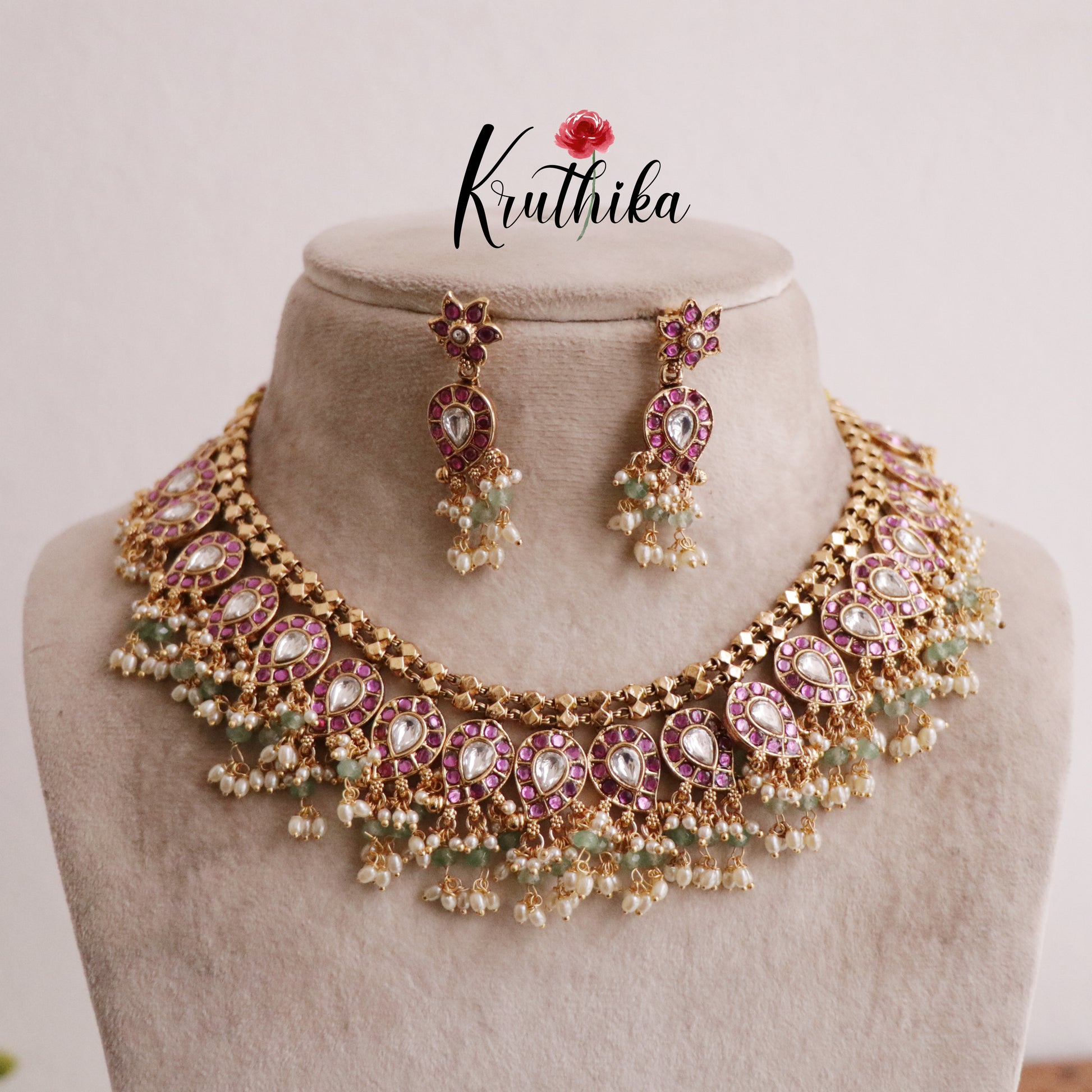 Enhance your style with our stunning, Elegant AD Ruby Guttapoosalu Necklace paired perfectly with matching earrings. Crafted with high-quality stones & beads, this set combines timeless elegance with a modern touch. Ideal for special occasions or adding a touch of glamour to your look.