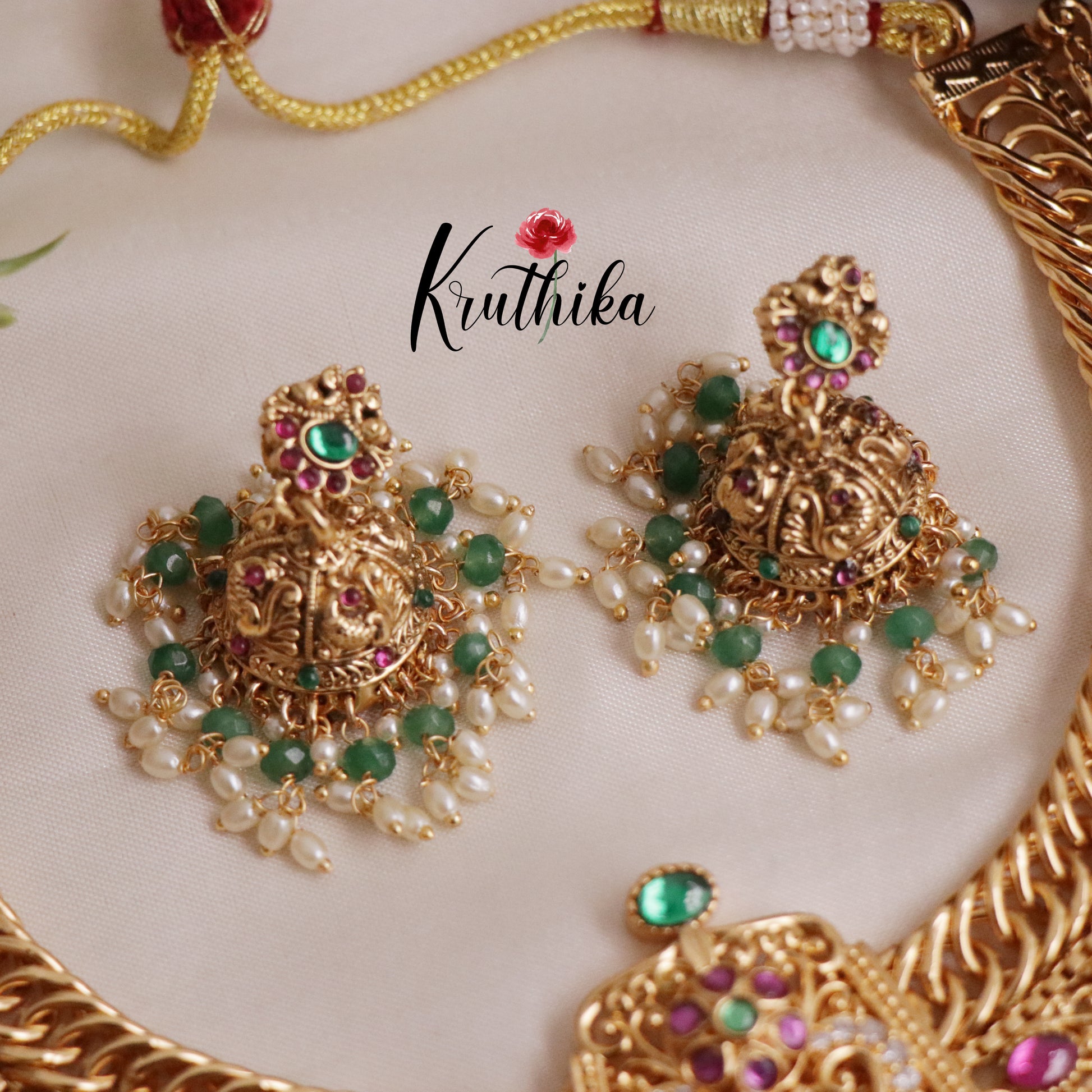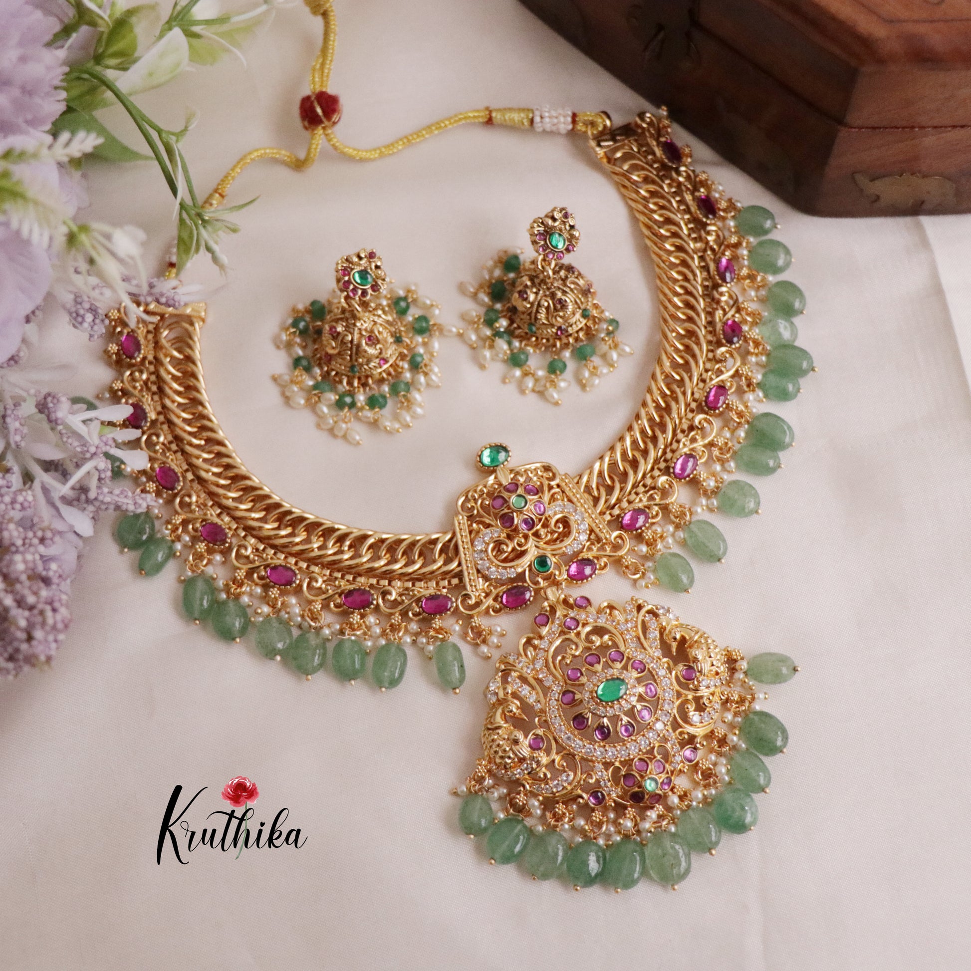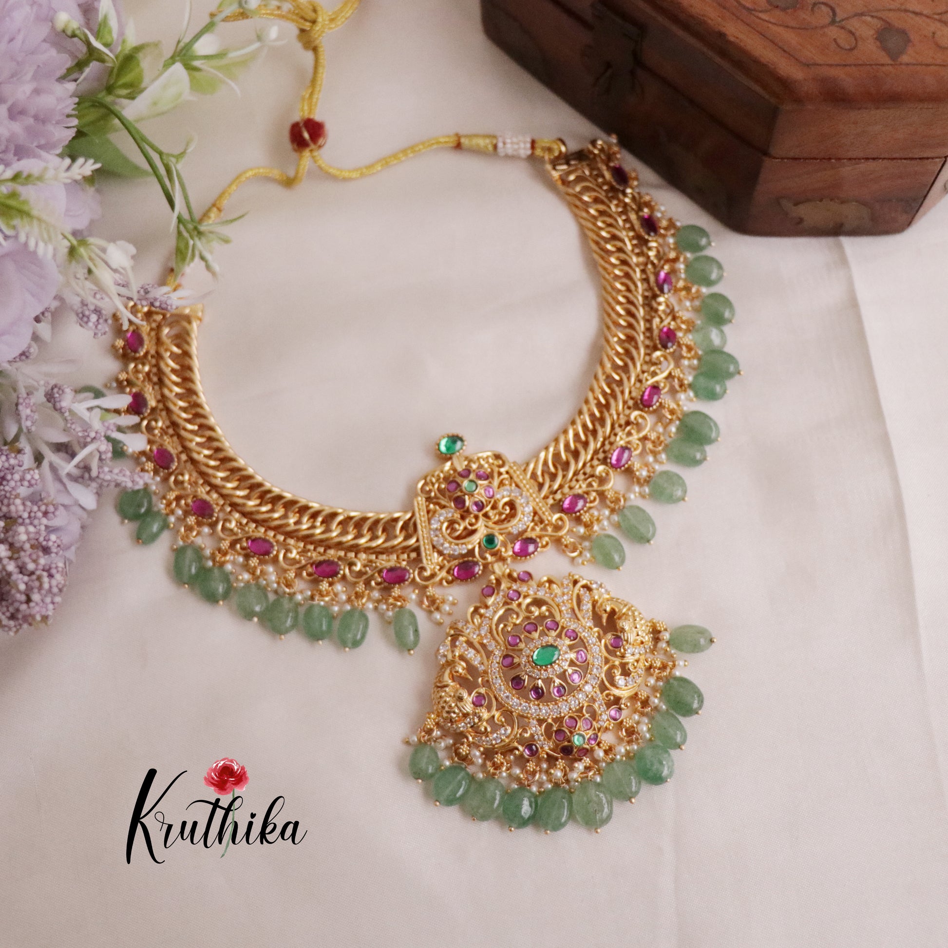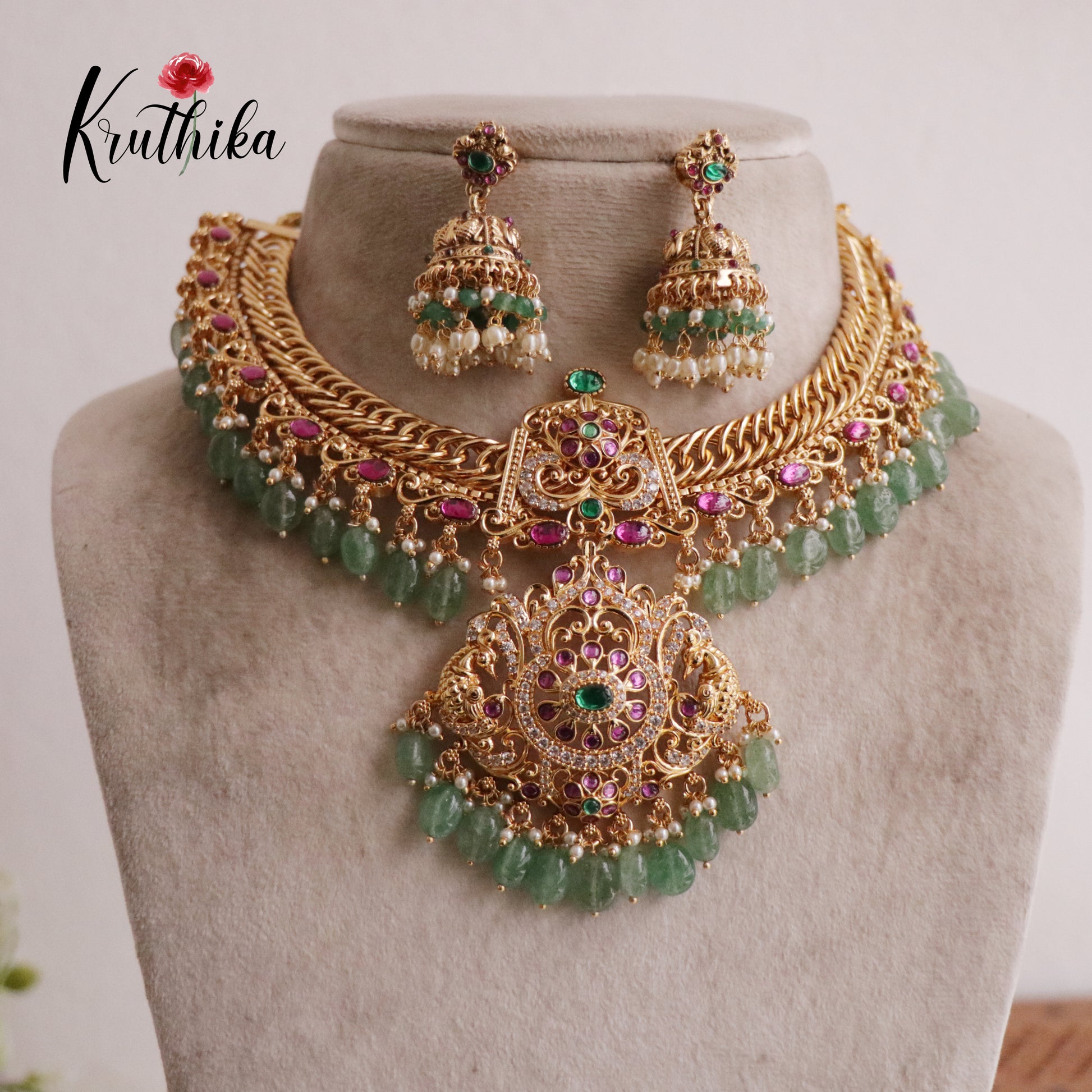 Enhance your style with our stunning, Grand Jadau peacock Jalebi style Necklace with Mint Beads paired perfectly with matching earrings. Crafted with high-quality stones & beads, this set combines timeless elegance with a modern touch. Ideal for special occasions or adding a touch of glamour to your look.