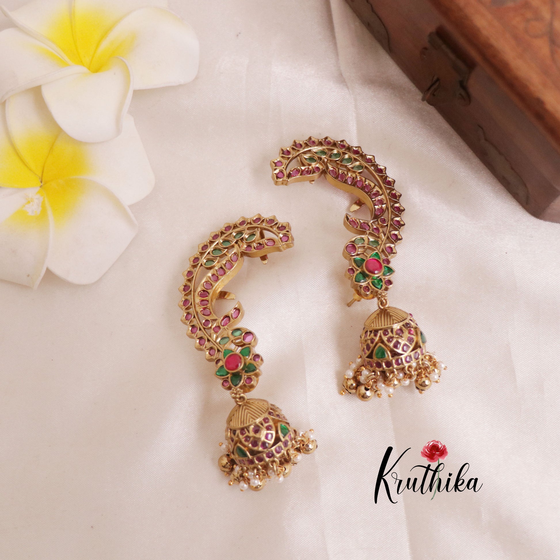 Elevate your elegance with our stunning, Grand Jadau Peacock Jhumkas earcuff ,   designed to capture the essence of
