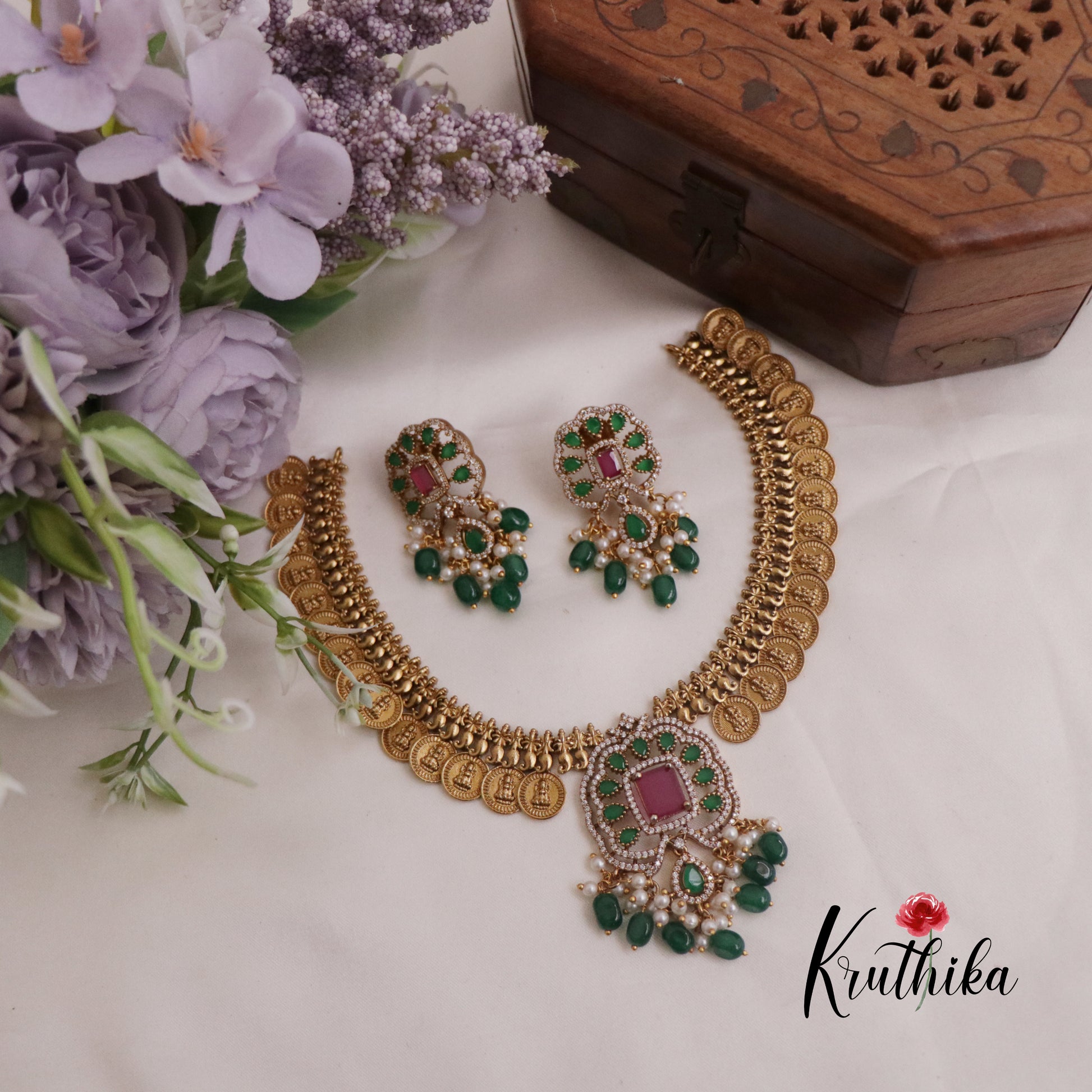 Enhance your style with our stunning Grand AD Lakshmi Coin Necklace with Victorian Pendant Green Beads Drop paired perfectly with matching earrings. Crafted with high-quality stones & beads, this set combines timeless elegance with a modern touch. Ideal for special occasions or adding a touch of glamour to your look.