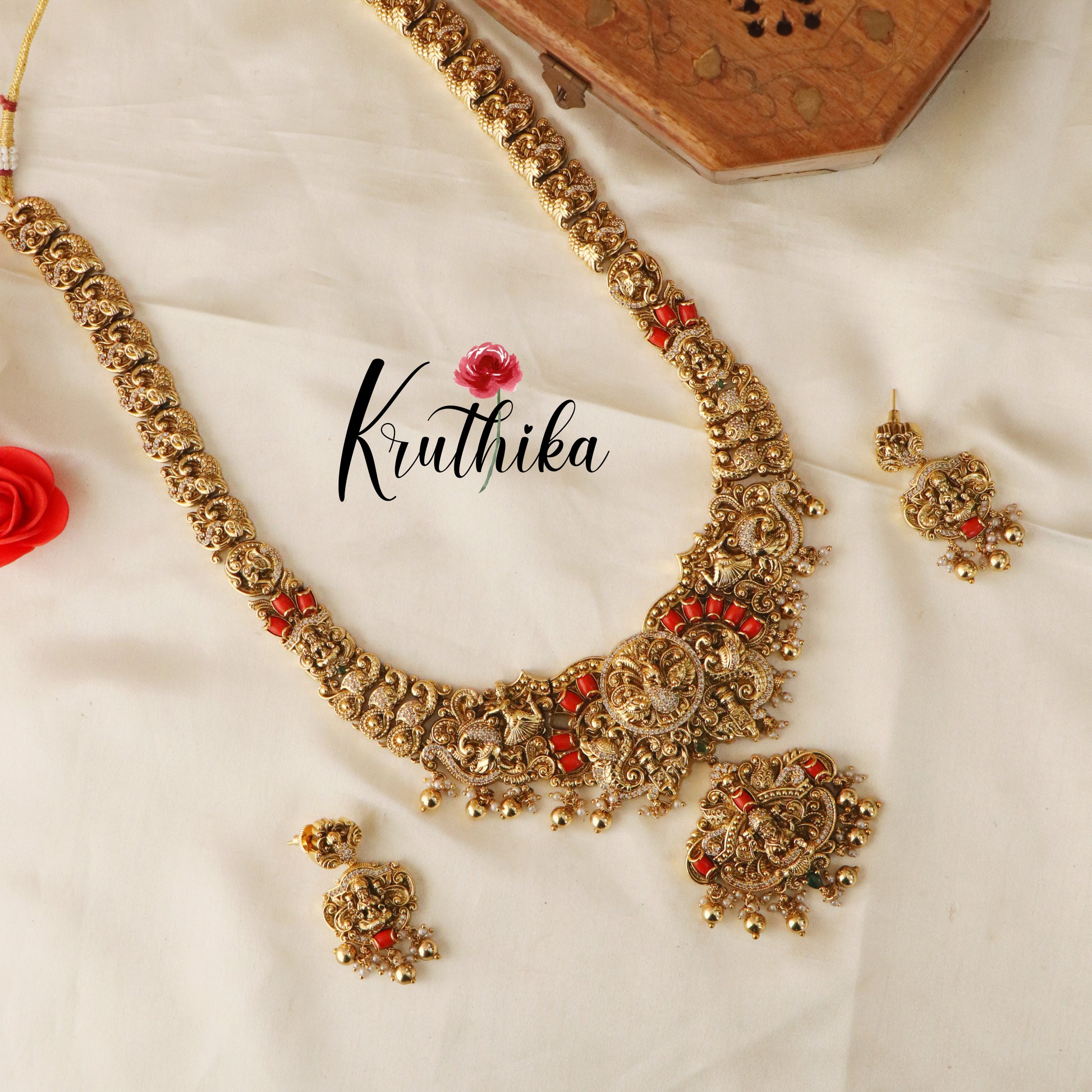 Enhance your style with our stunning, Grand Lakshmi Elephants Coral stone Haram paired perfectly with matching earrings. Crafted with high-quality stones & beads, this set combines timeless elegance with a modern touch. Ideal for special occasions or adding a touch of glamour to your look.