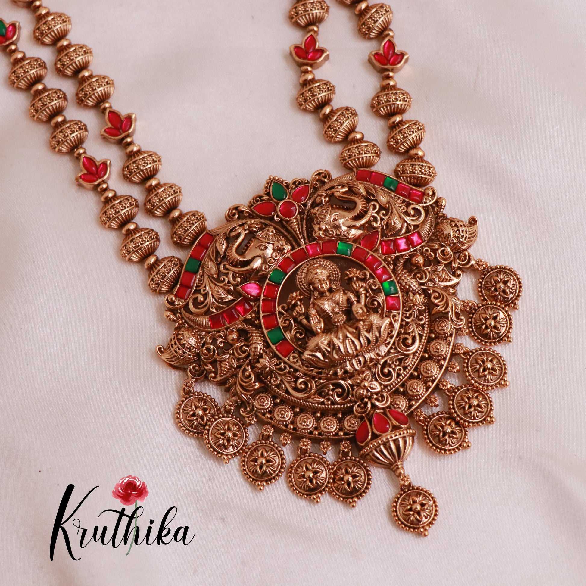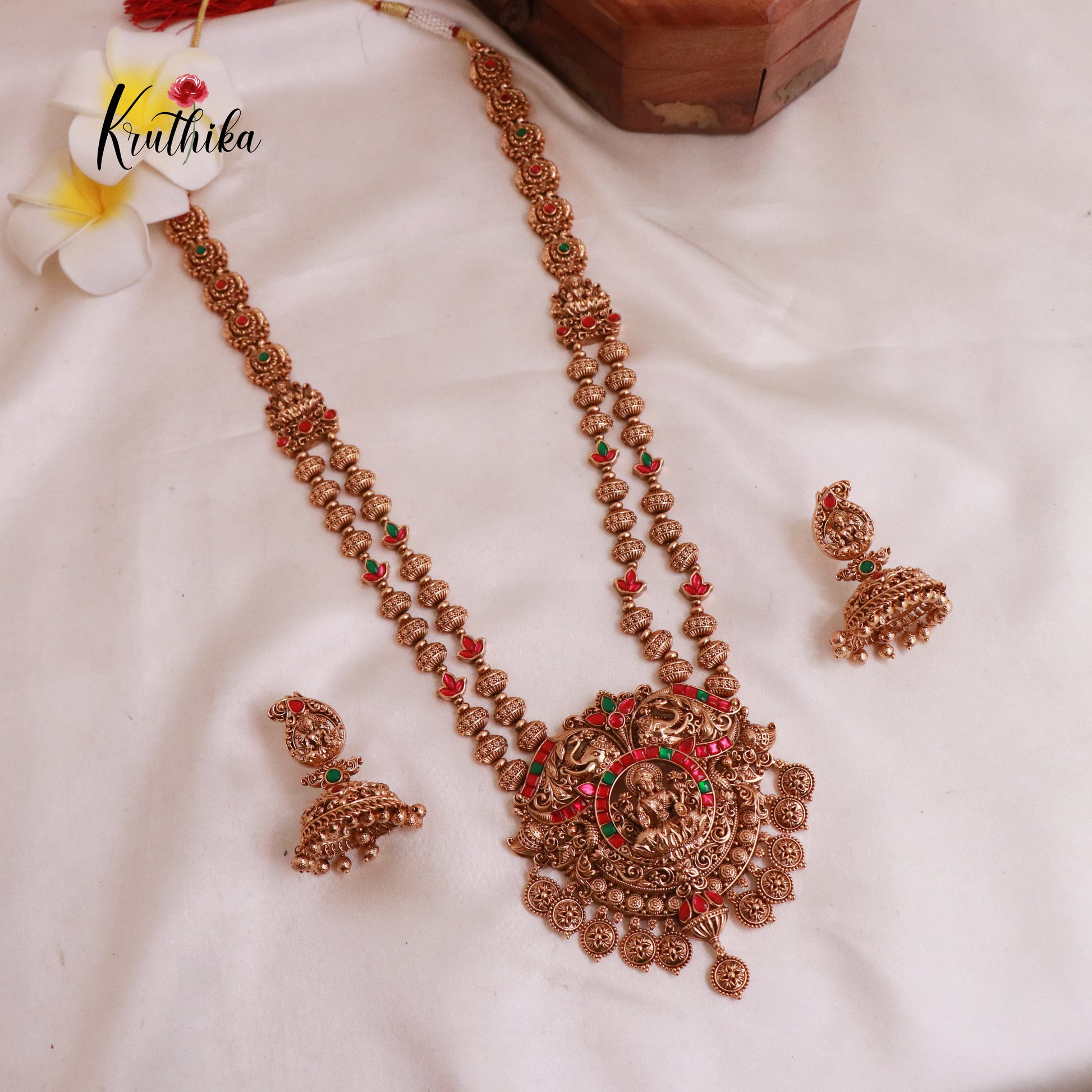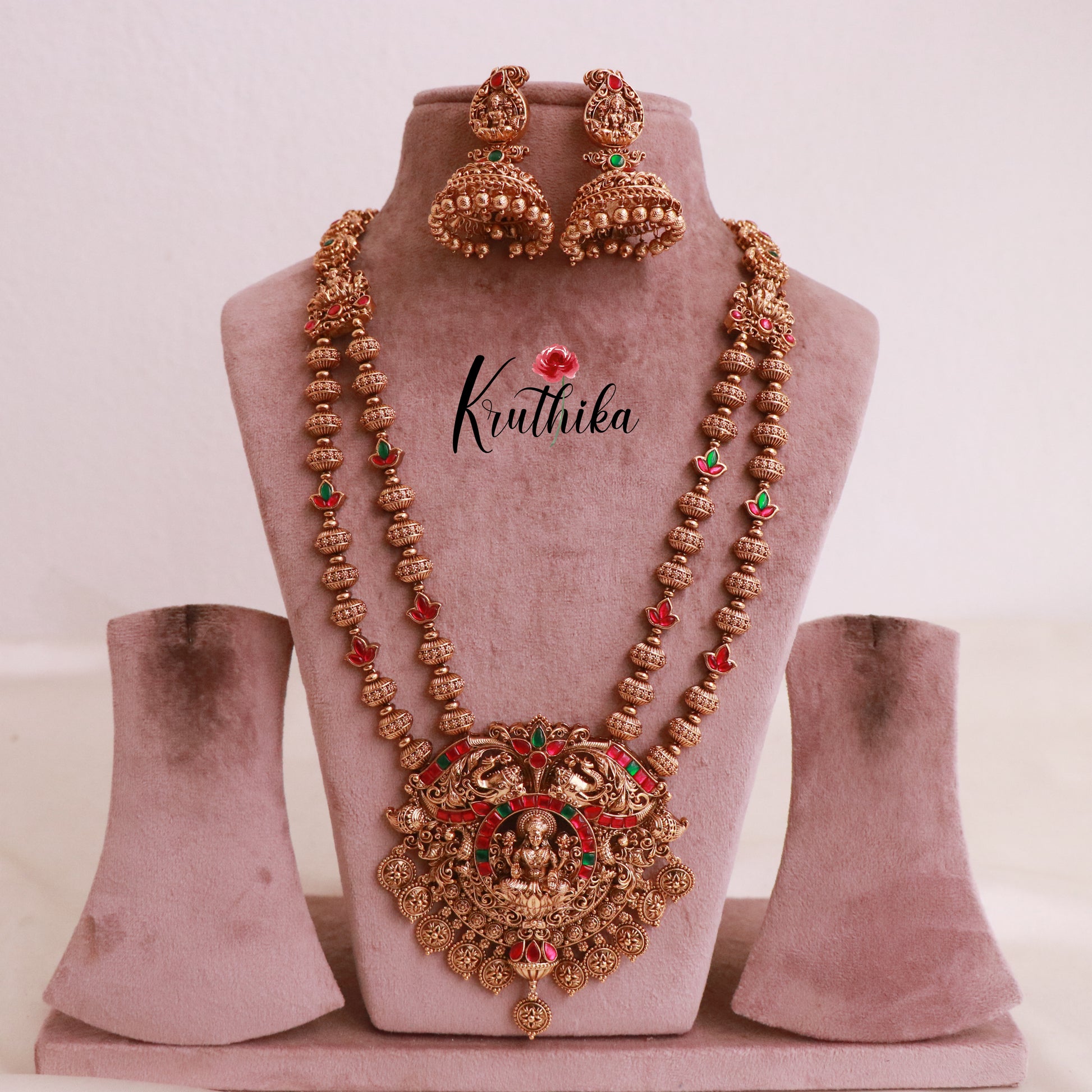 Enhance your style with our stunning, Grand Lakshmi Jadau Beads Haram , paired perfectly with matching earrings. Crafted with high-quality stones & beads, this set combines timeless elegance with a modern touch. Ideal for special occasions or adding a touch of glamour to your look.