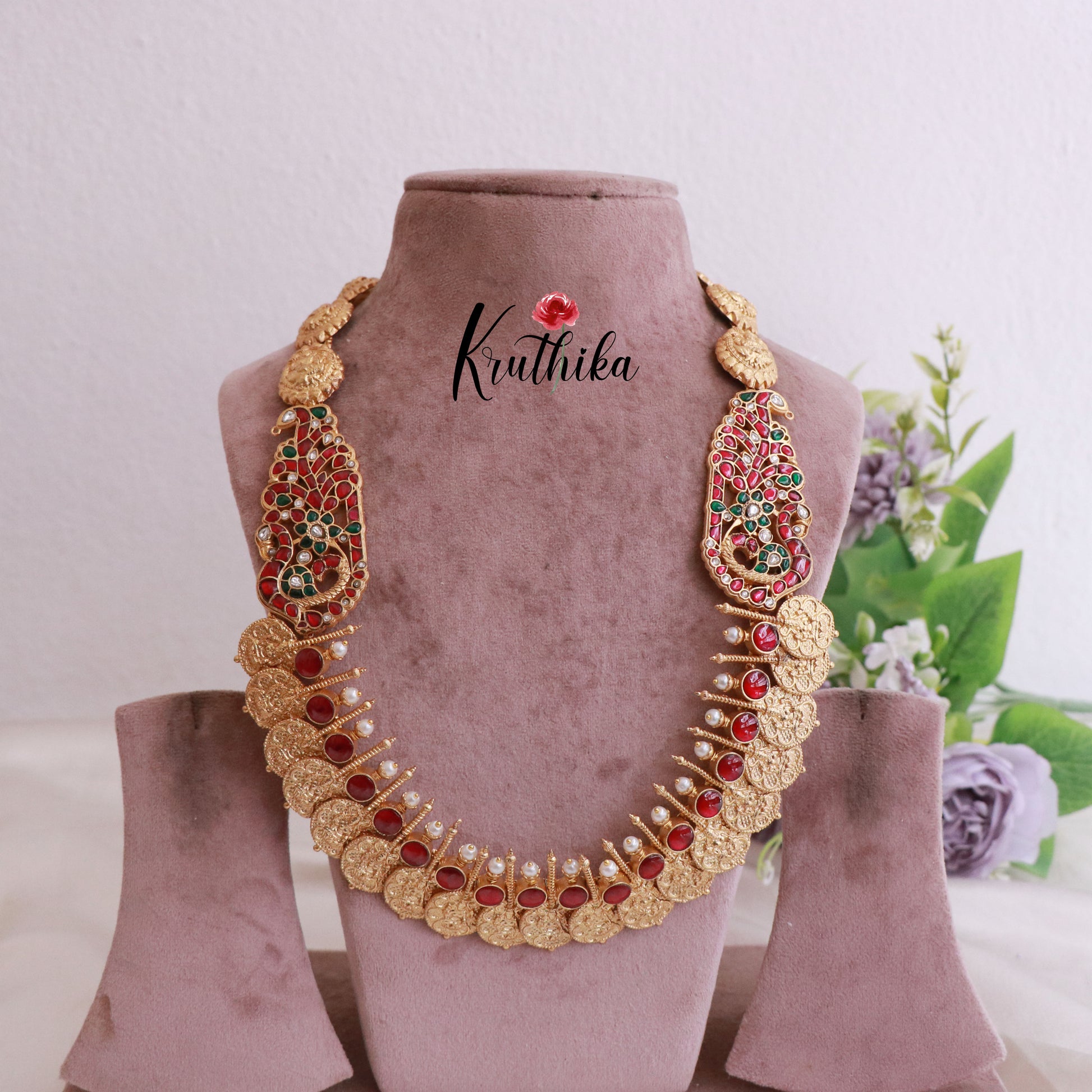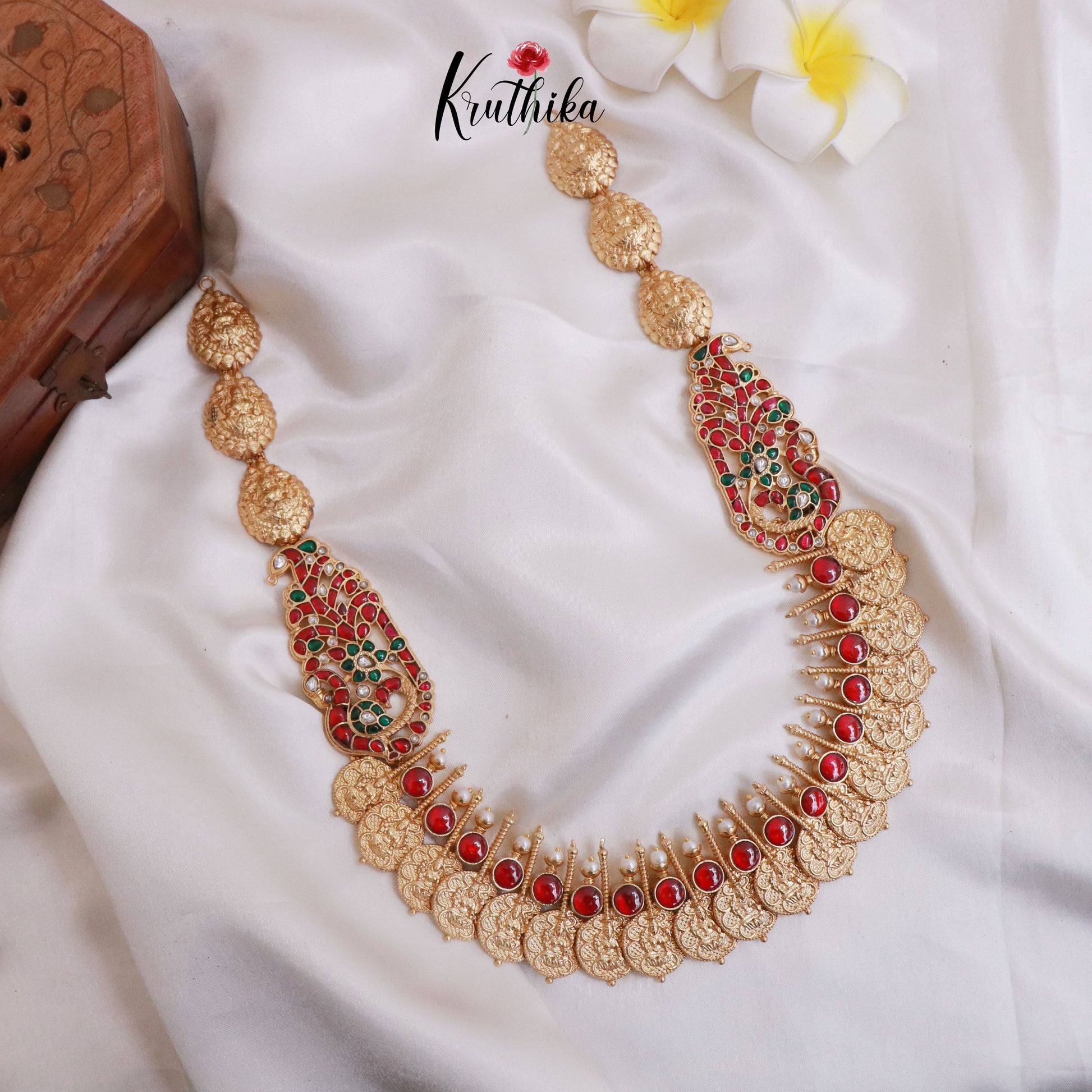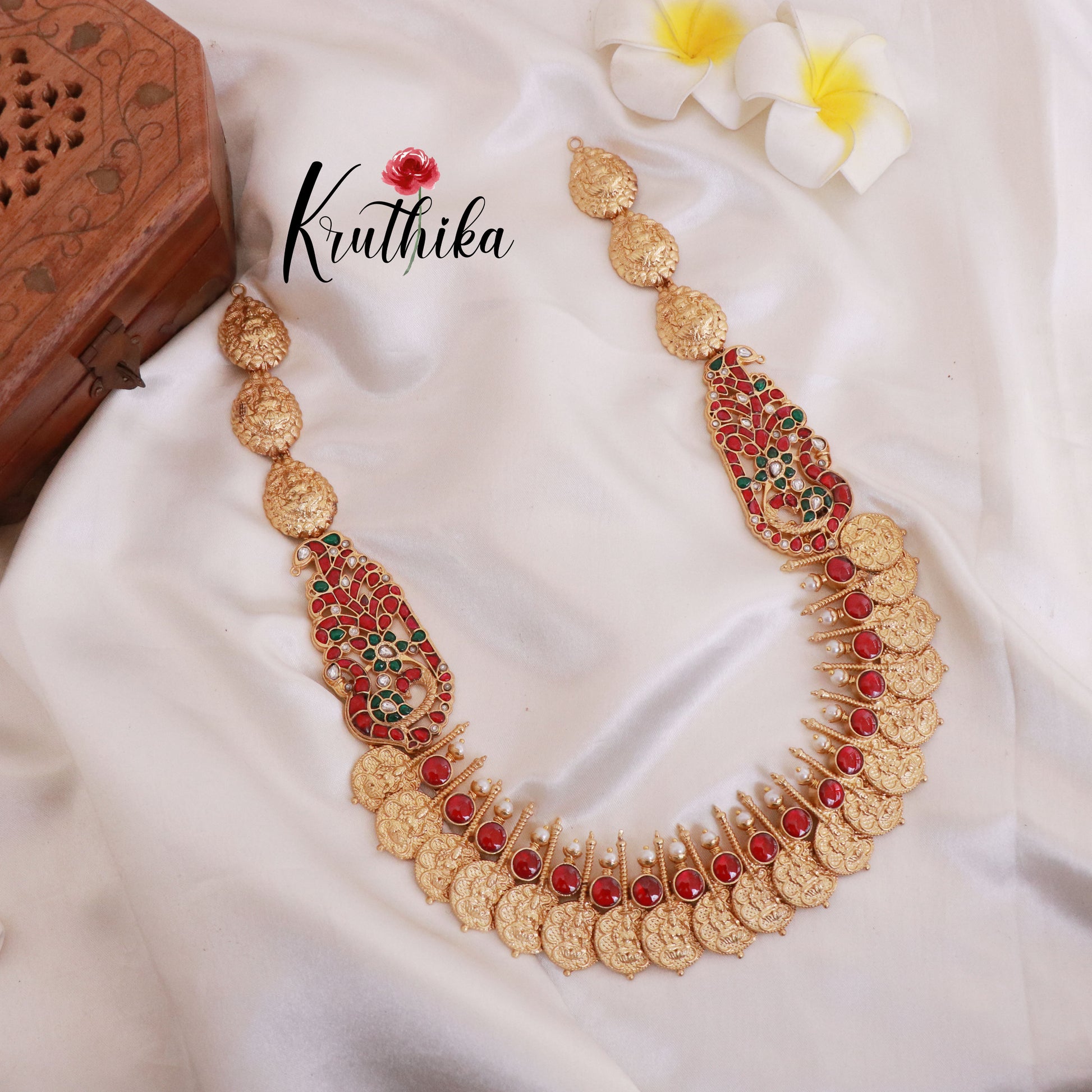 Enhance your style with our stunning, Grand Lakshmi Peacock Jadau Kasu Haram . Crafted with high-quality stones & beads, this set combines timeless elegance with a modern touch. Ideal for special occasions or adding a touch of glamour to your look.