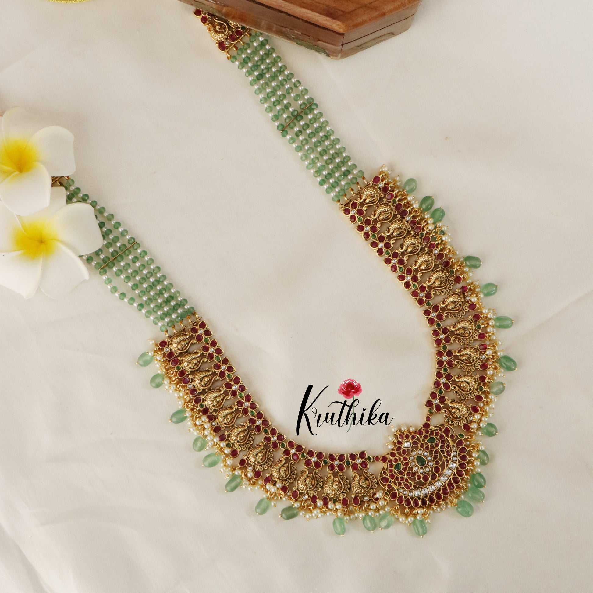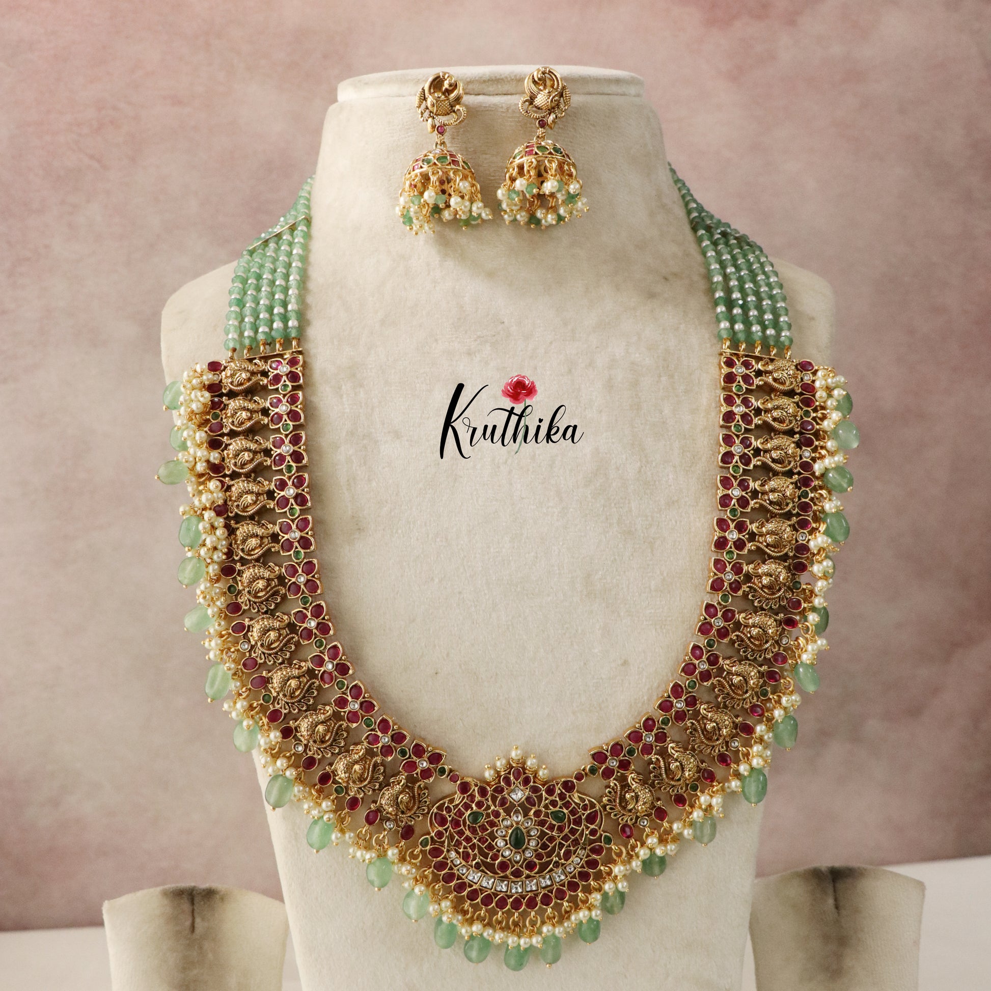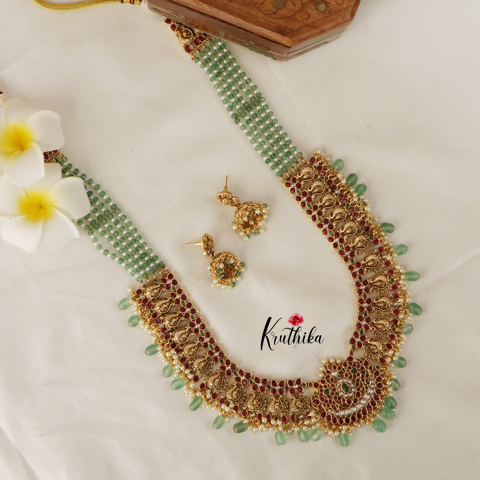 Enhance your style with our stunning, Grand Onyx Beads Peacock Kempu Haaram , paired perfectly with matching earrings. Crafted with high-quality stones & beads, this set combines timeless elegance with a modern touch. Ideal for special occasions or adding a touch of glamour to your look.