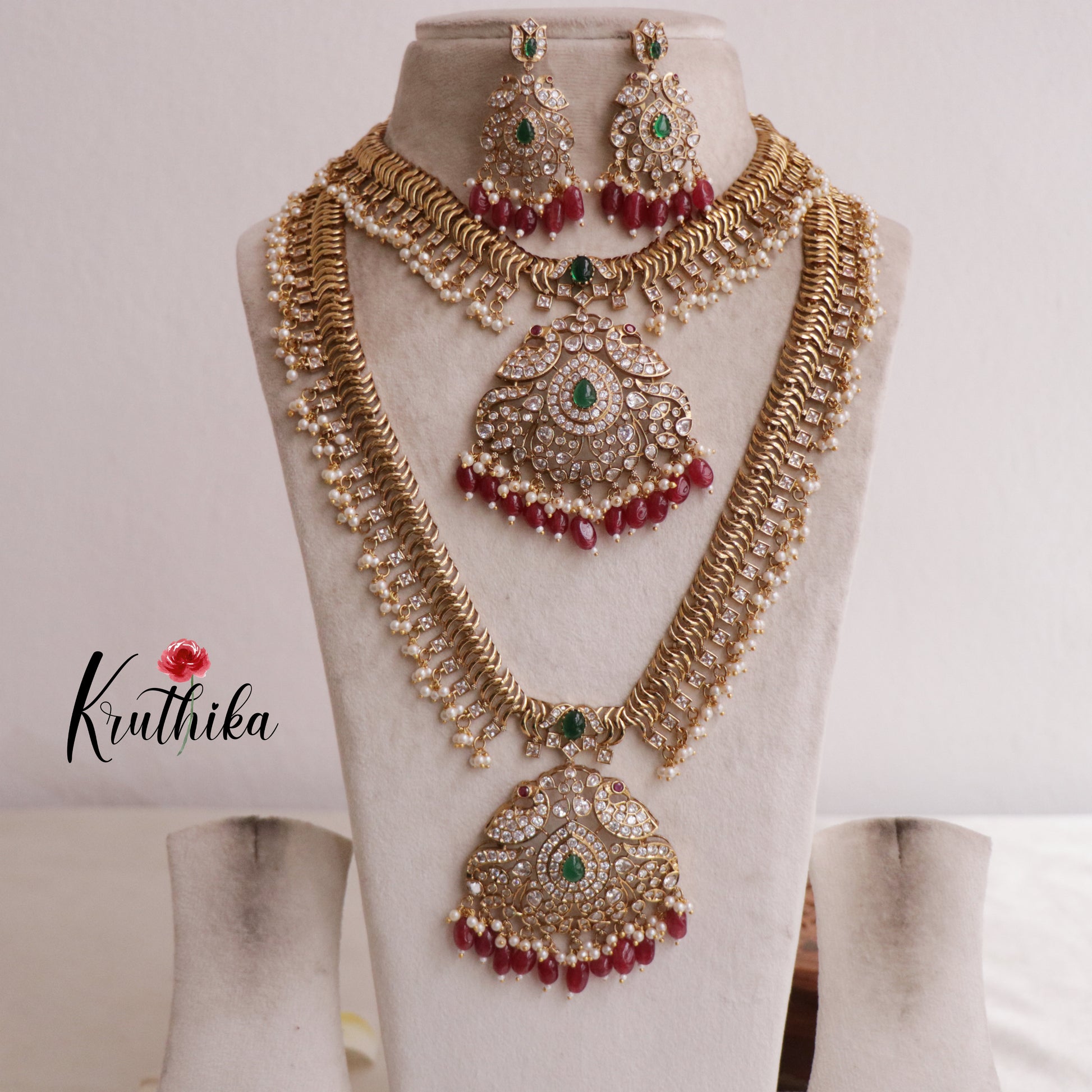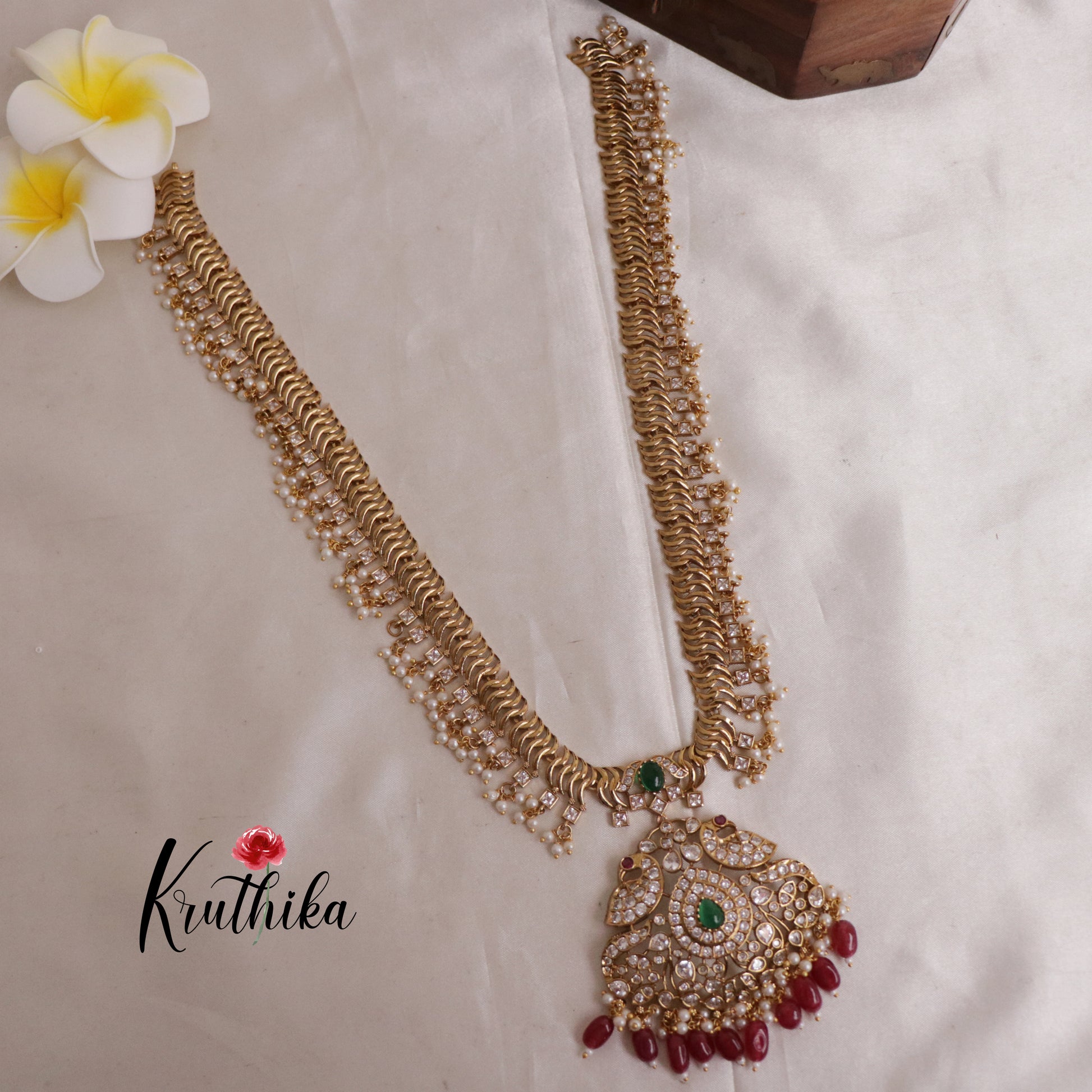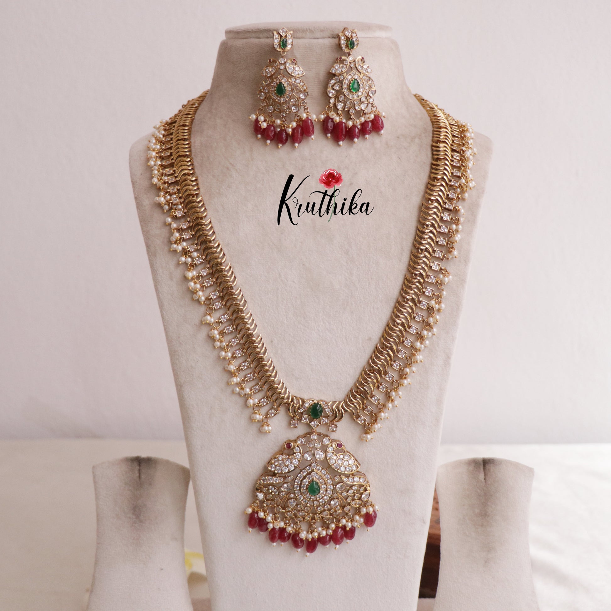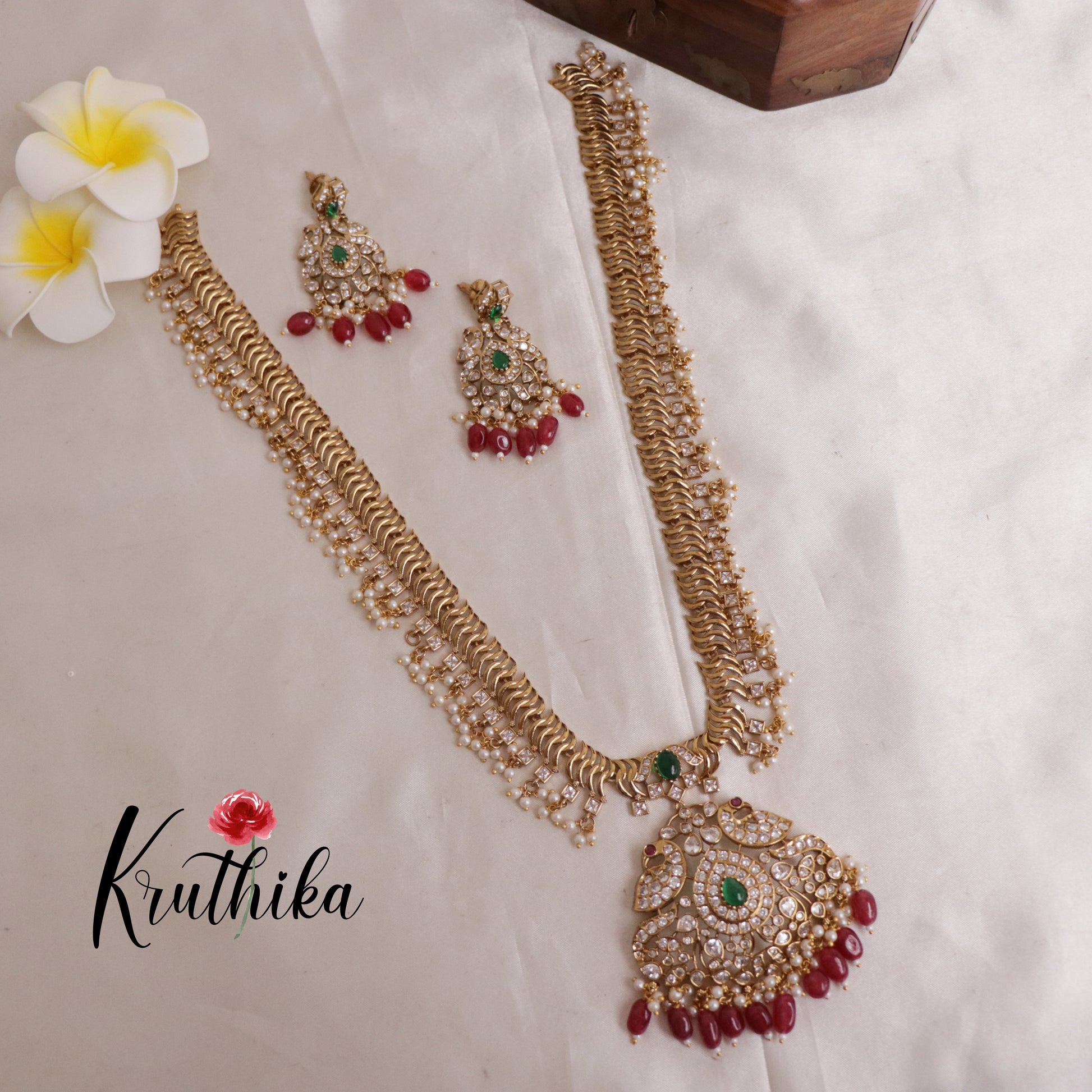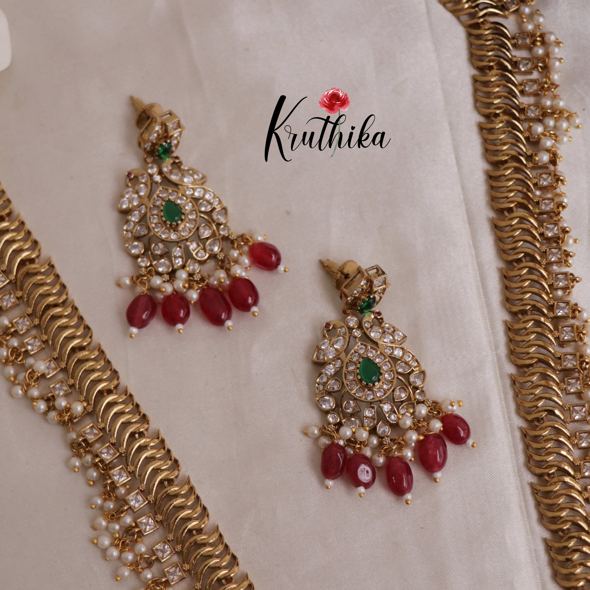 Enhance your style with our stunning, Grand Precook jadau Haram paired perfectly with matching earrings. Crafted with high-quality stones & beads, this set combines timeless elegance with a modern touch. Ideal for special occasions or adding a touch of glamour to your look.
