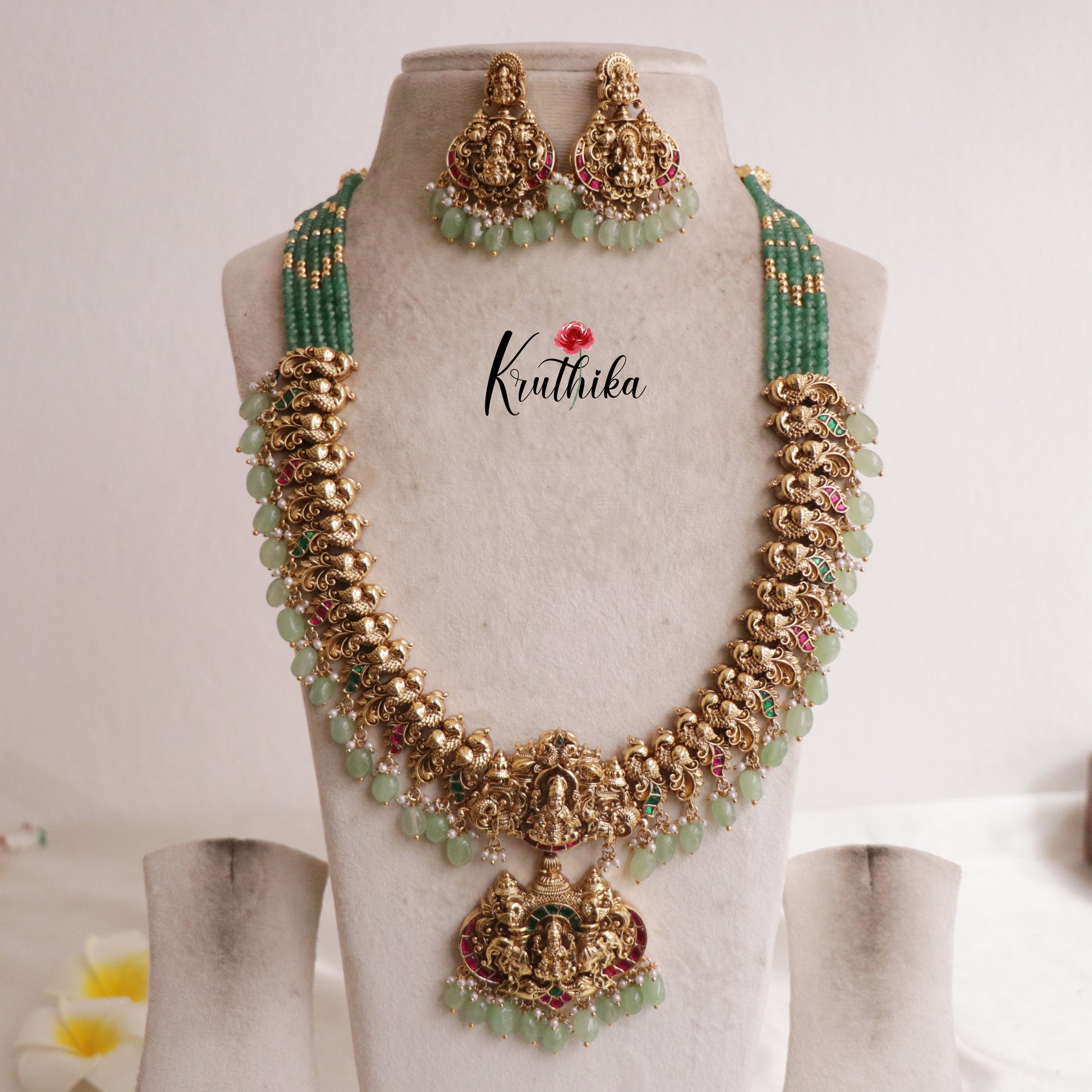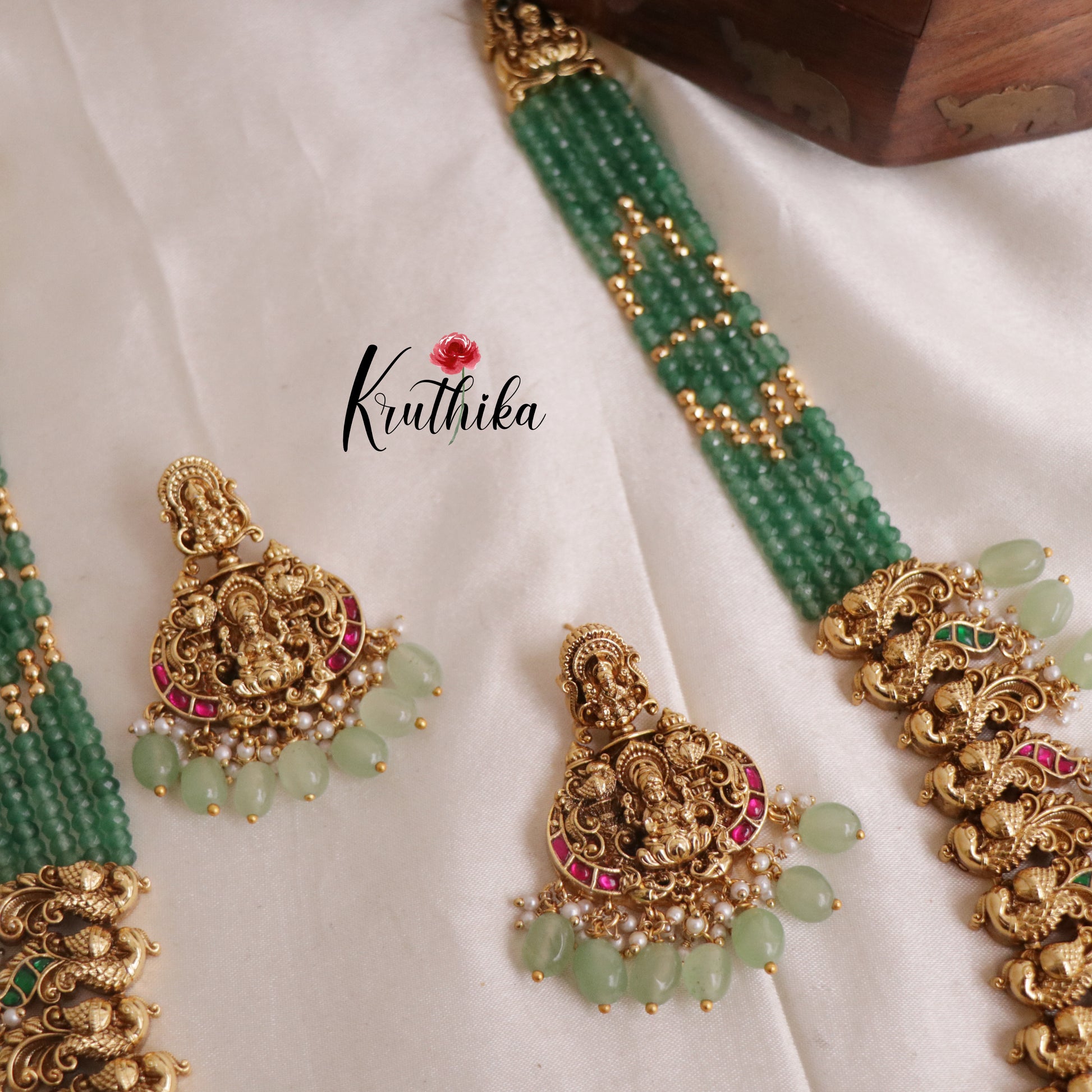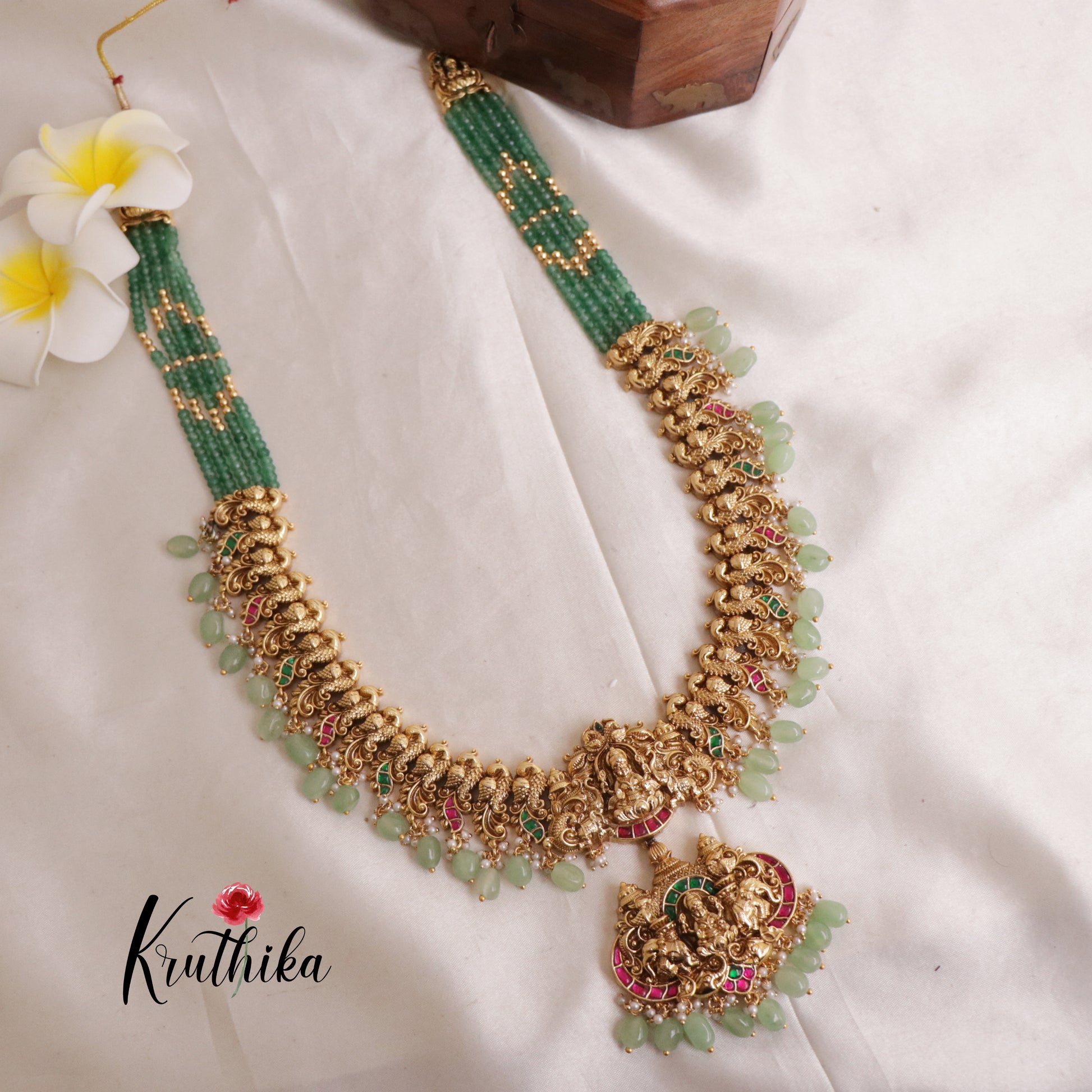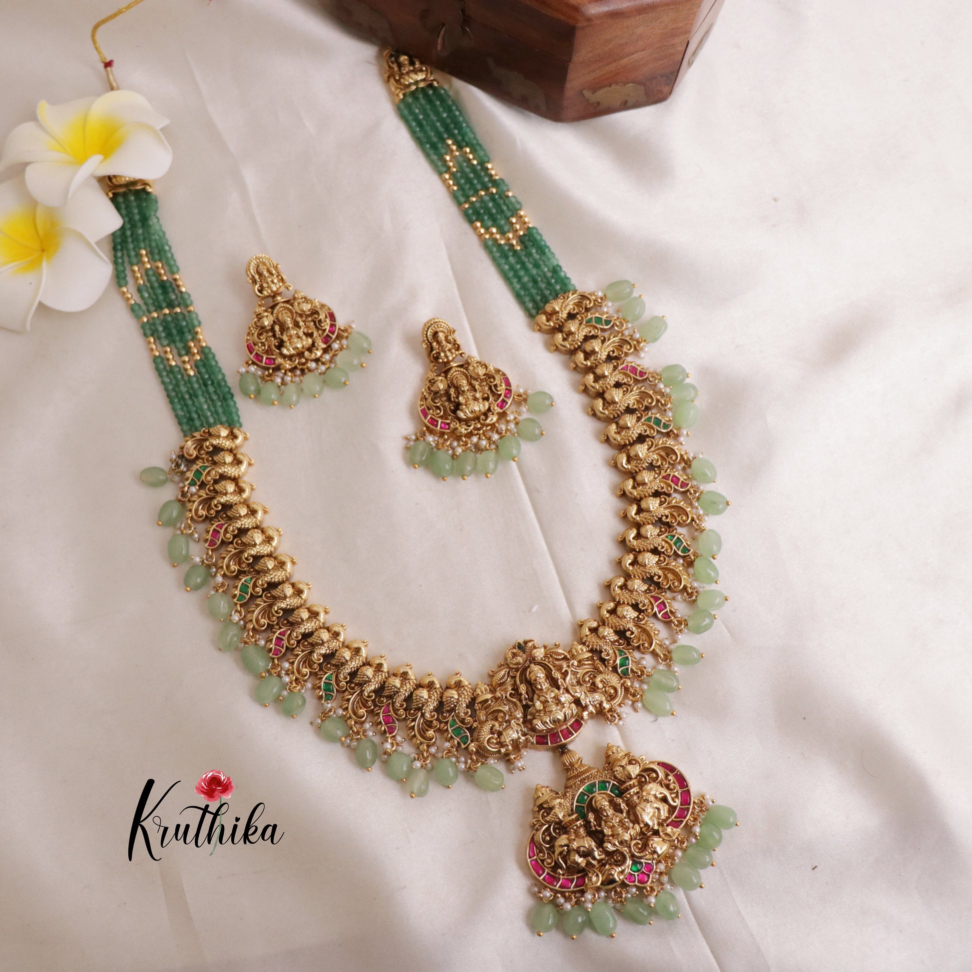 Enhance your style with our stunning, Grand Temple Jadau Beads Haram, paired perfectly with matching earrings. Crafted with high-quality stones & beads, this set combines timeless elegance with a modern touch. Ideal for special occasions or adding a touch of glamour to your look.