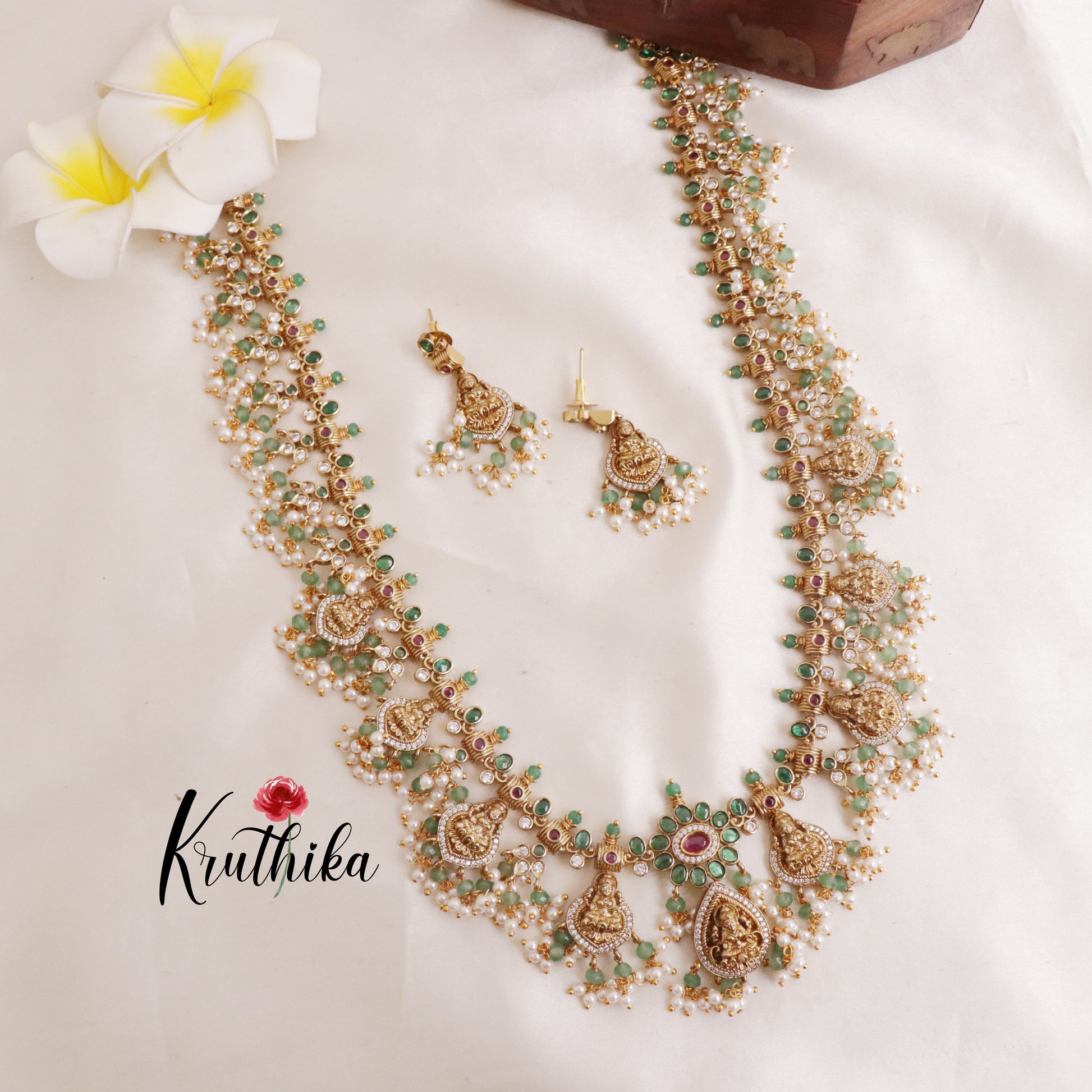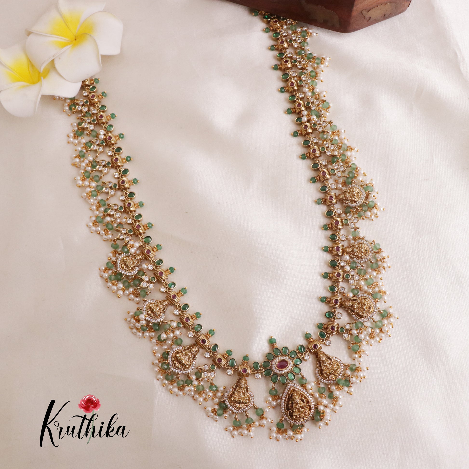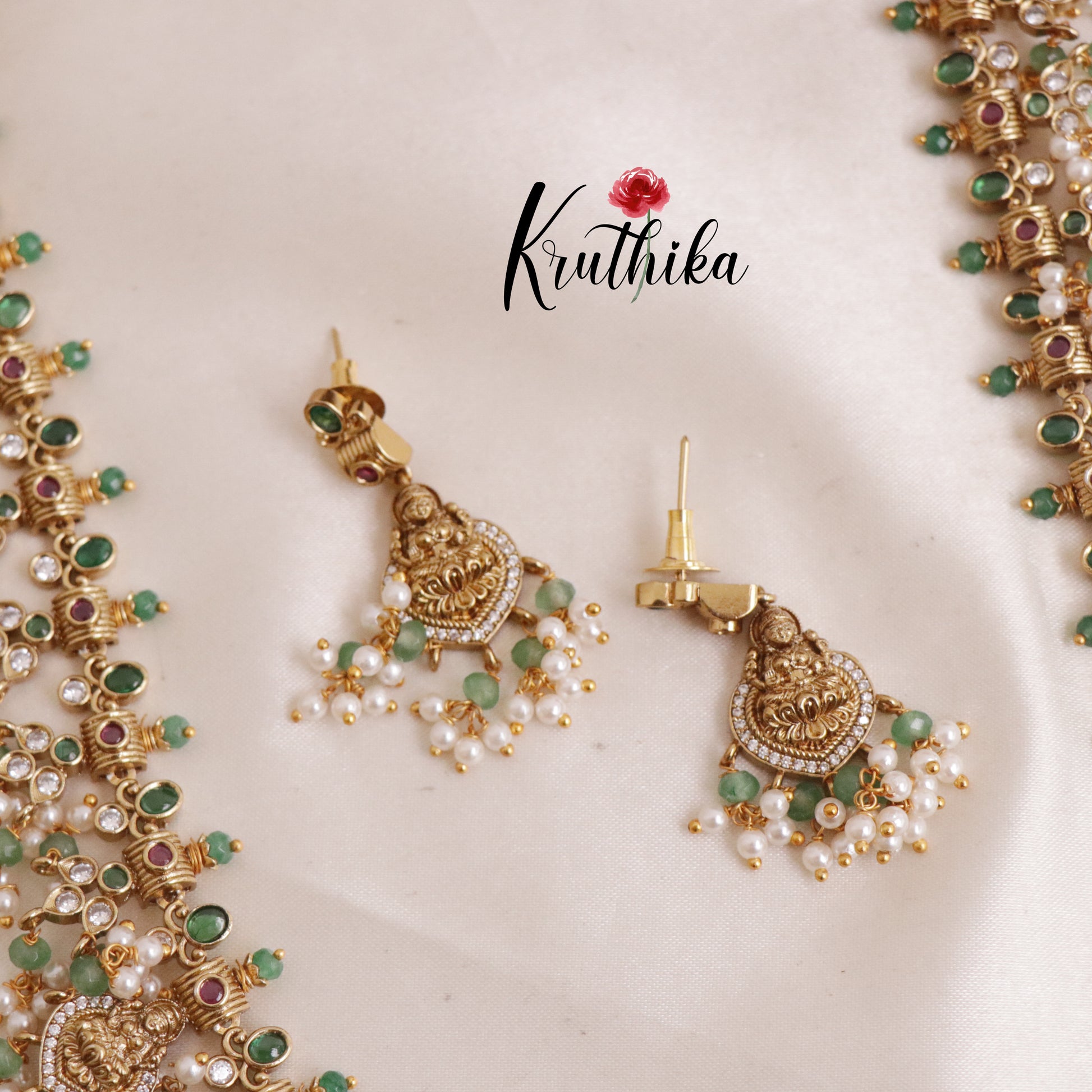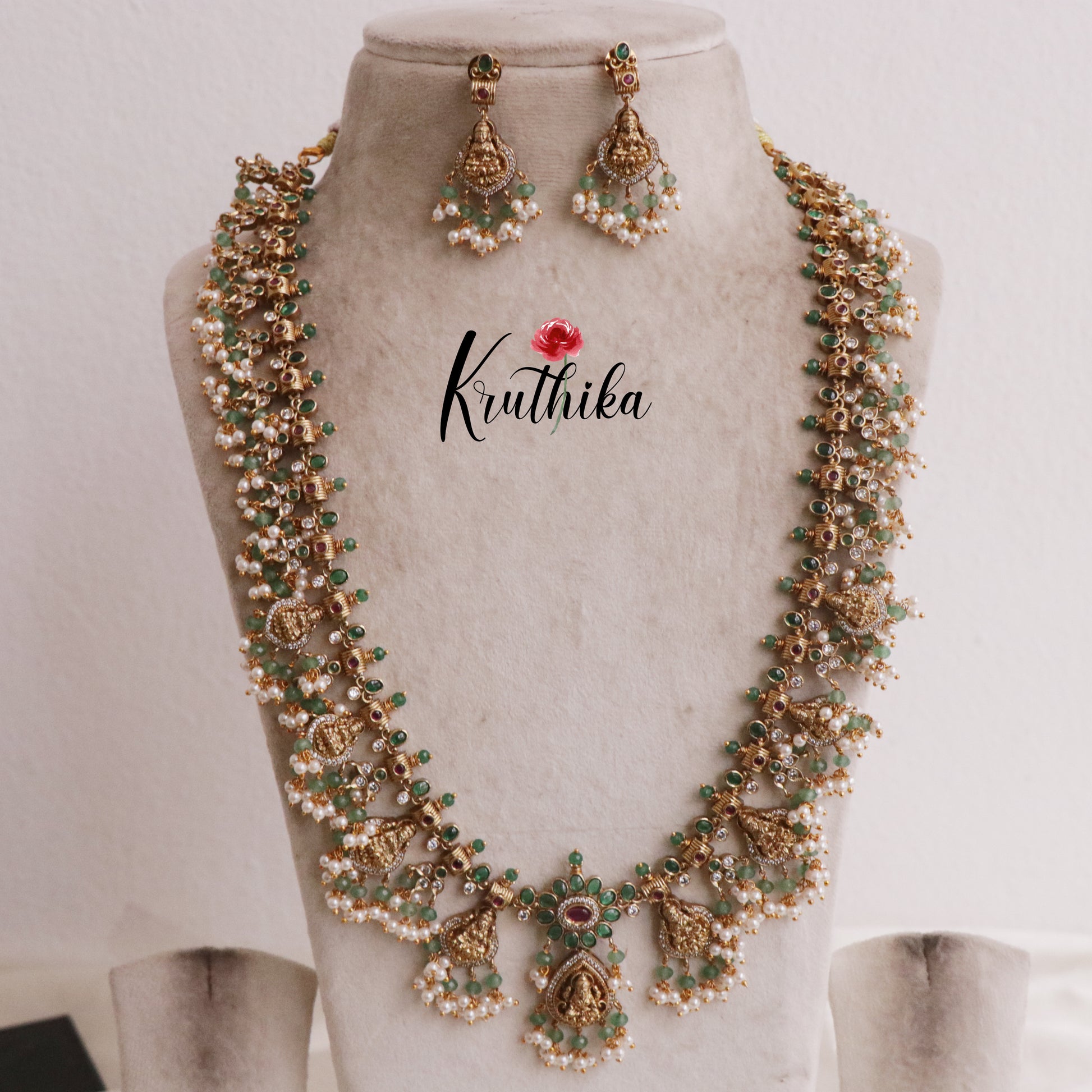 Enhance your style with our stunning, Grand Temple Lakshmi Guttaposalu Haaram with Pearl Drops Set paired perfectly with matching earrings. Crafted with high-quality stones & beads, this set combines timeless elegance with a modern touch. Ideal for special occasions or adding a touch of glamour to your look.