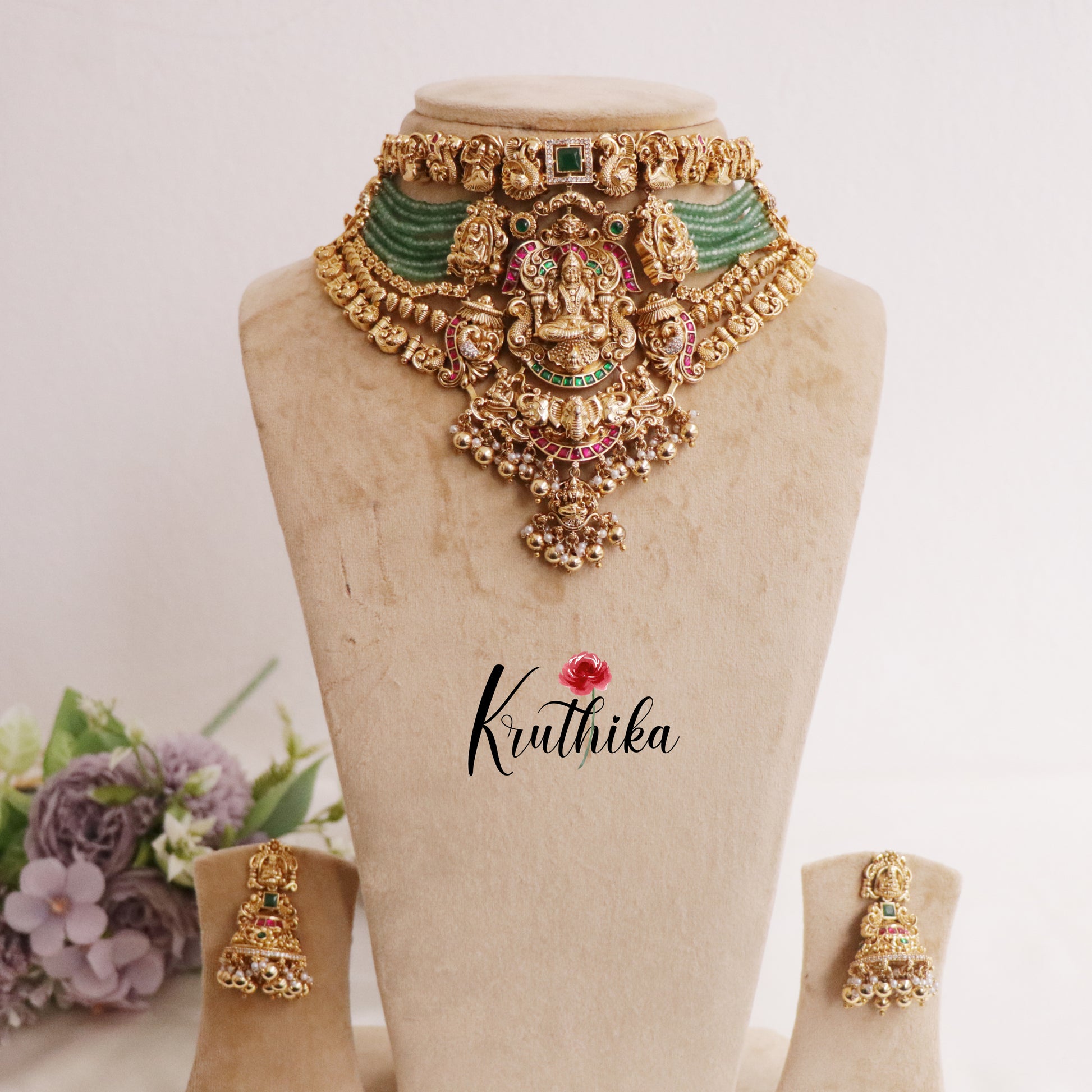 Enhance your style with our stunning, Grand Temple Lakshmi Jadau Choker with Golden Beads Crafted with high-quality stones & beads, this set combines timeless elegance with a modern touch. Ideal for special occasions or adding a touch of glamour to your look.
