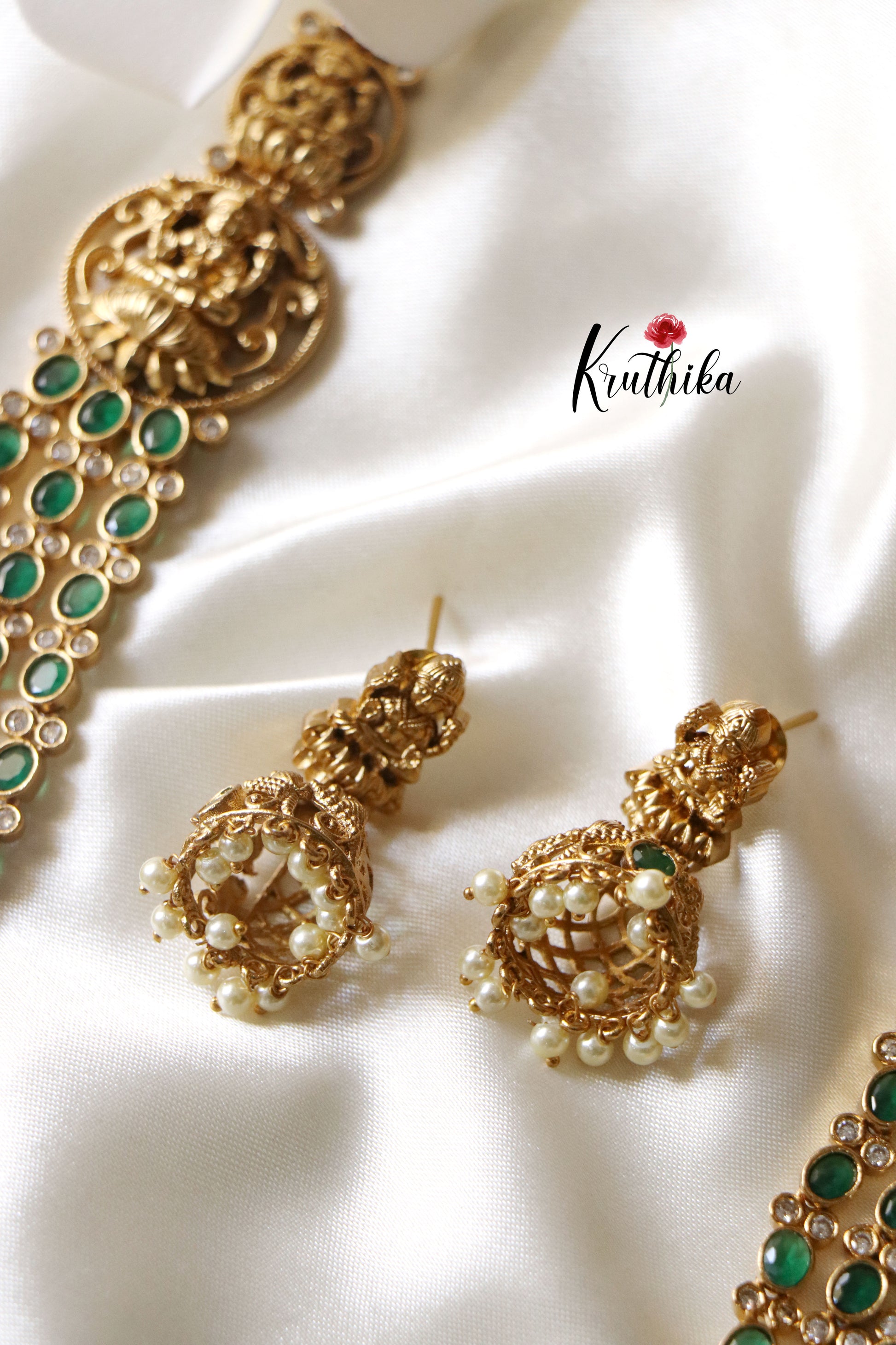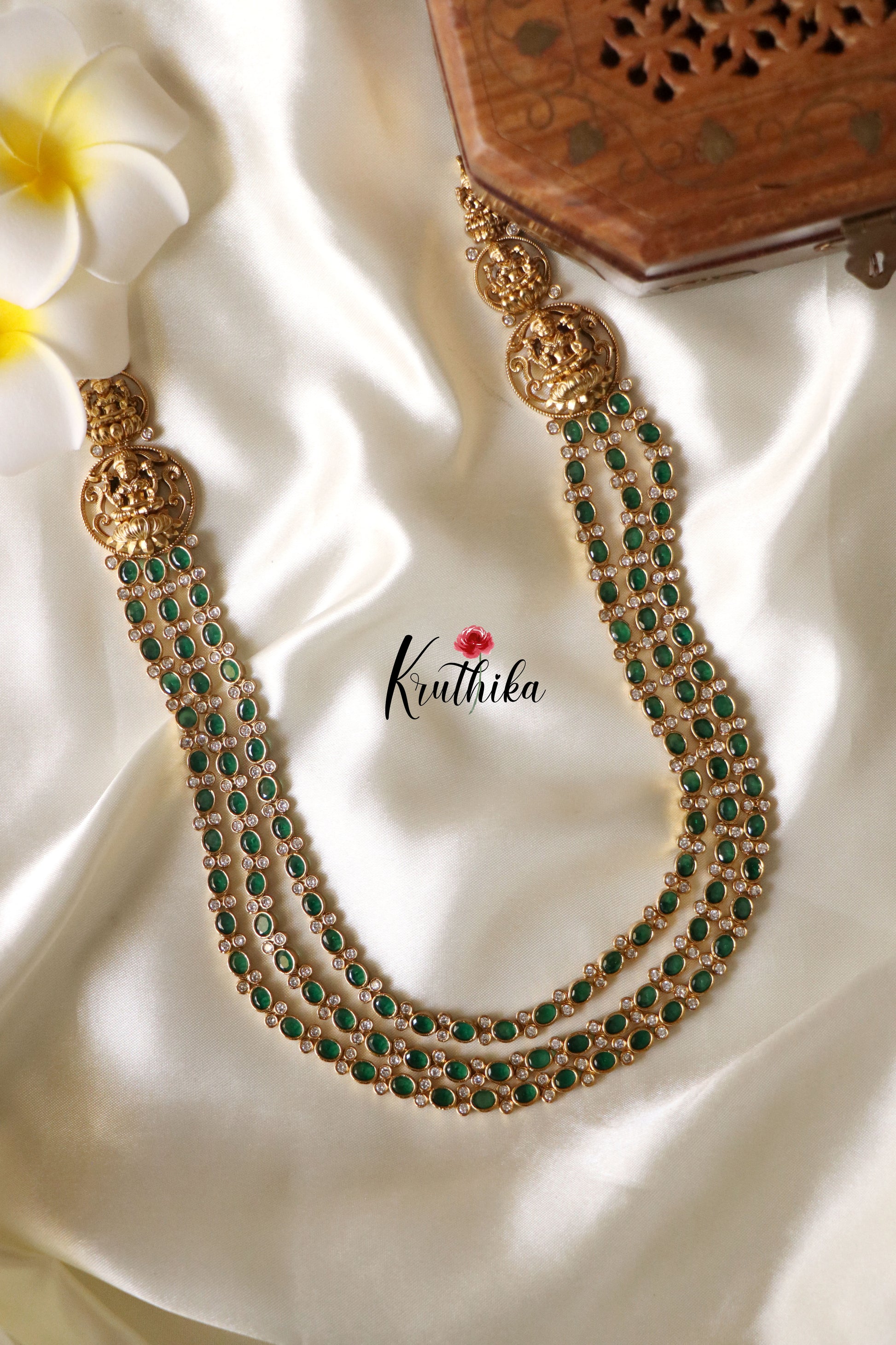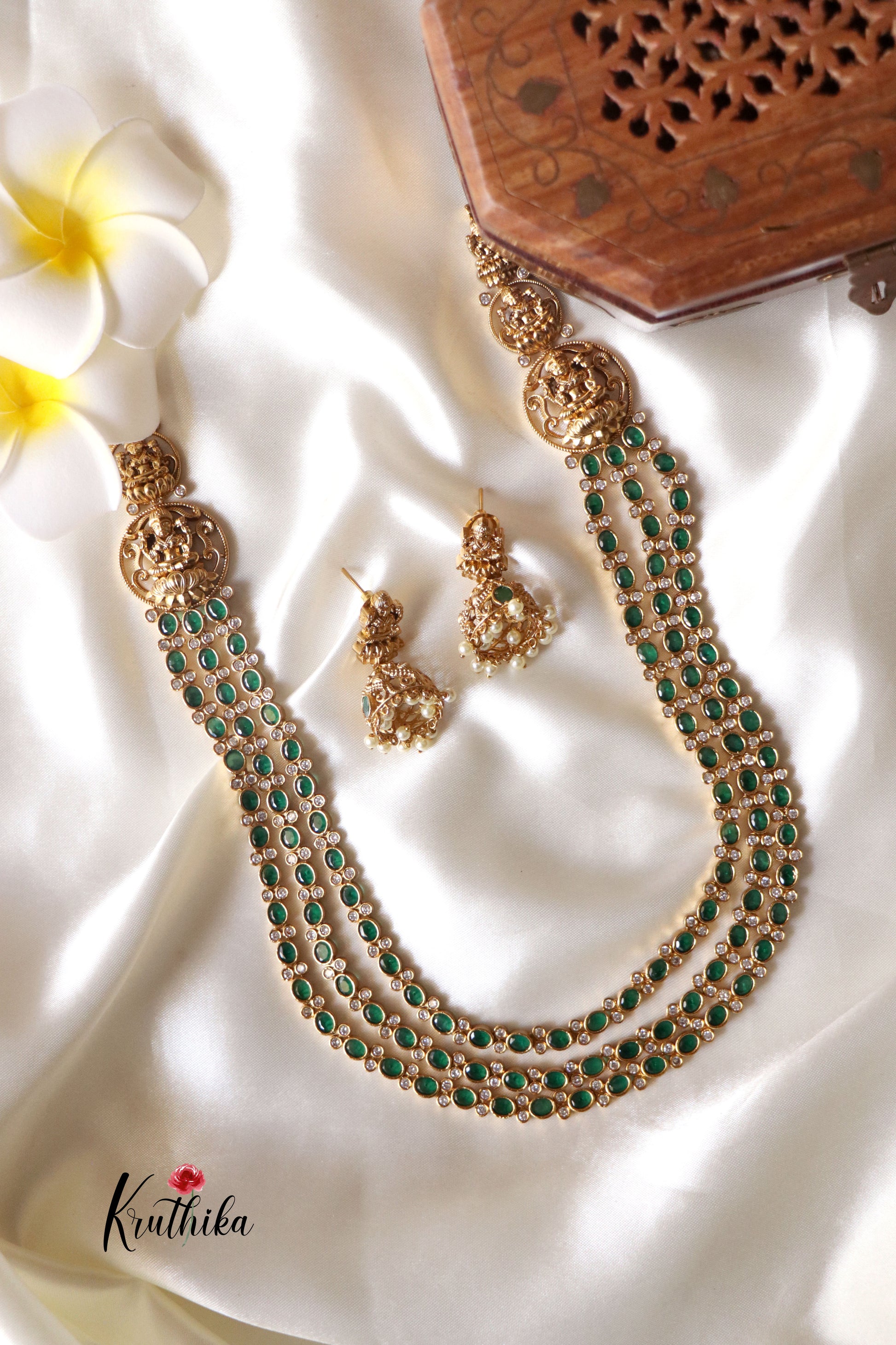 Enhance your style with our stunning Grand Three Layer Emerald Lakshmi Haaram, paired perfectly with matching earrings. Crafted with high-quality stones & beads, this set combines timeless elegance with a modern touch. Ideal for special occasions or adding a touch of glamour to your look.