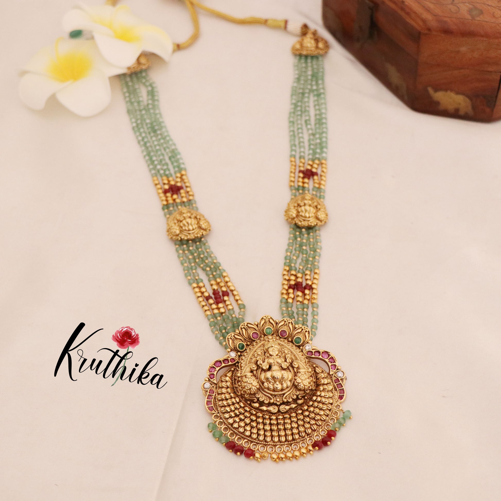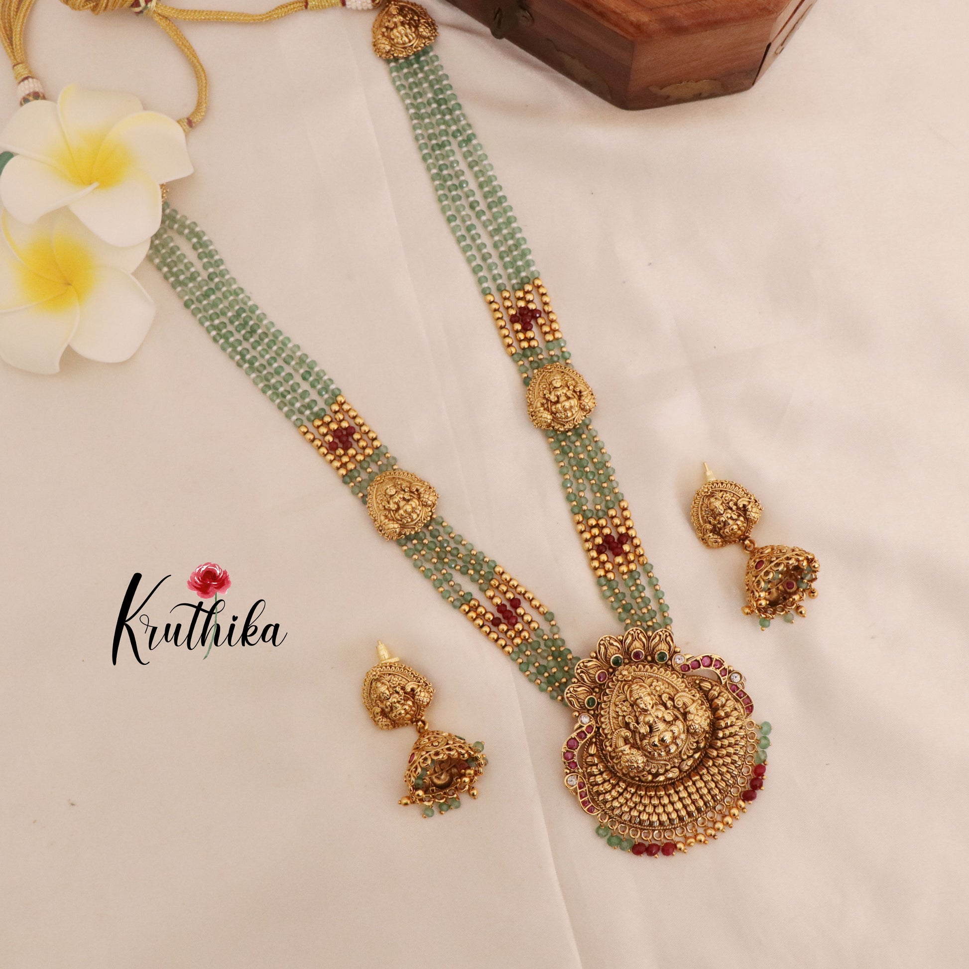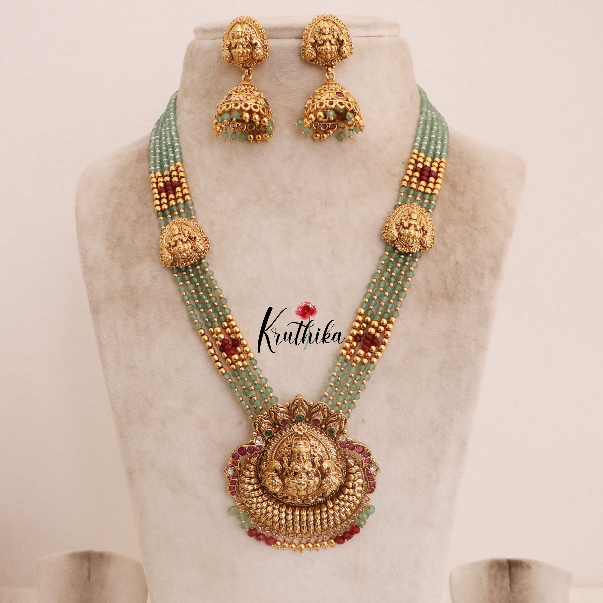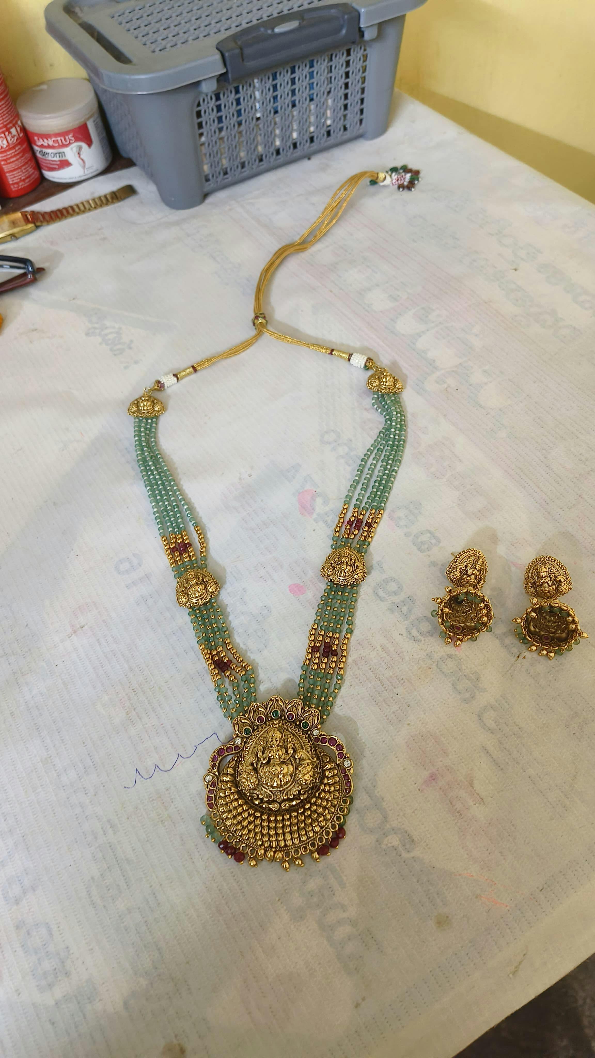 Enhance your style with our stunning Green Beads Lakshmi Haaram, paired perfectly with matching earrings. Crafted with high-quality stones & beads, this set combines timeless elegance with a modern touch. Ideal for special occasions or adding a touch of glamour to your look.