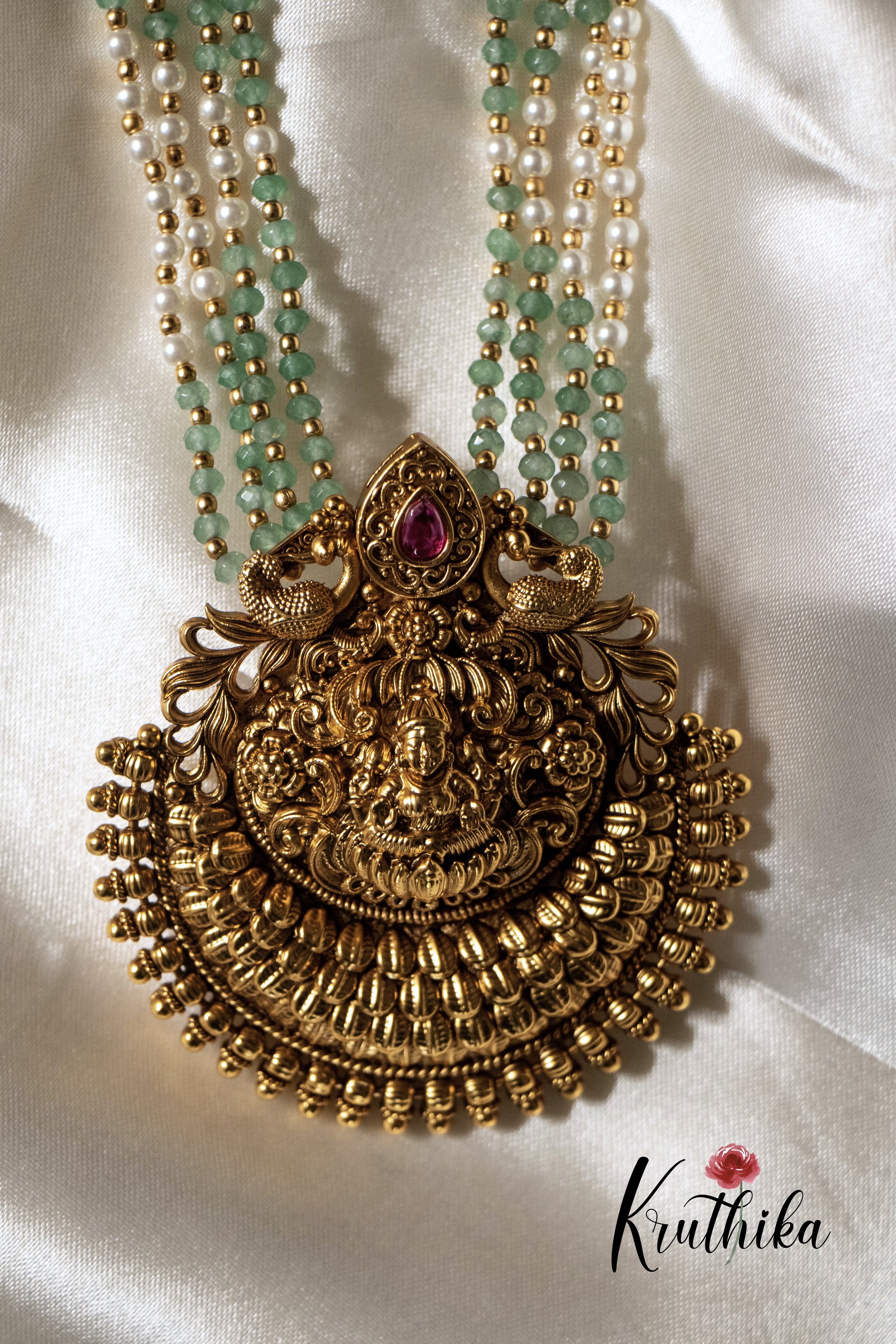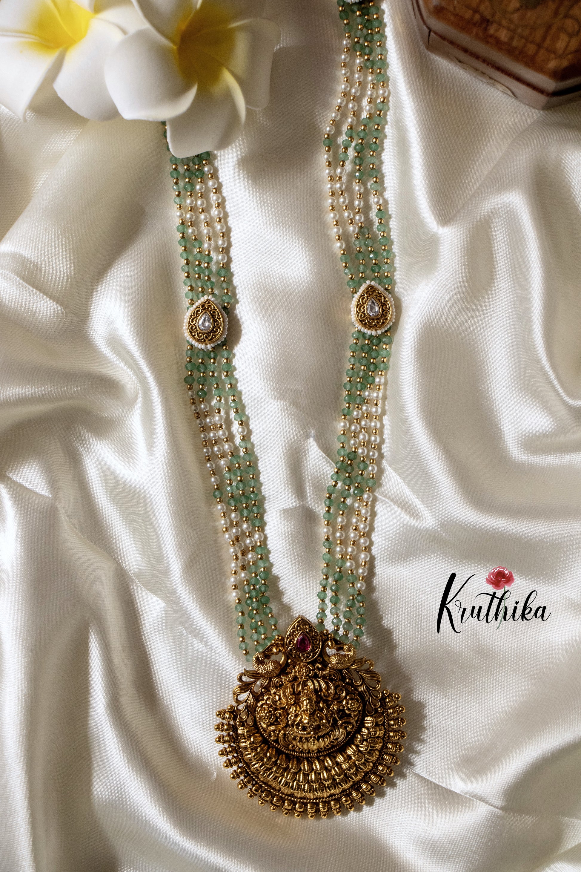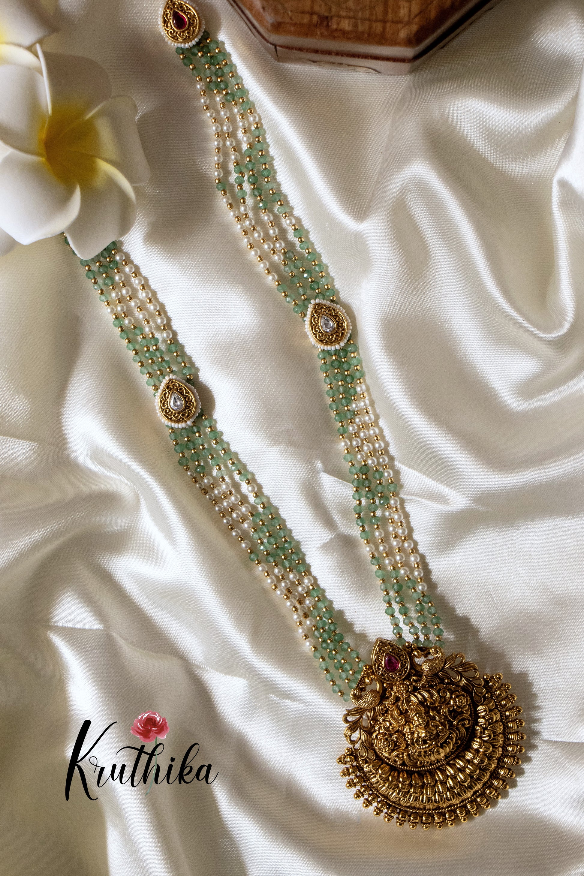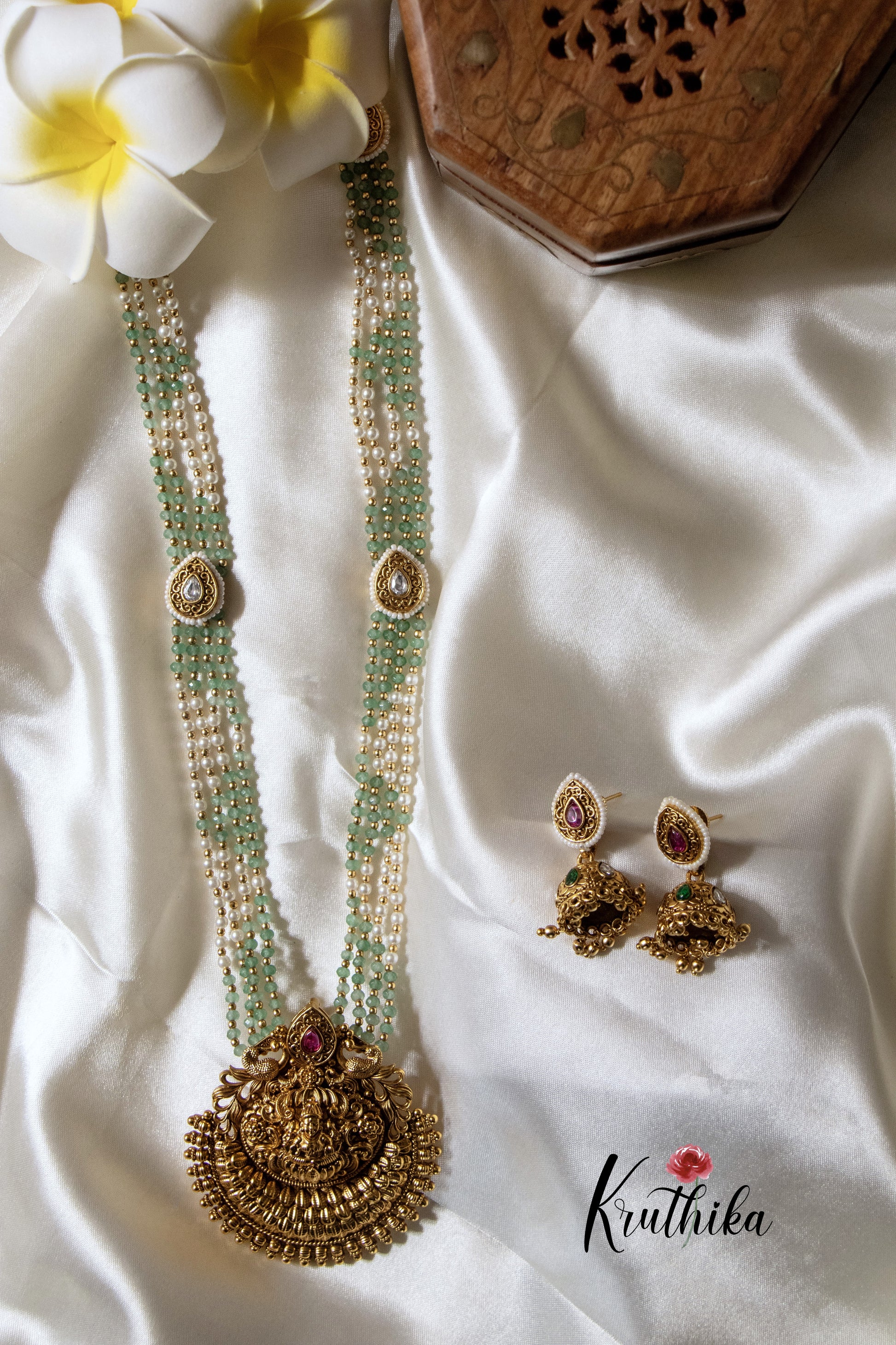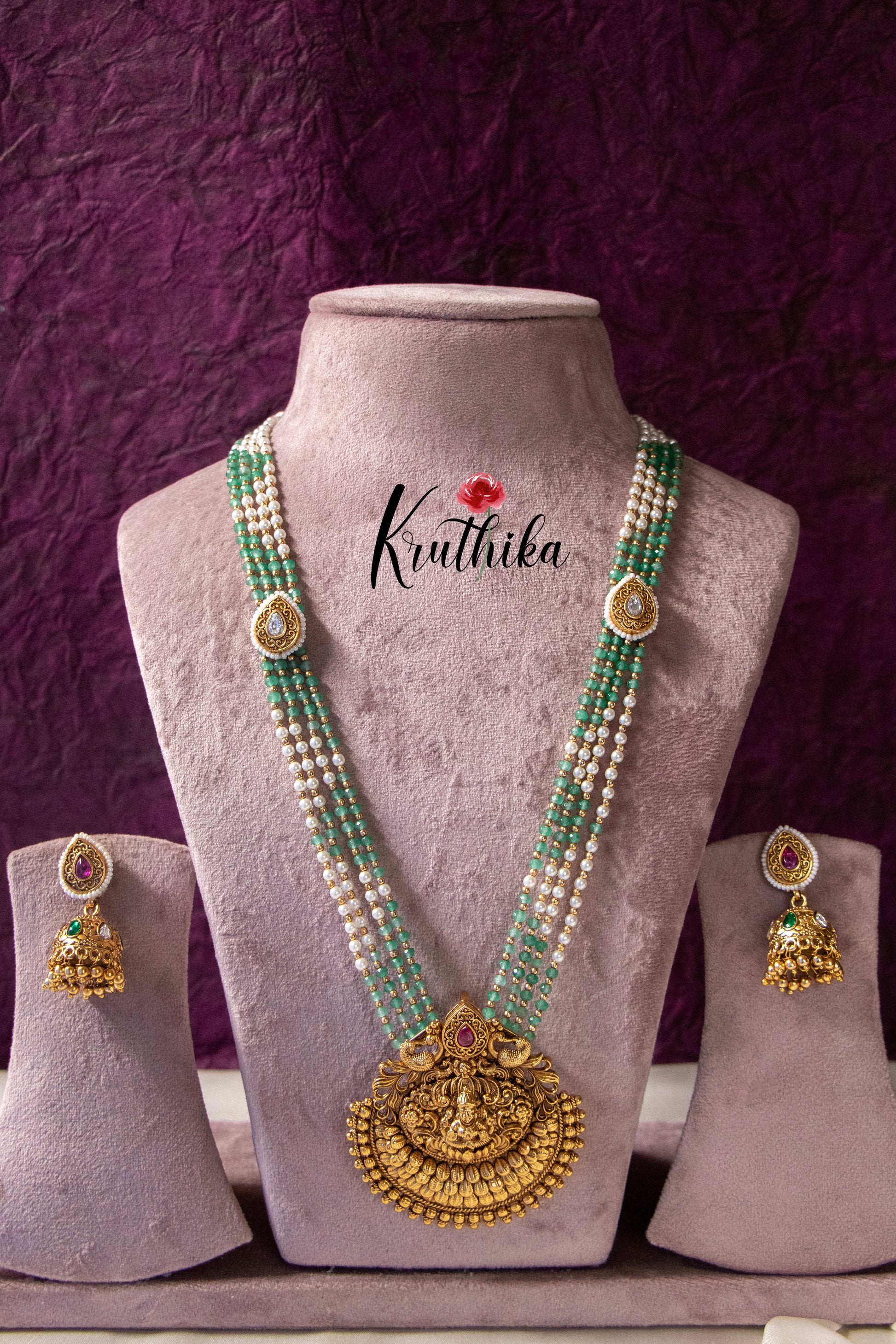 Enhance your style with our stunning Green beads Temple Haaram, paired perfectly with matching earrings. Crafted with high-quality stones & beads, this set combines timeless elegance with a modern touch. Ideal for special occasions or adding a touch of glamour to your look.