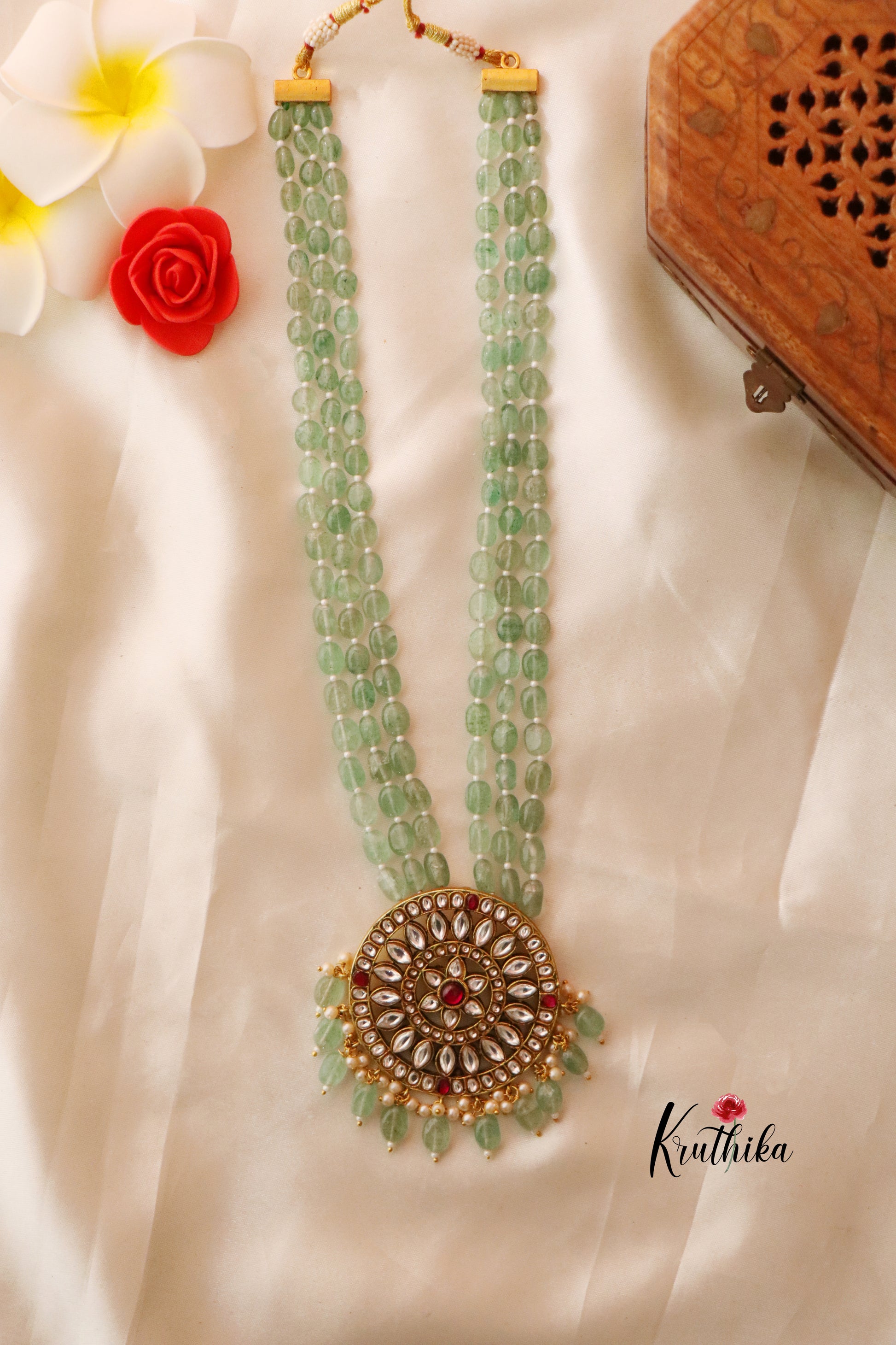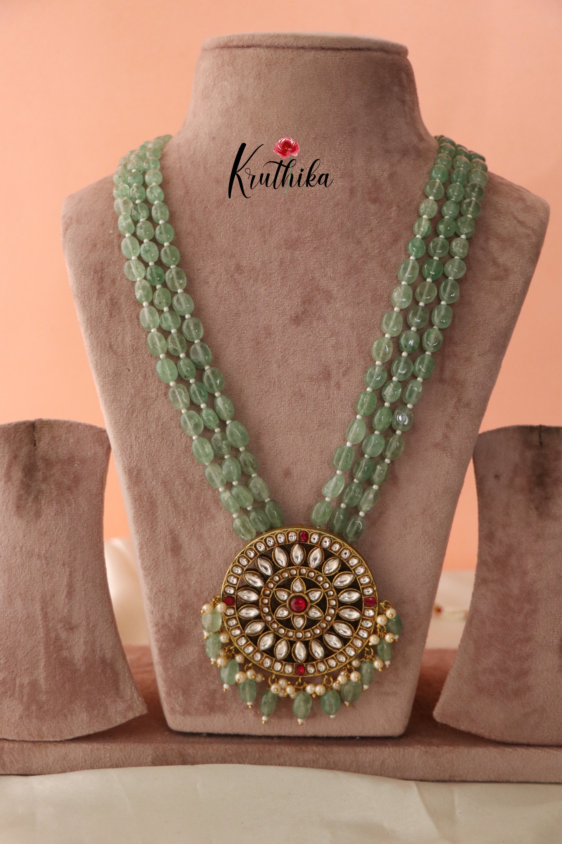 Enhance your style with our stunning Jadau pendant beads Haaram, paired perfectly with matching earrings. Crafted with high-quality stones & beads, this set combines timeless elegance with a modern touch. Ideal for special occasions or adding a touch of glamour to your look.
