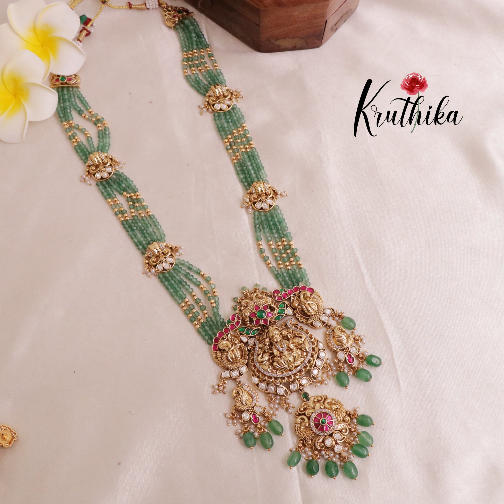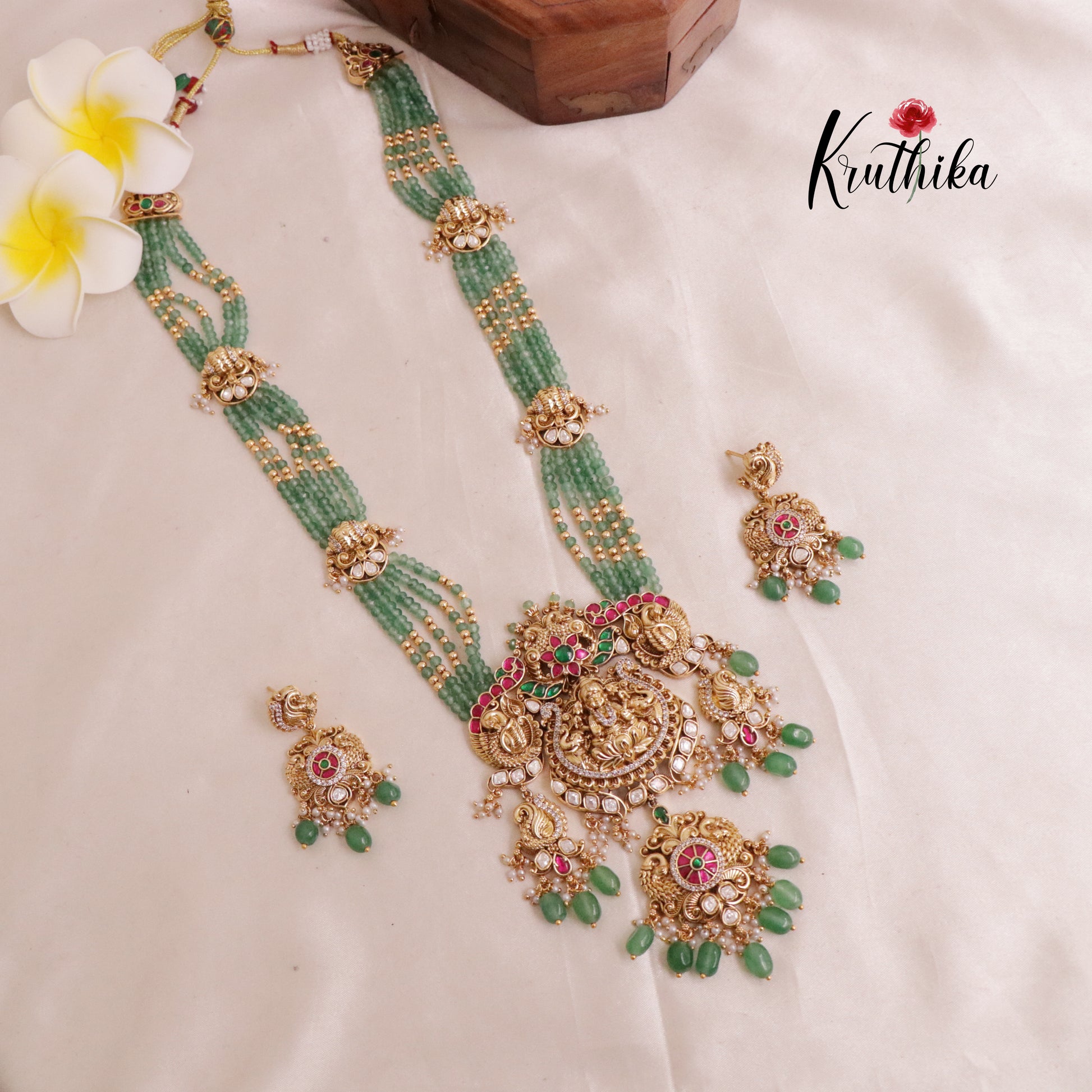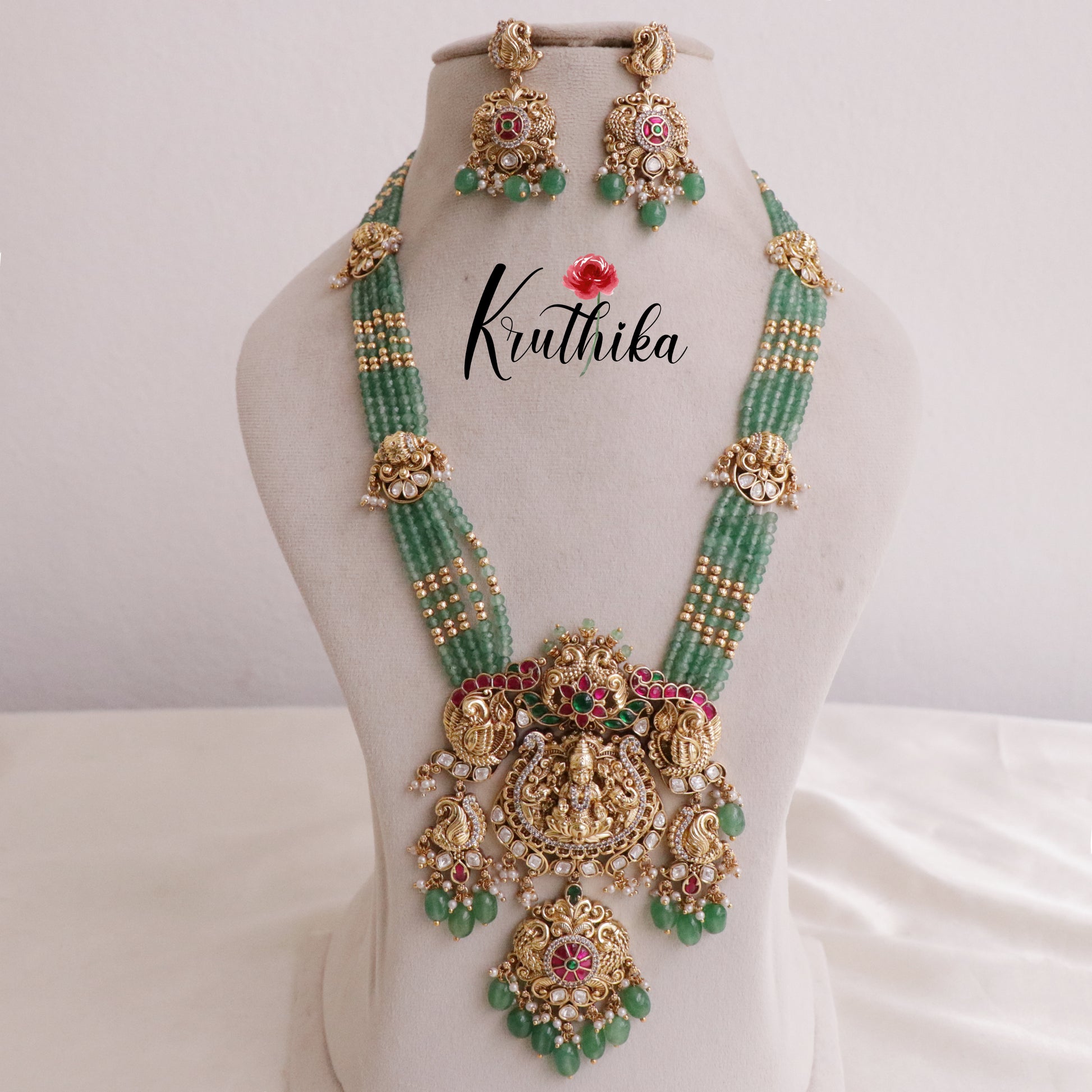 Enhance your style with our stunning ,Grand Lakshmi Jadau Beads Haram Crafted with high-quality stones & beads, this set combines timeless elegance with a modern touch. Ideal for special occasions or adding a touch of glamour to your look.