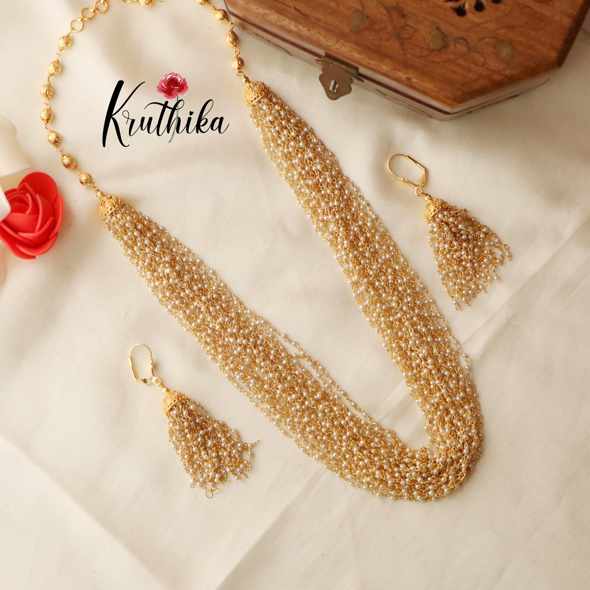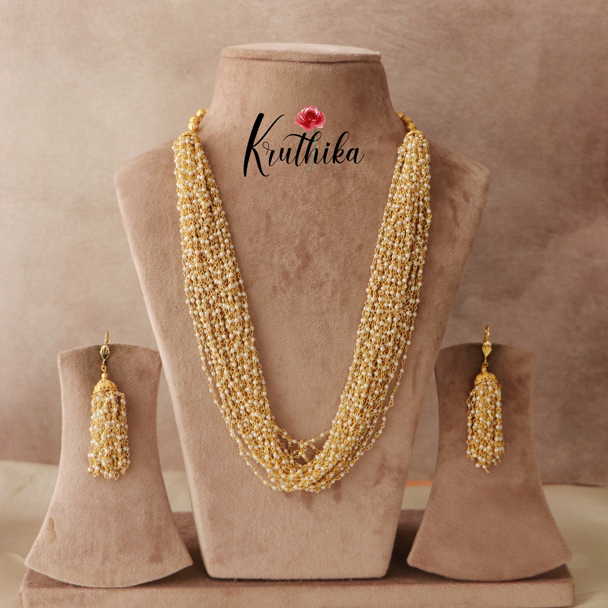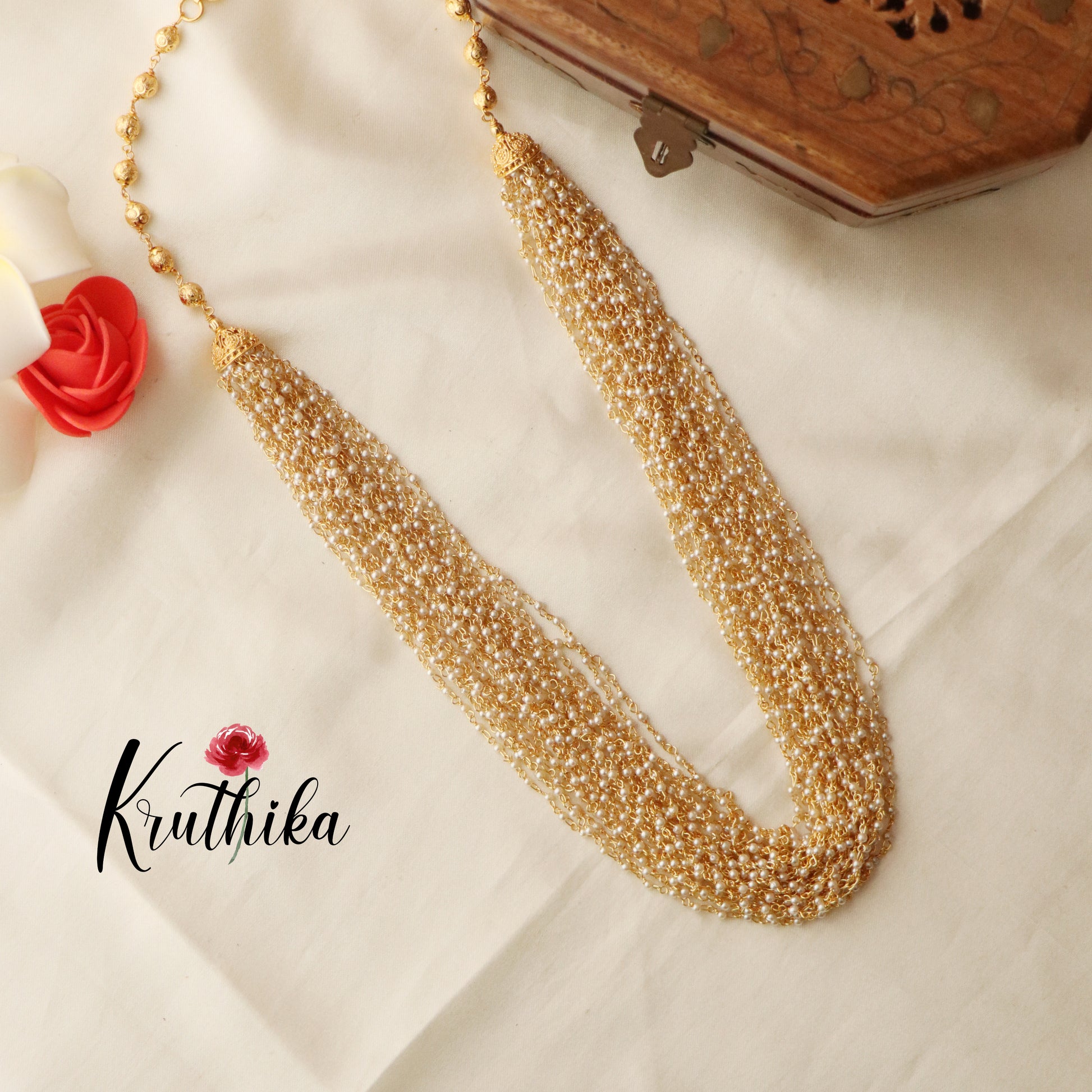 Enhance your style with our stunning, Multi lines Pearls maala . Crafted with high-quality stones & beads, this set combines timeless elegance with a modern touch. Ideal for special occasions or adding a touch of glamour to your look.