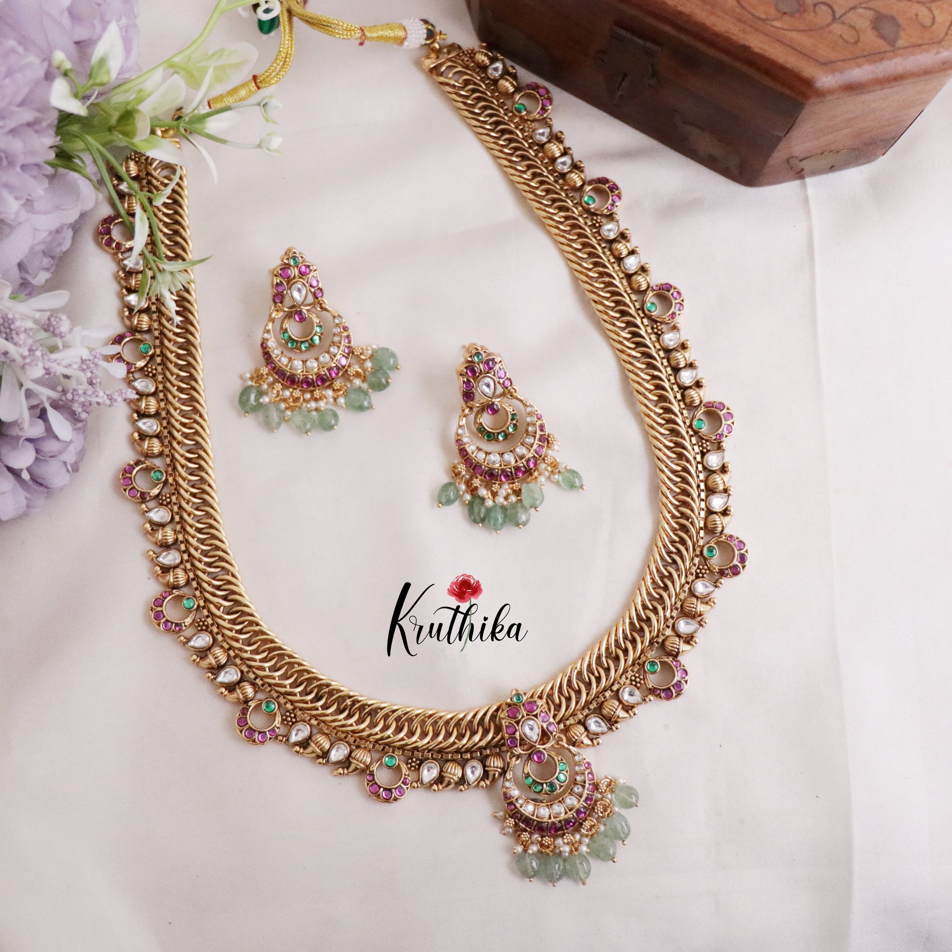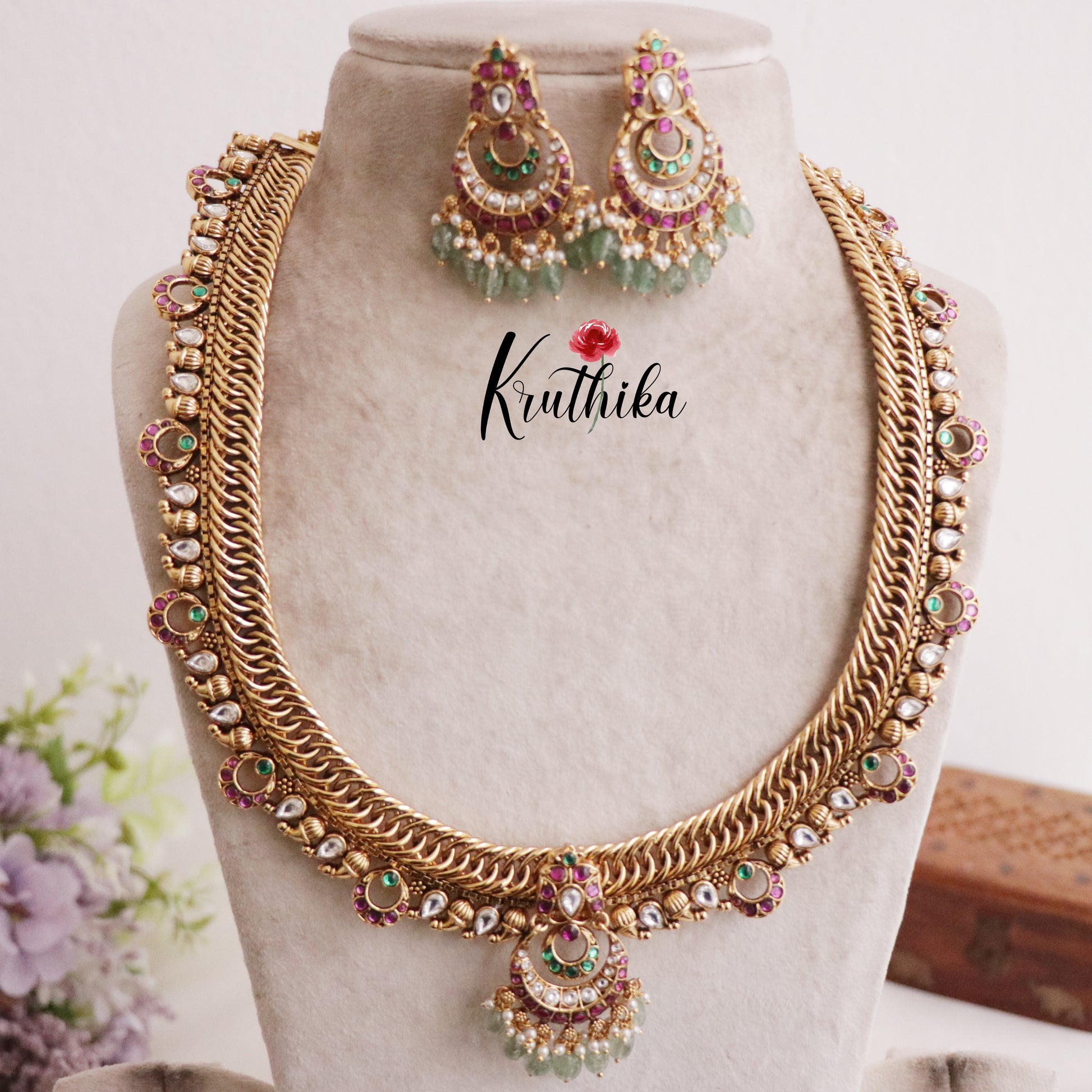 Enhance your style with our stunning, Beautiful No-Idol Jadau Floral Jalebi style Necklace paired perfectly with matching earrings. Crafted with high-quality stones & beads, this set combines timeless elegance with a modern touch. Ideal for special occasions or adding a touch of glamour to your look.