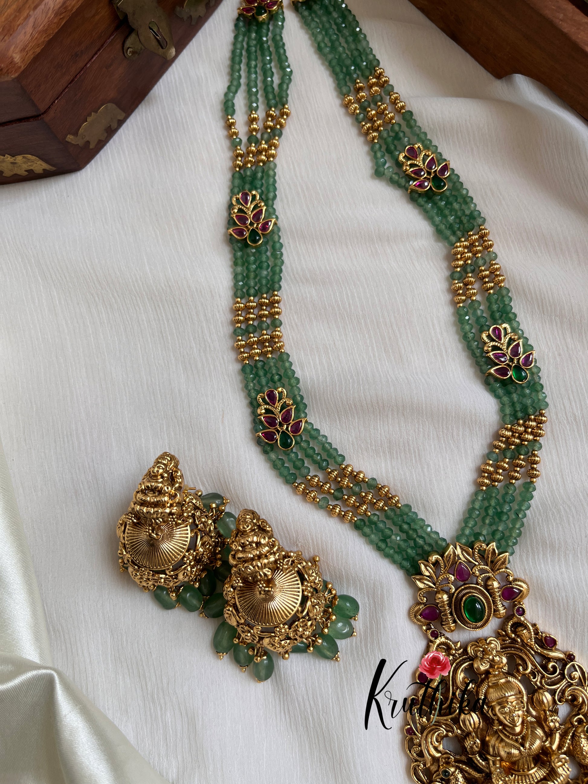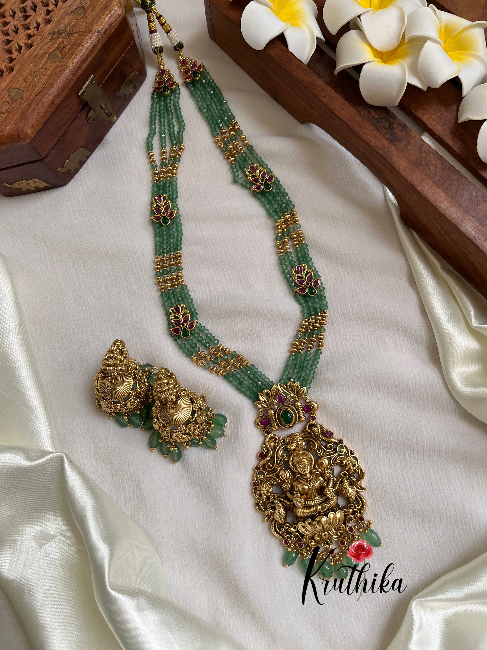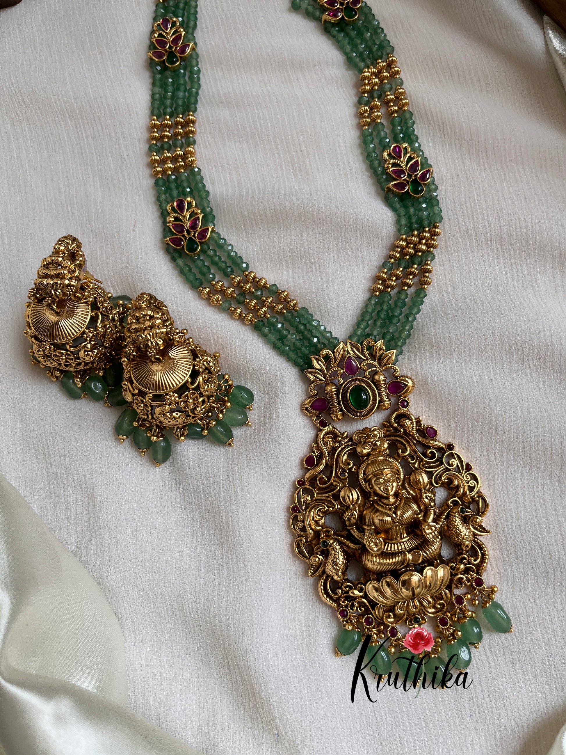 Enhance your style with our stunning Onyx Beads Nakshi Temple Lakshmi Haaram, paired perfectly with matching earrings. Crafted with high-quality stones & beads, this set combines timeless elegance with a modern touch. Ideal for special occasions or adding a touch of glamour to your look.