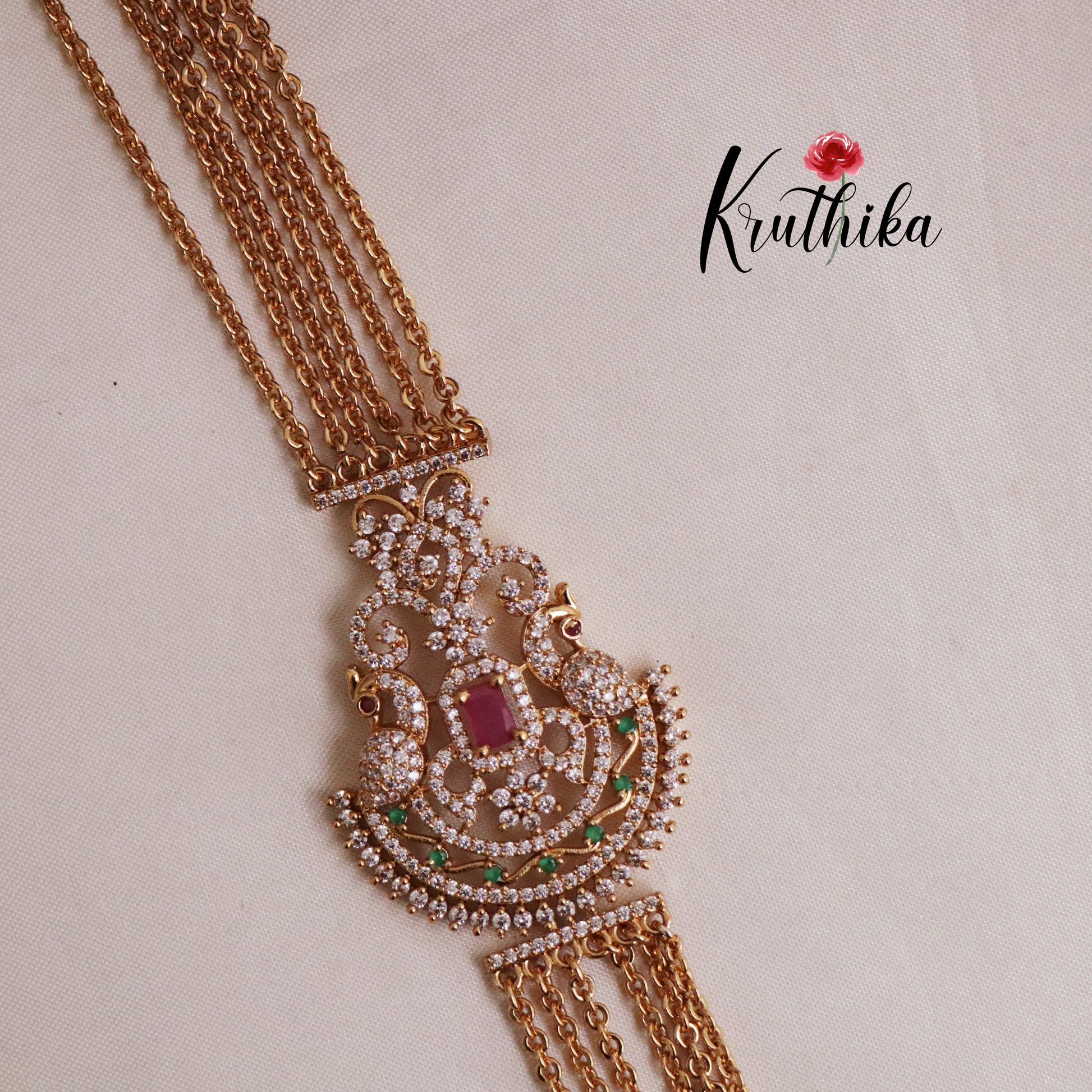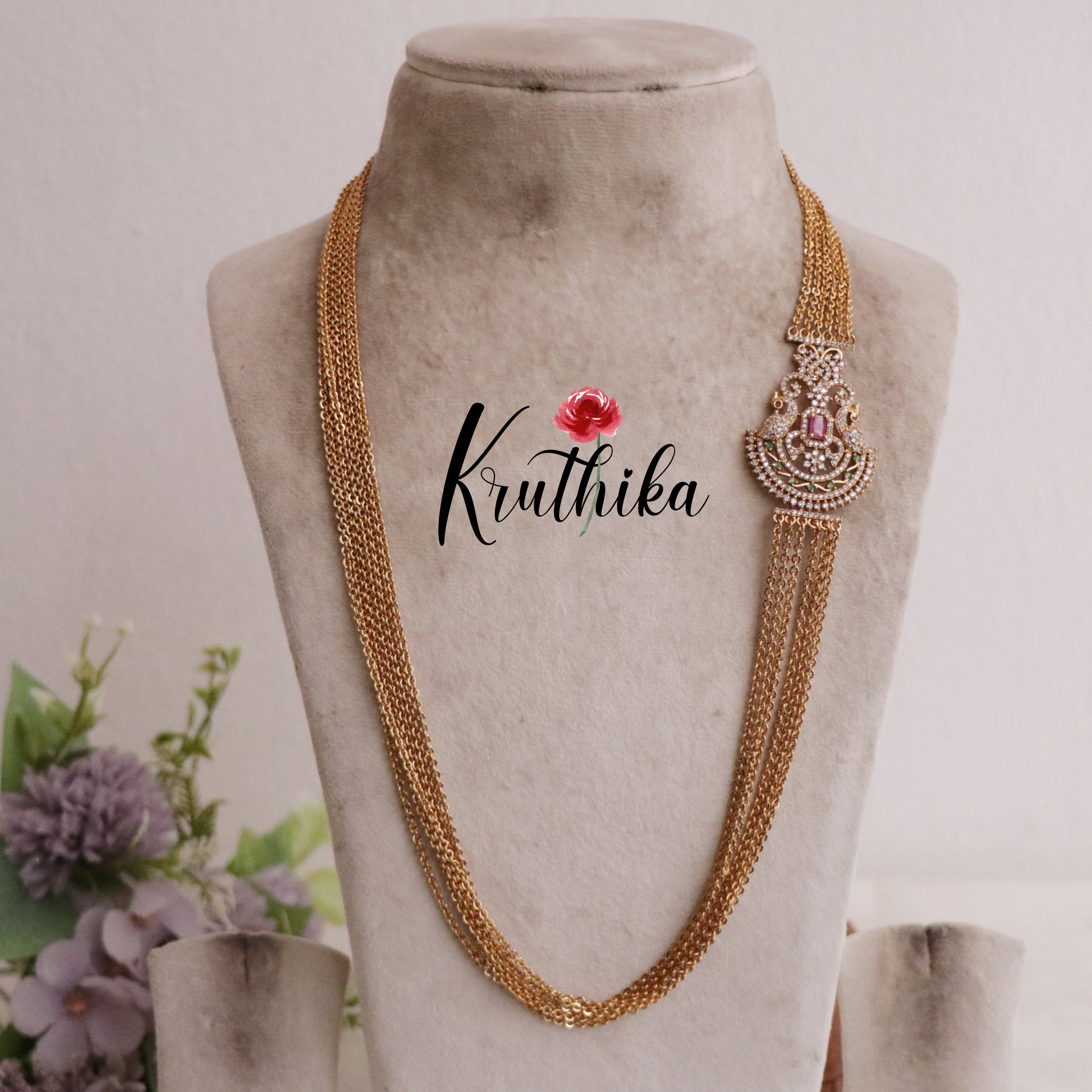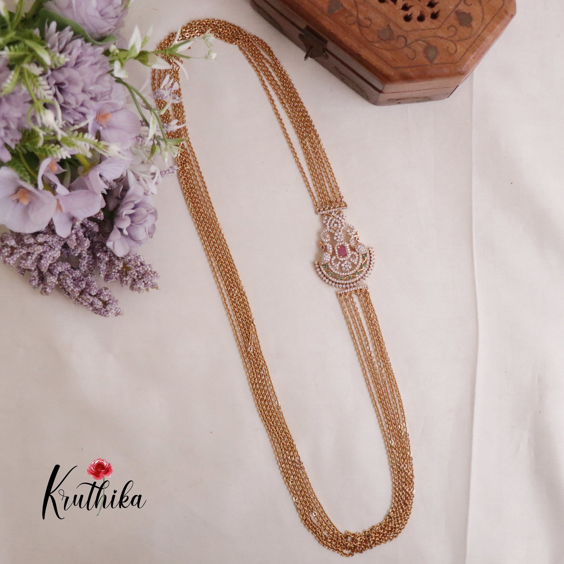 Our Four Layer Chandra Haaram with AD Pendant is a timeless piece that adds instant grandeur to any traditional look. Crafted with sparkling AD stones and finished in a classic temple-style polish, this haaram features four elegant layers that drape beautifully across the neckline. The statement design with delicate crescent-shaped (chandra) motifs running across the layers adds a touch of heritage charm.
