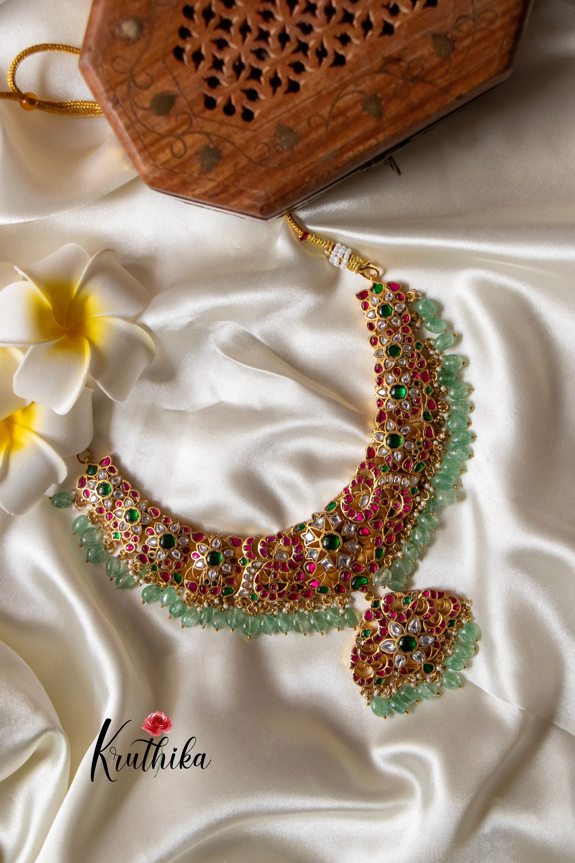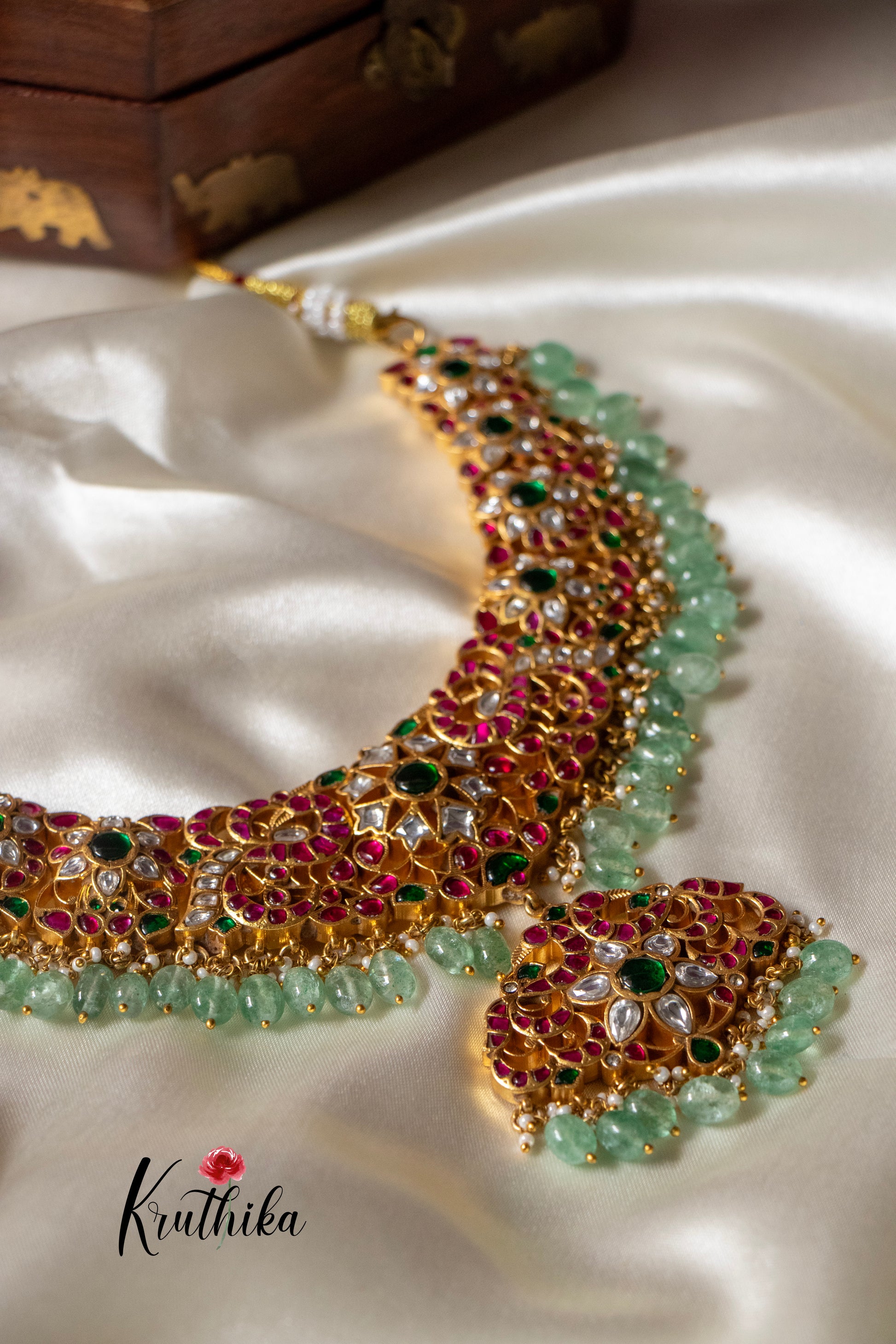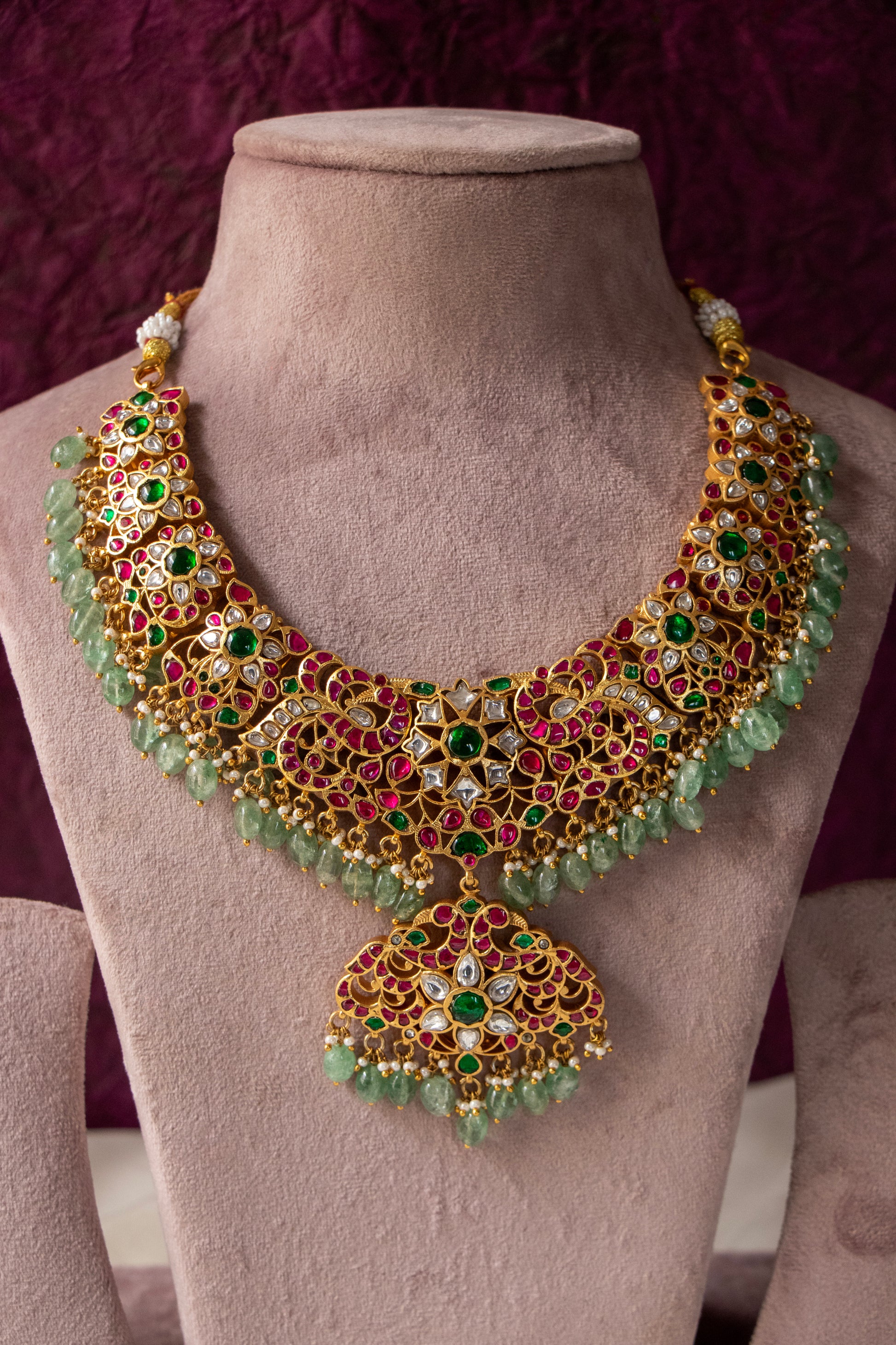 Enhance your style with our stunning Peacock Jadau Necklace, paired perfectly with matching earrings. Crafted with high-quality stones & beads, this set combines timeless elegance with a modern touch. Ideal for special occasions or adding a touch of glamour to your look.