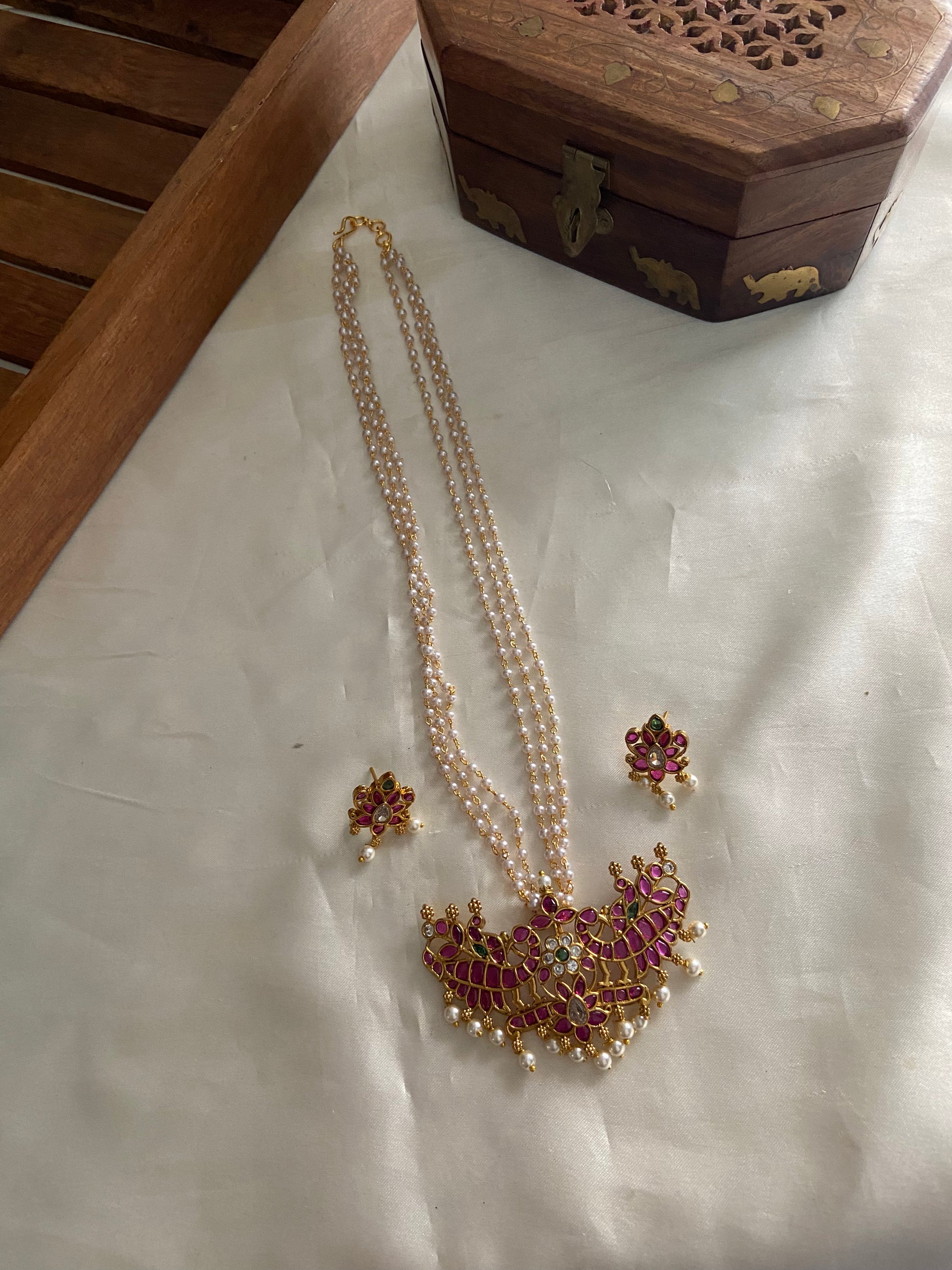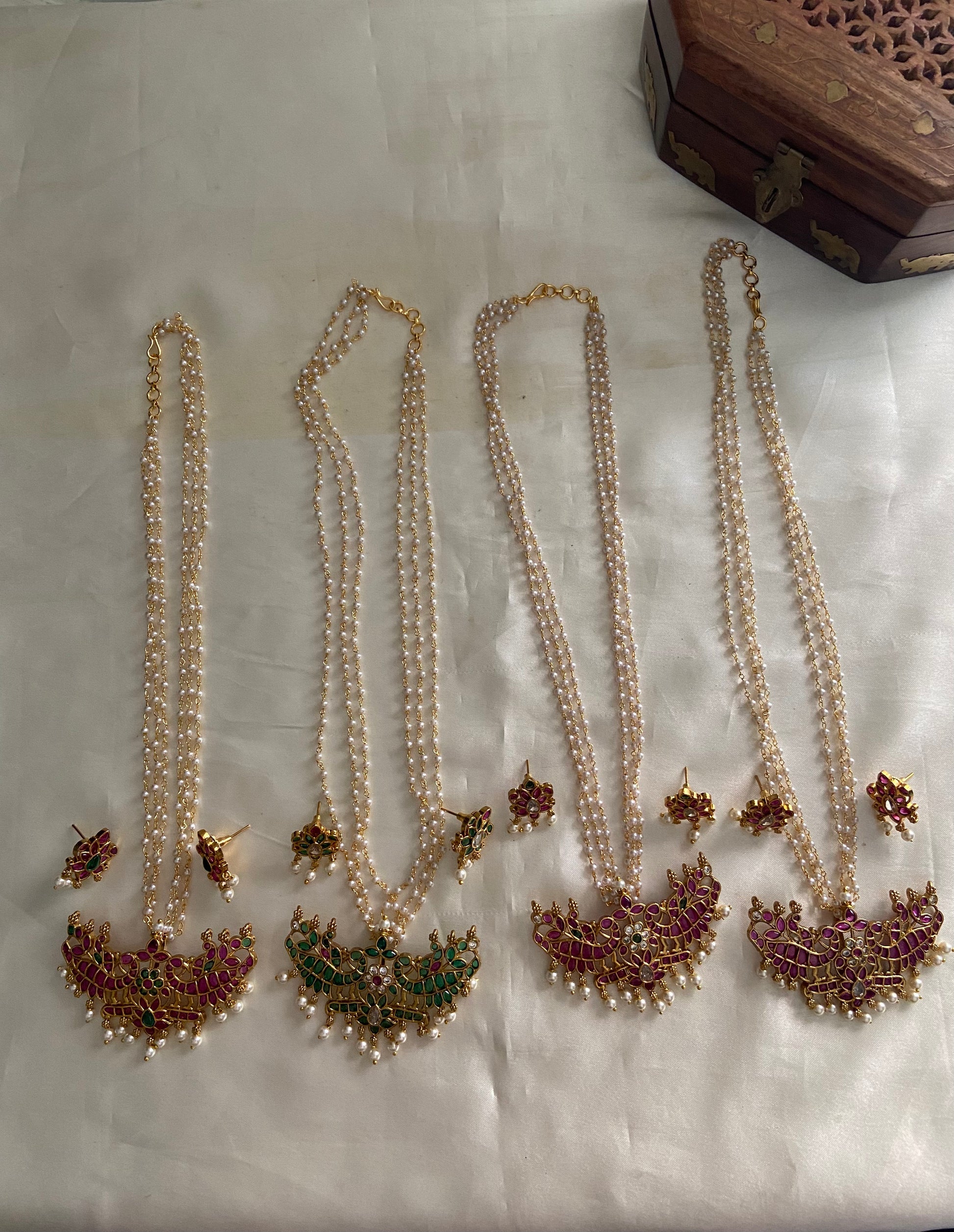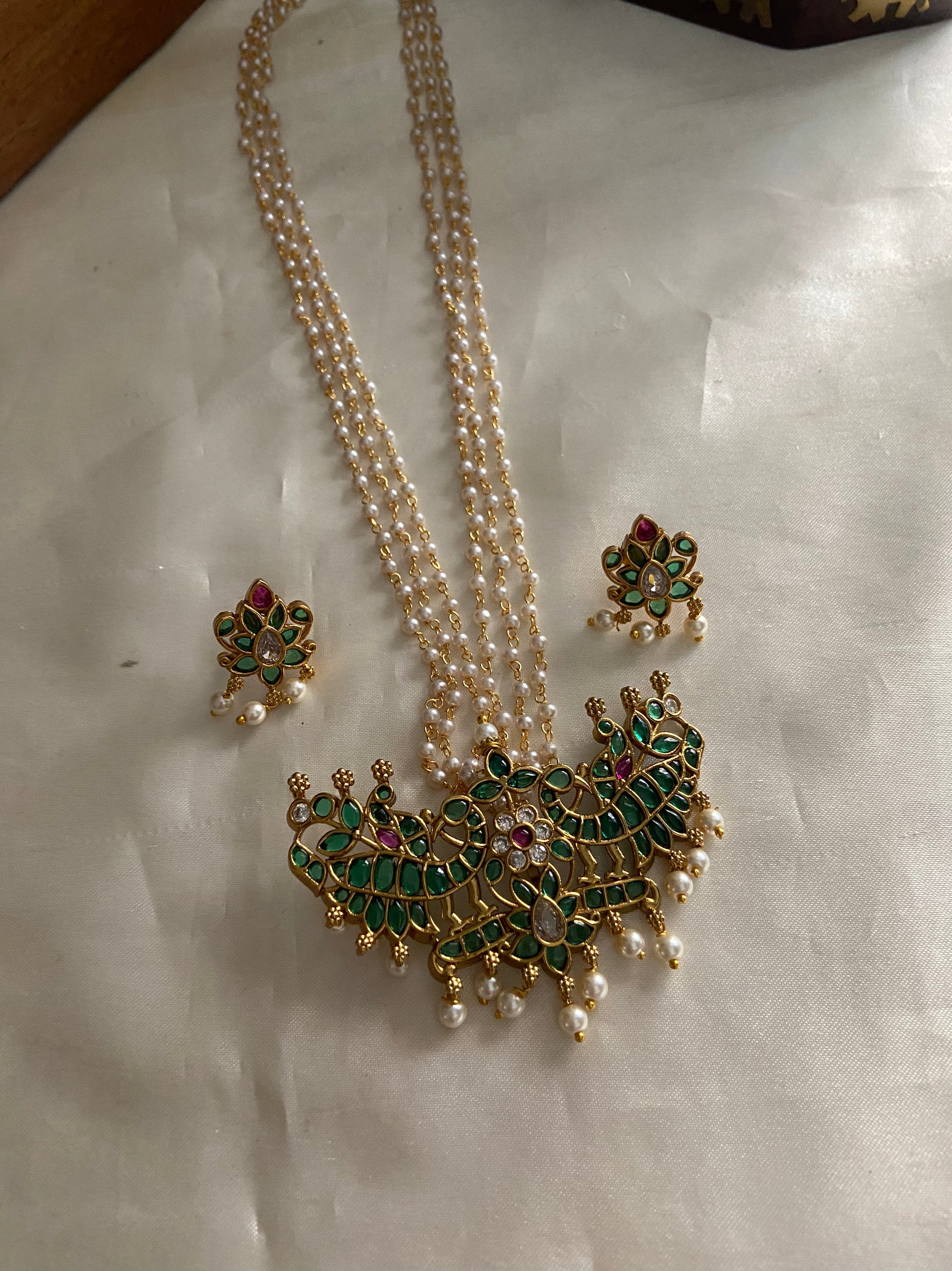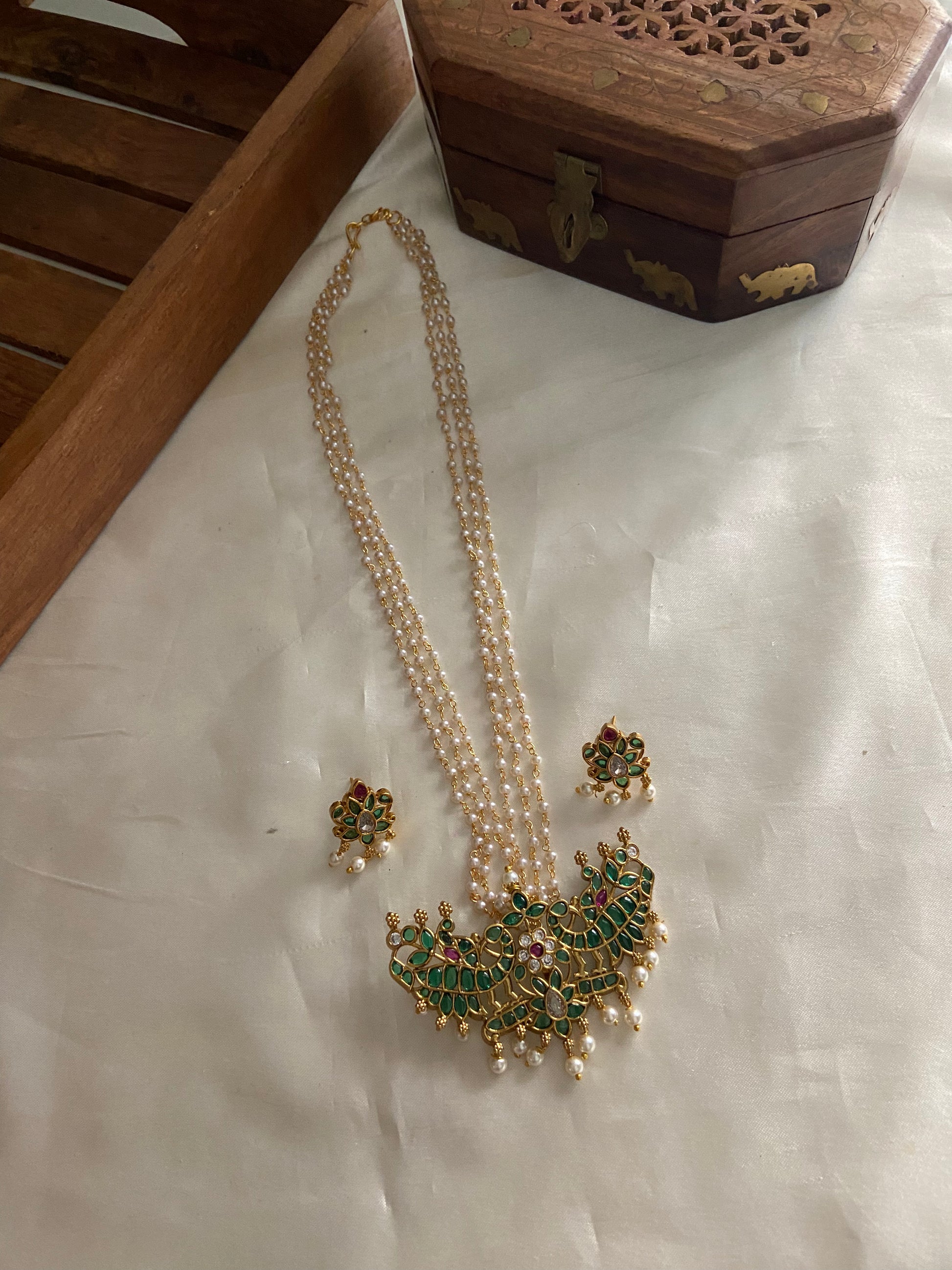 Enhance your style with our stunning Pearls chain with kemp pendant, paired perfectly with matching earrings. Crafted with high-quality stones & beads, this set combines timeless elegance with a modern touch. Ideal for special occasions or adding a touch of glamour to your look.