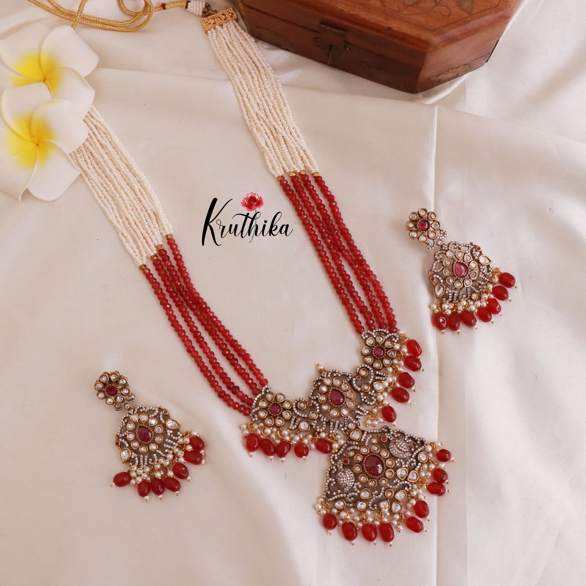 Enhance your style with our stunning Pearls victorian maroon beads Haaram, paired perfectly with matching earrings. Crafted with high-quality stones & beads, this set combines timeless elegance with a modern touch. Ideal for special occasions or adding a touch of glamour to your look.