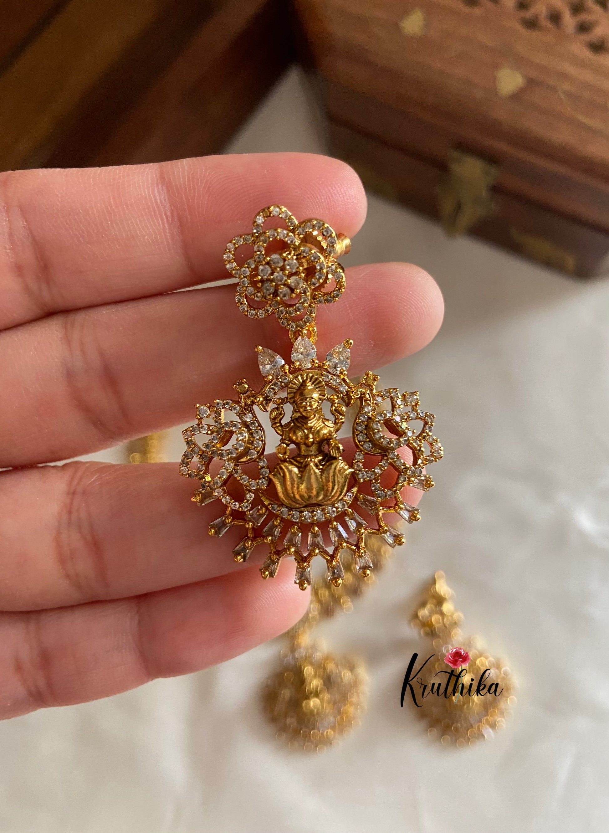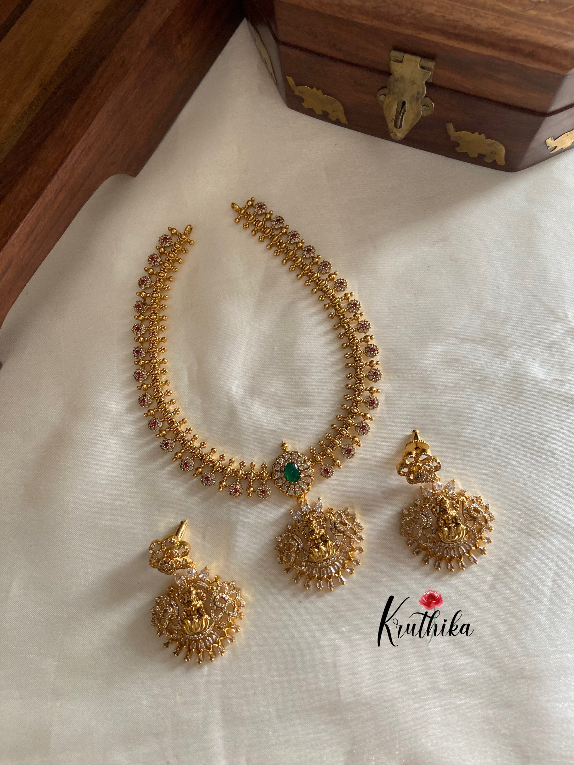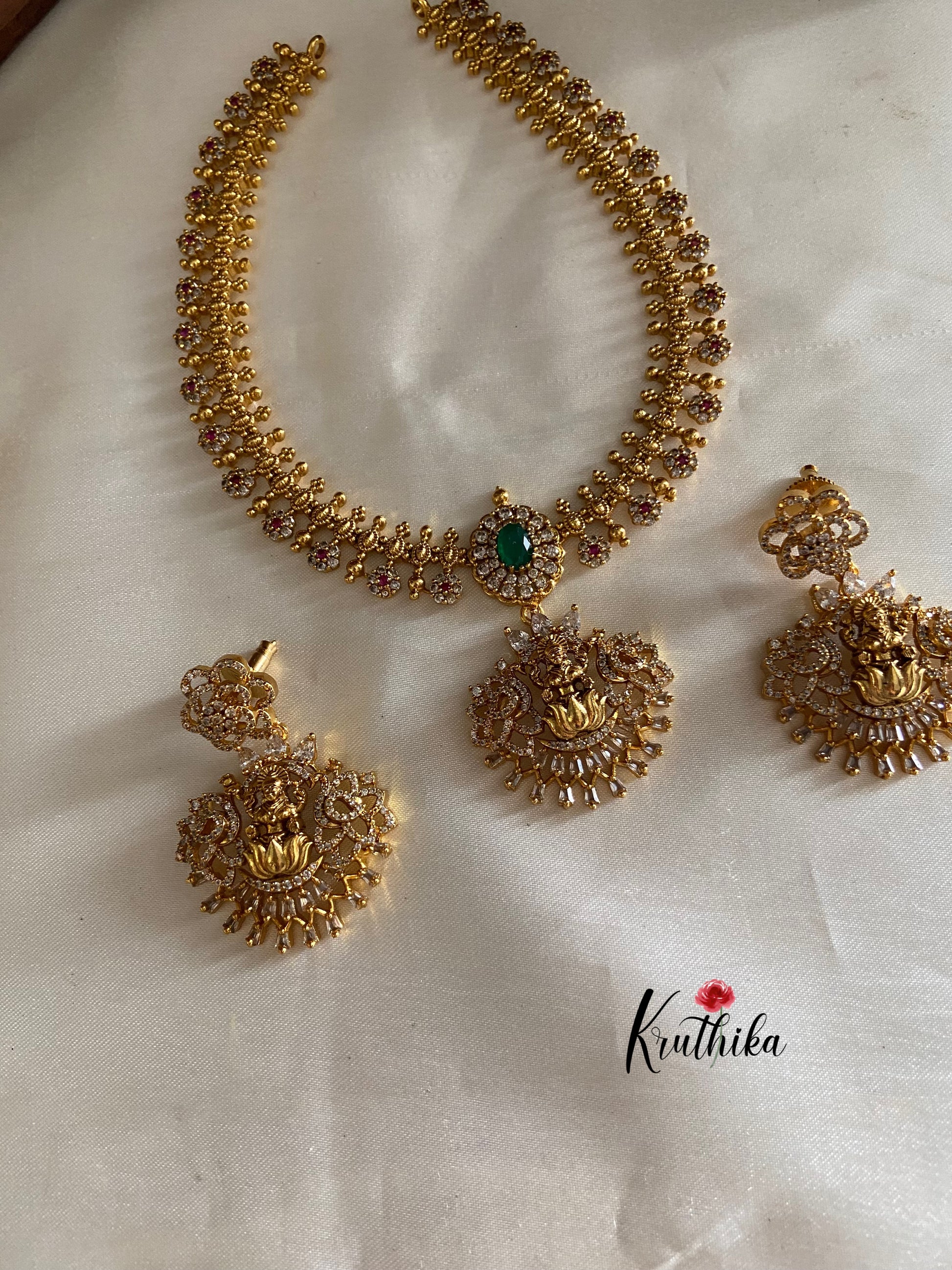 Enhance your style with our stunning Premium AD Lakshmi Roses necklace, paired perfectly with matching earrings. Crafted with high-quality stones & beads, this set combines timeless elegance with a modern touch. Ideal for special occasions or adding a touch of glamour to your look.